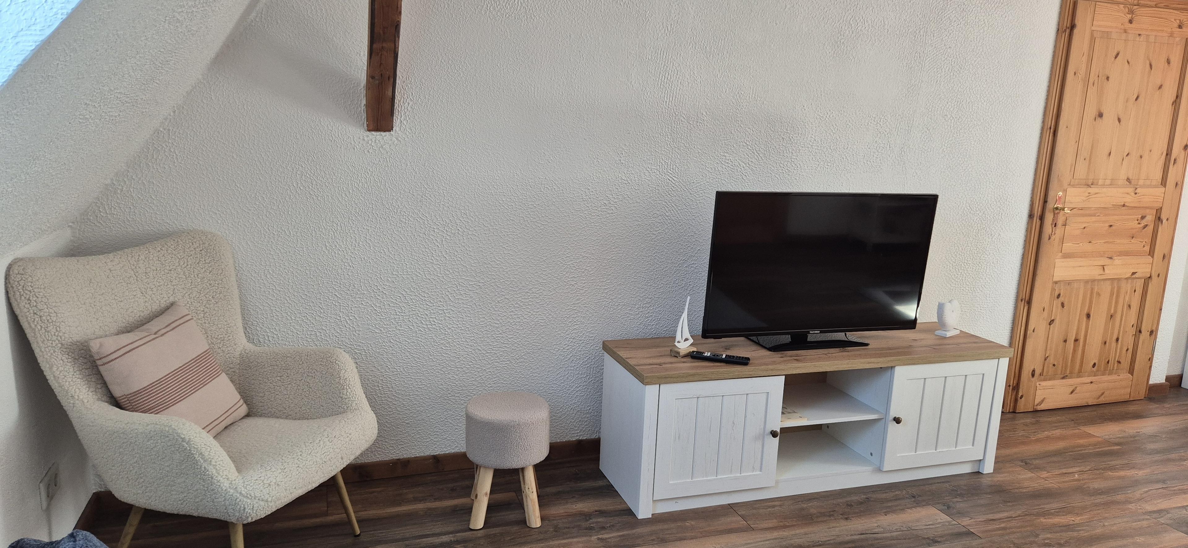 Die Wohnung betreten Sie über die wunderbare Holztreppe. In der Wohnung ist im vorderen Bereich das große Schlafzimmer mit dem KingSize Bett und dem daran anschliessenden Badezimmer. Die Holzbalkendecke gibt dem Raum eine gemütliche Atmosphäre. Im Bett liegend sehen Sie durch das Dachfenster unseren wunderbaren Sternenhimmel.