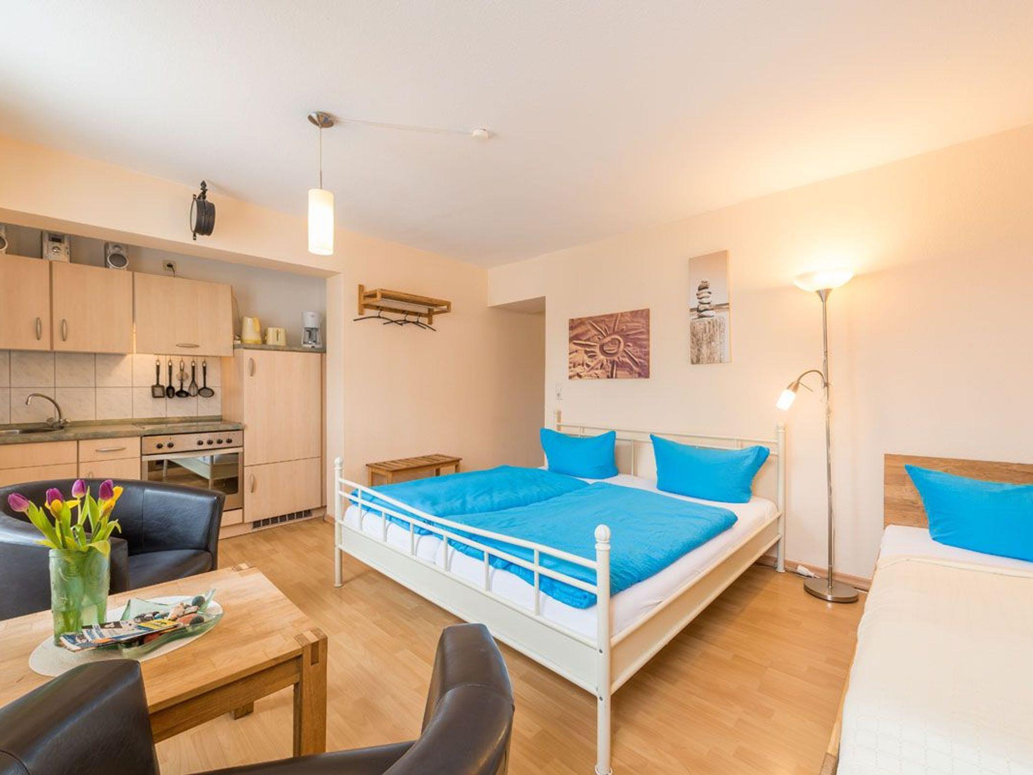 Unser Ferienzimmer IV befindet sich im zweiten Obergeschoss, ist ca. 30 qm groß und maritim eingerichtet. Es verfügt über einen kleinen Vorraum mit Esstisch, ein komfortabel, mediteran eingerichetes Wohn- und Schlafzimmer mit einem zwei Meter breiten Bett und einem Einzelbett (0,90 x 2 m), einer kleiner Küchenzeile sowie ein sehr schönes, größeres Bad mit Badewanne, WC und Fön.