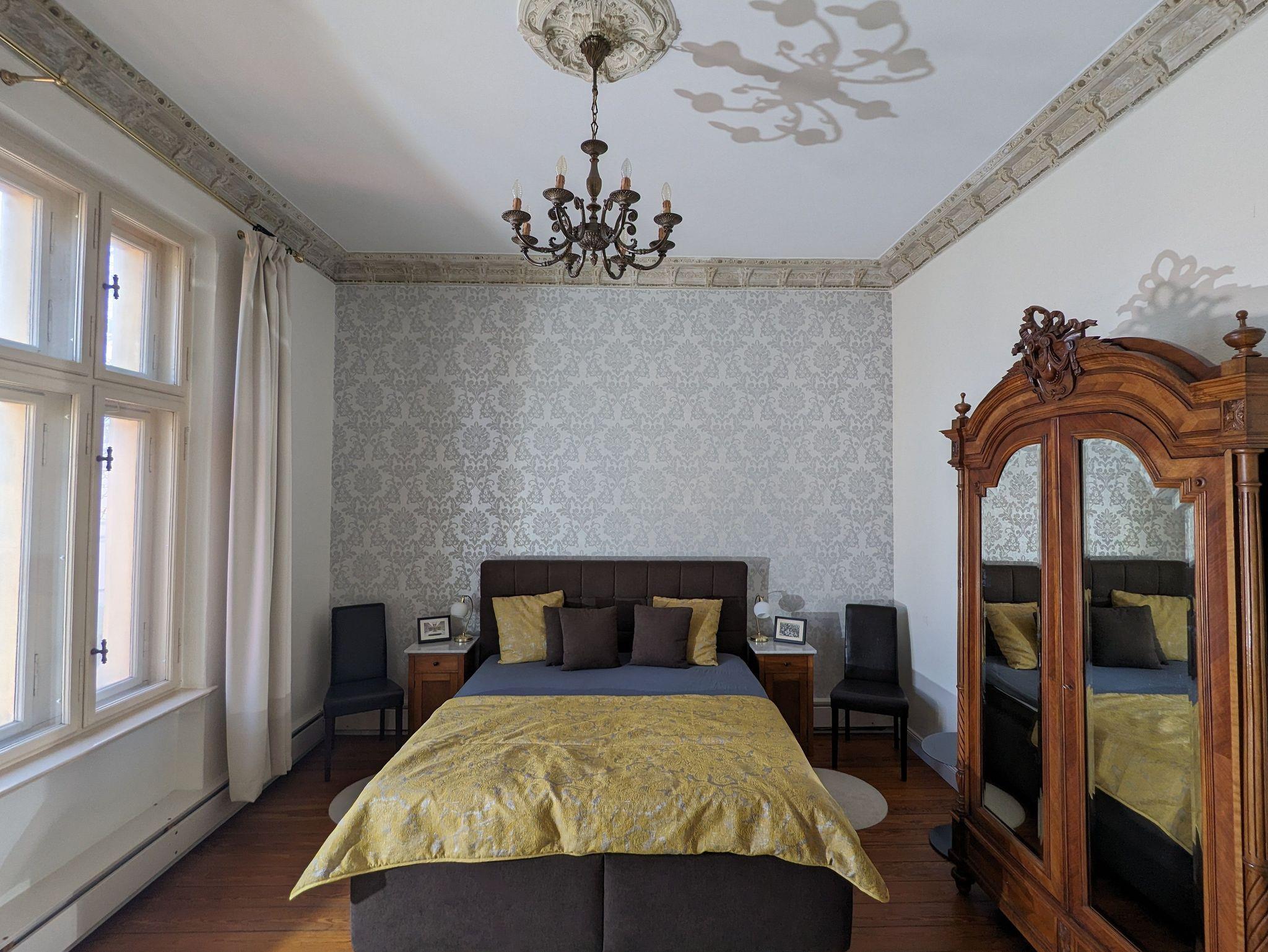 Unsere Ferienwohnung im 1. OG ist 80 qm groß und verfügt über ein Wohnzimmer mit Küchenzeile, zwei Schlafzimmer, Bad mit Badewanne und Flur. Alle Zimmer haben Dielenboden und originale Stuckdecken.
