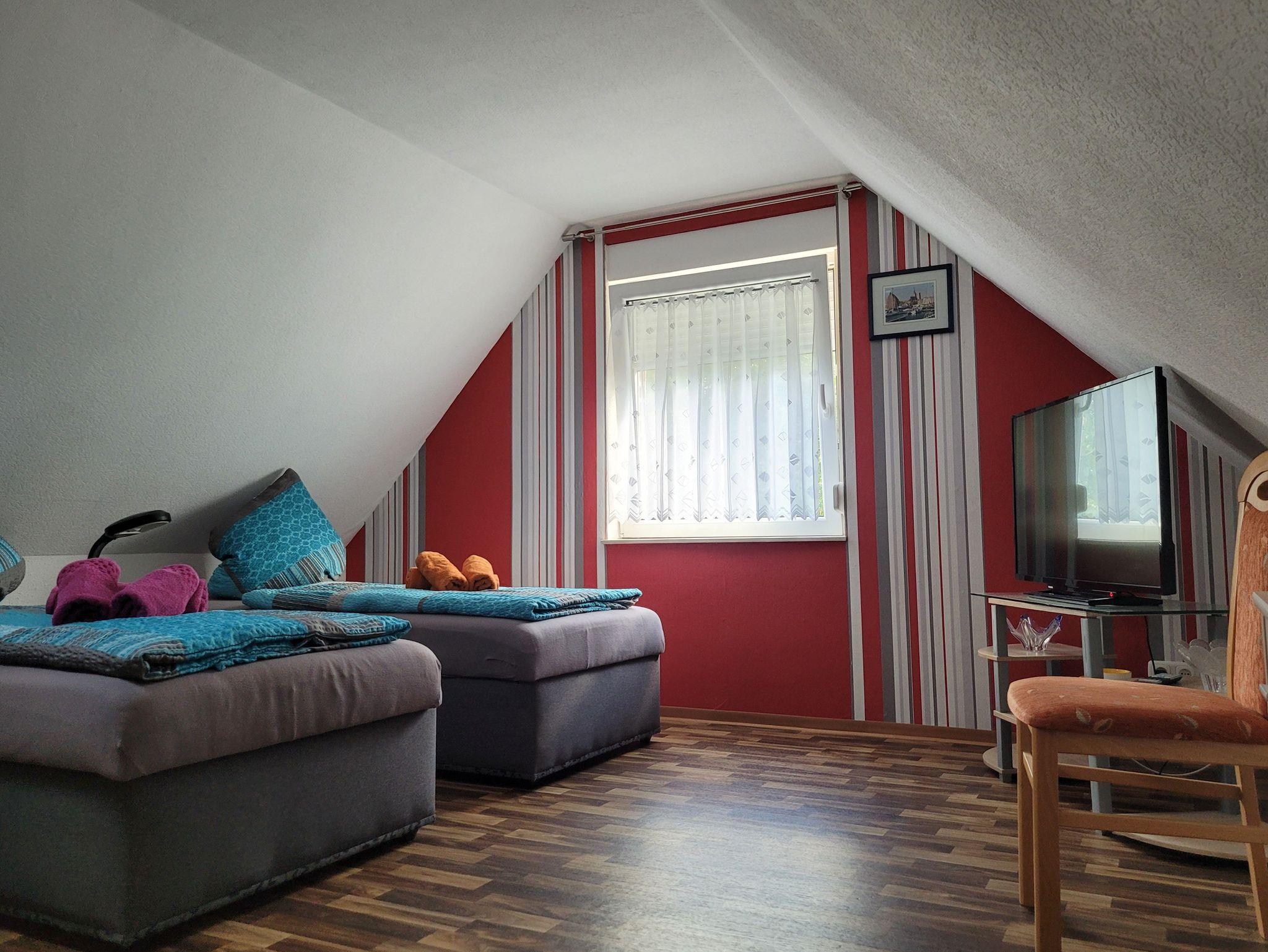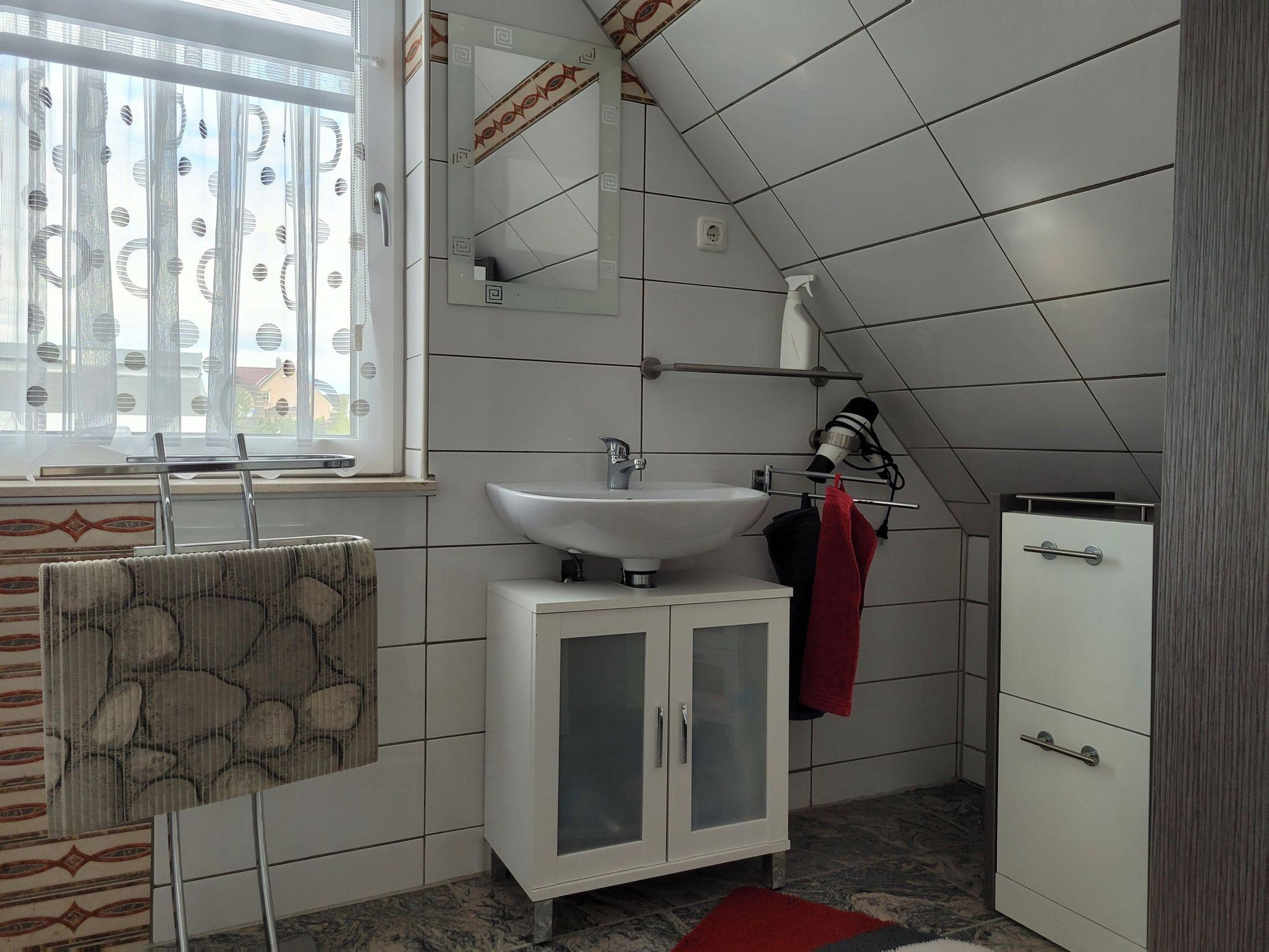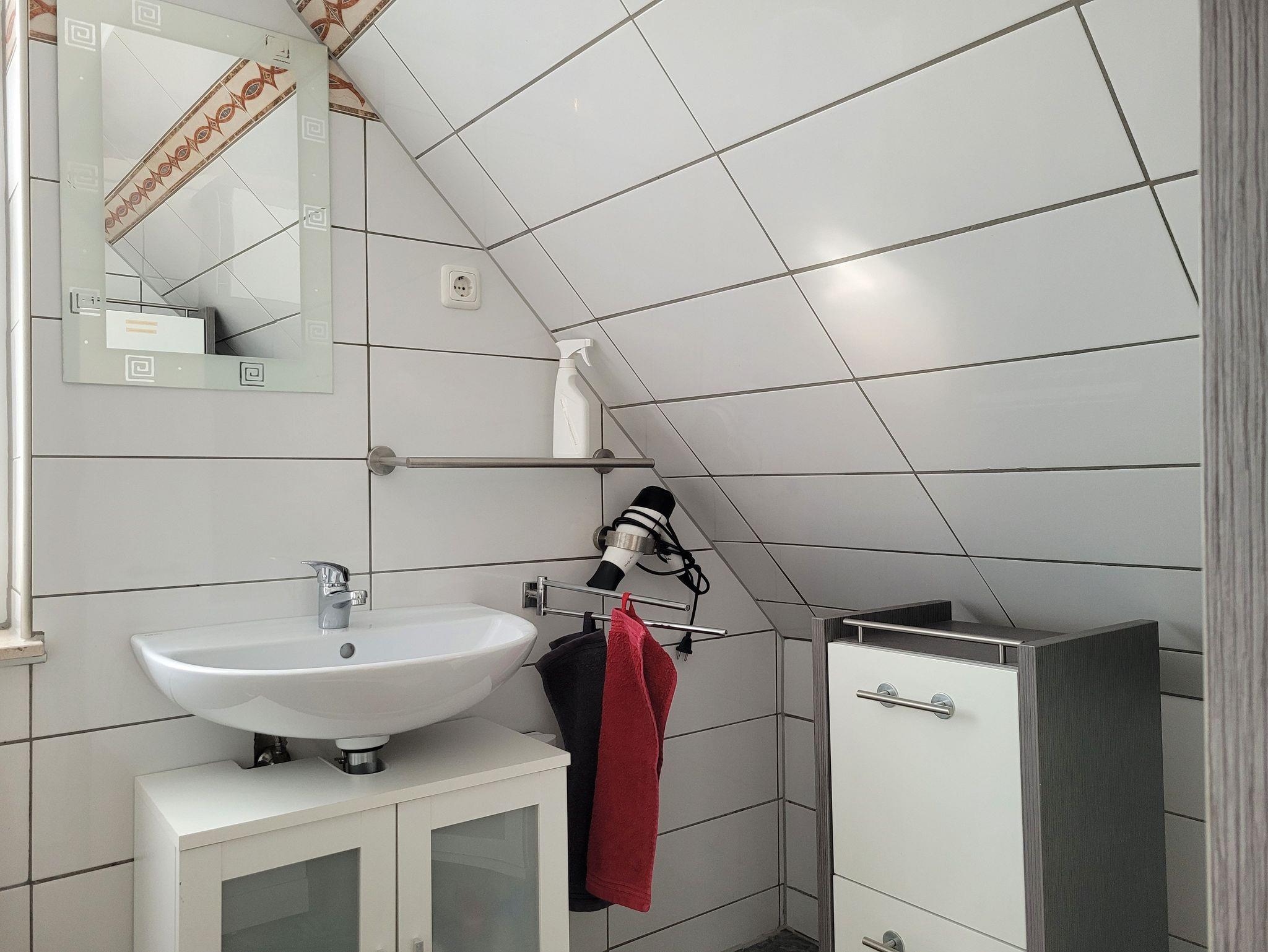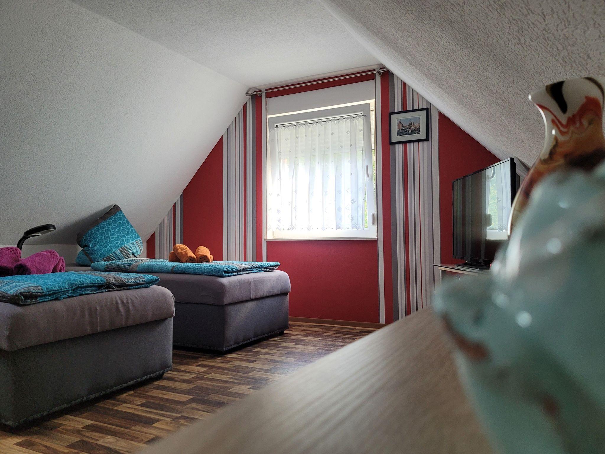 Die ca. 50qm Wohnfläche erstreckt sich über 2 Etagen. Im Obergeschoß (Treppe) befindet sich der Wohnschlafraum mit 2 einzelnen Betten, einer Schlafcouch (3. Person), einem Kleiderschrank, einem Fernseher sowie das Badezimmer (Dusche/WC). Im Untergeschoss befindet sich die voll ausgestattete Küche mit Essbereich.