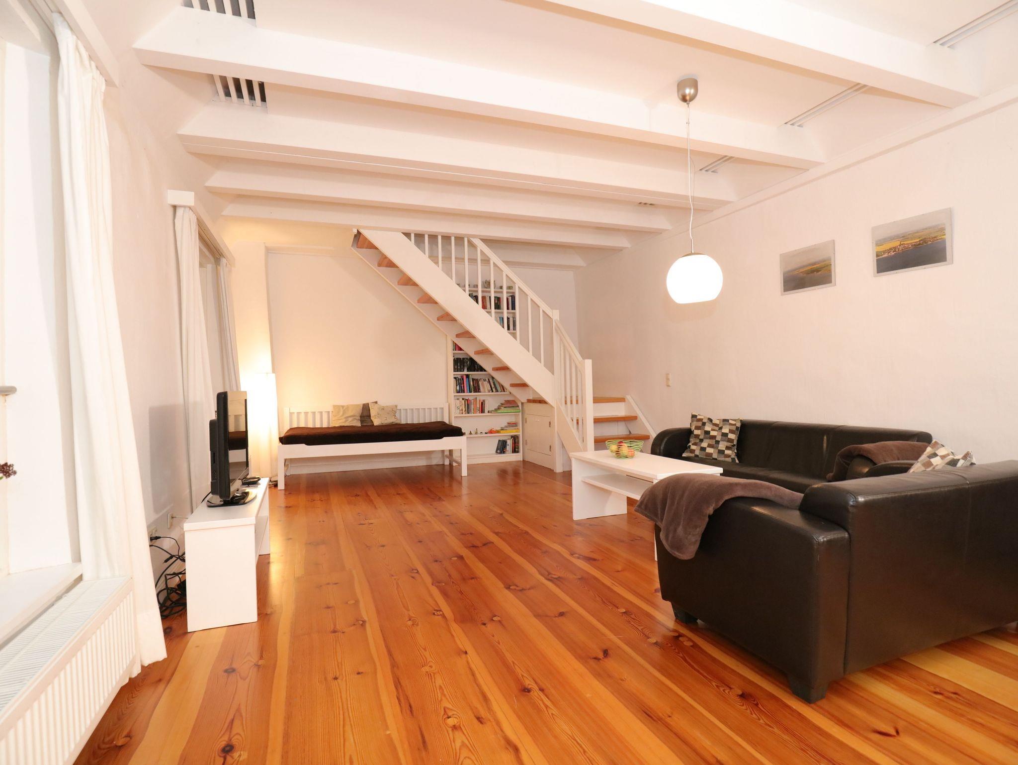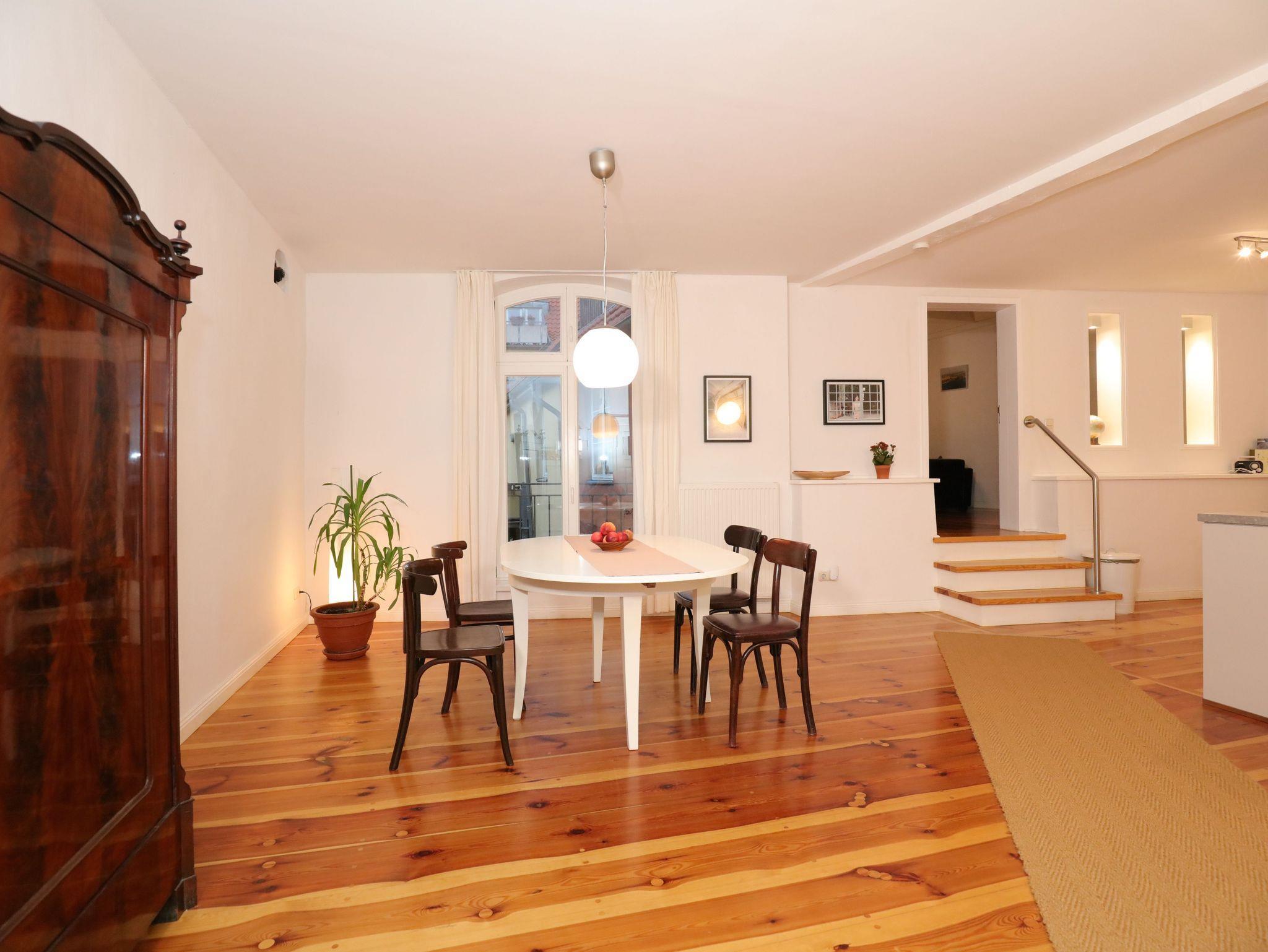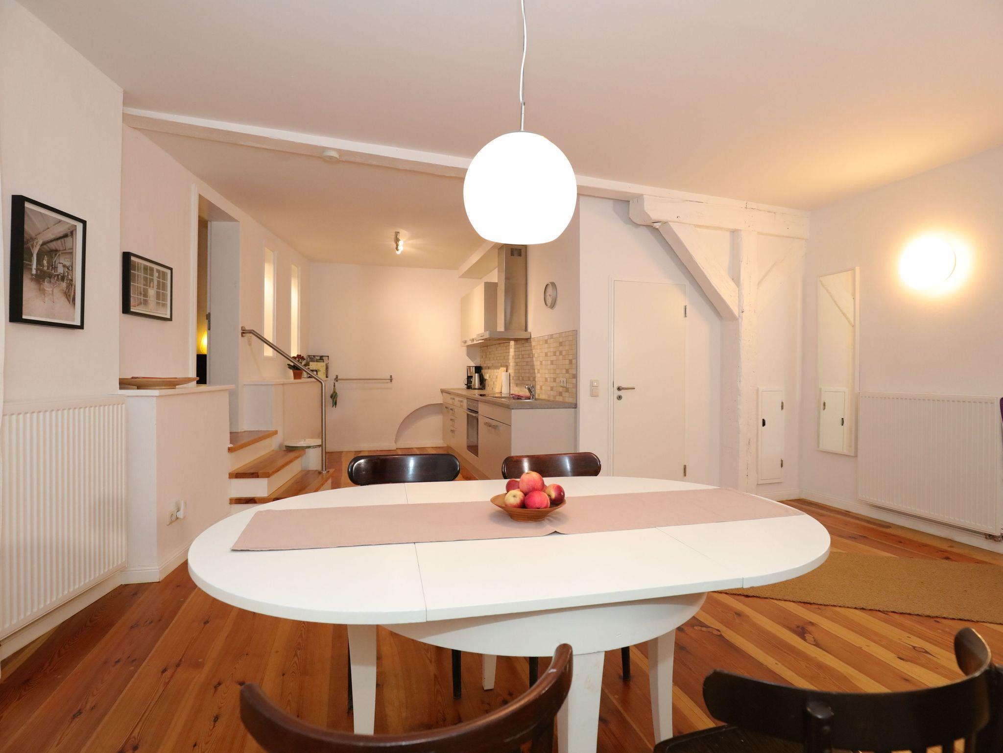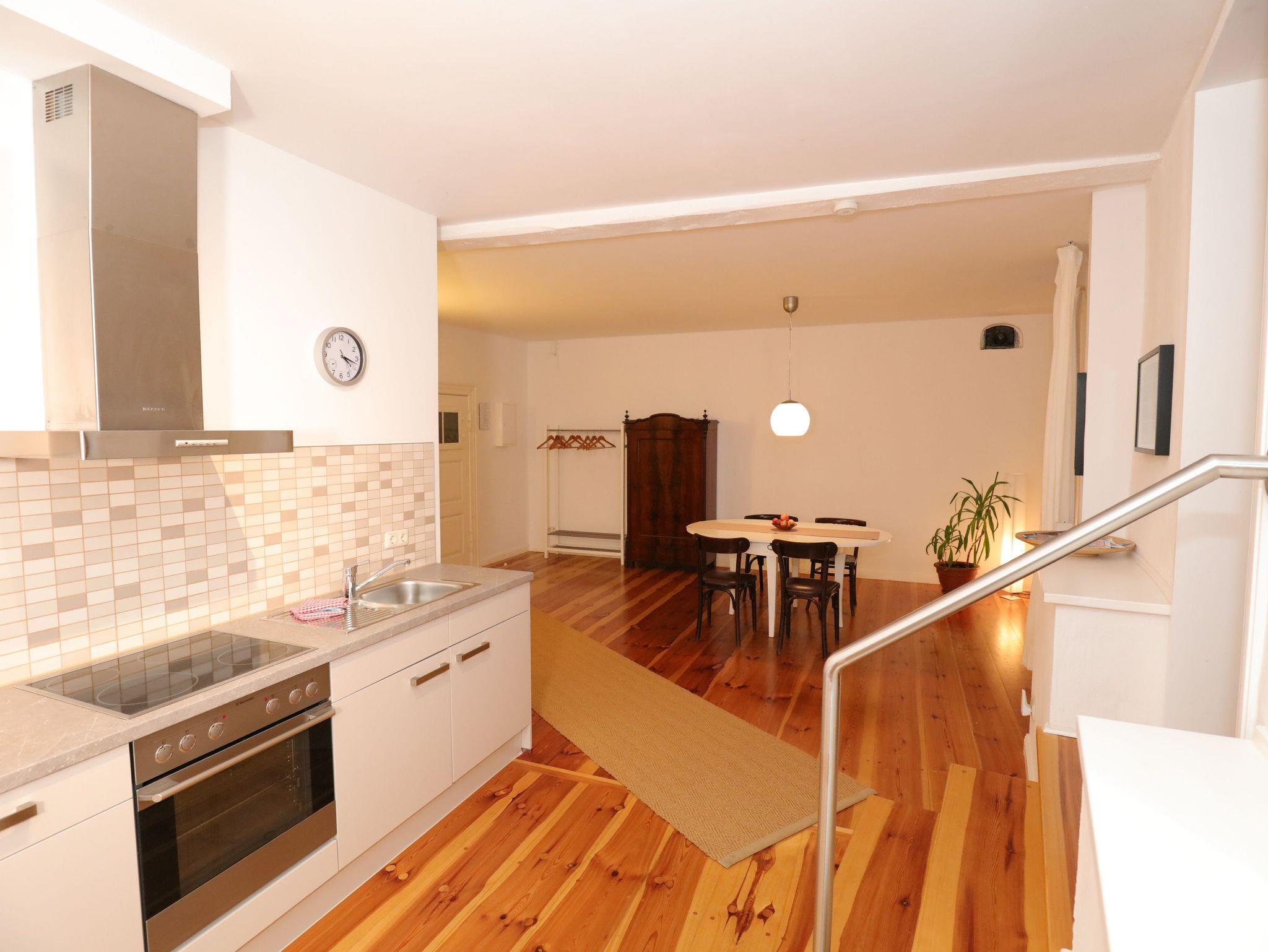 Die Ferienwohnung befindet sich im 1. OG des historischen Speichergebäudes. Sie finden dort eine offene Küche mit Esszimmer und Blick in den grünen Innenhof. Die Küche ist mit Elektroherd/ Ceranfeld, Backofen, Spülmaschine, Kühlschrank mit Eisfach, Kaffeemaschine, Wasserkocher und weiteren diversen Küchengeräten bestückt. Im geräumige Wohnzimmer stehen 2 gemütliche Ledersofas mit Kissen und Decken, sowie ein Couchtisch. Zusätzlich finden Sie hier ein Bücherregal mit einer Auswahl interessanter Urlaubslektüre und eine Spät-Biedermeier-Kommode. Außerdem ist im Wohnzimmer der Flachbildfernseher mit Satelliten-Empfang und ein DVDPlayer mit DVD Sammlung vorhanden. Hier finden sie noch ein zusätzliches Einzelbett.