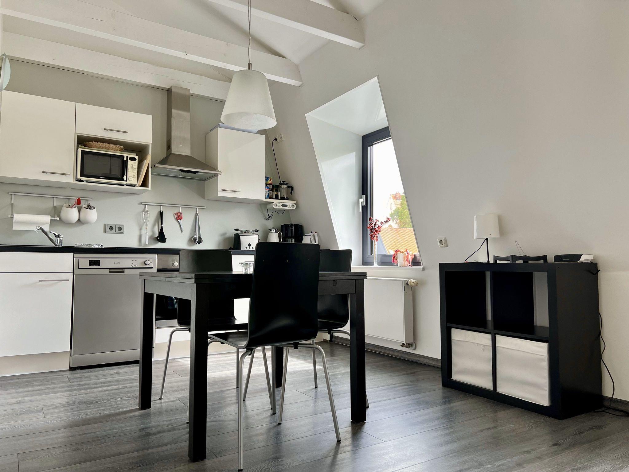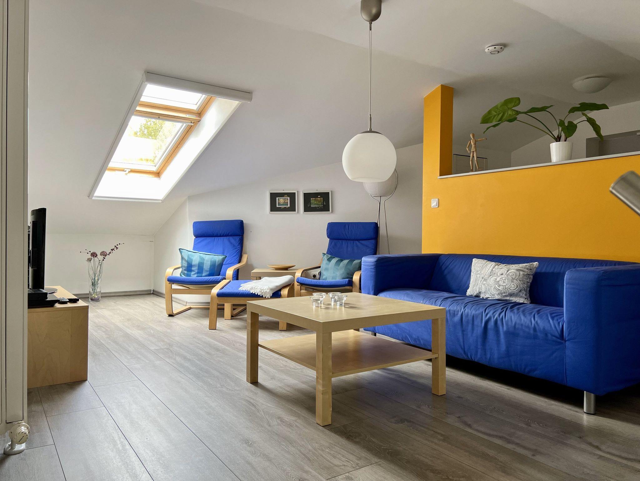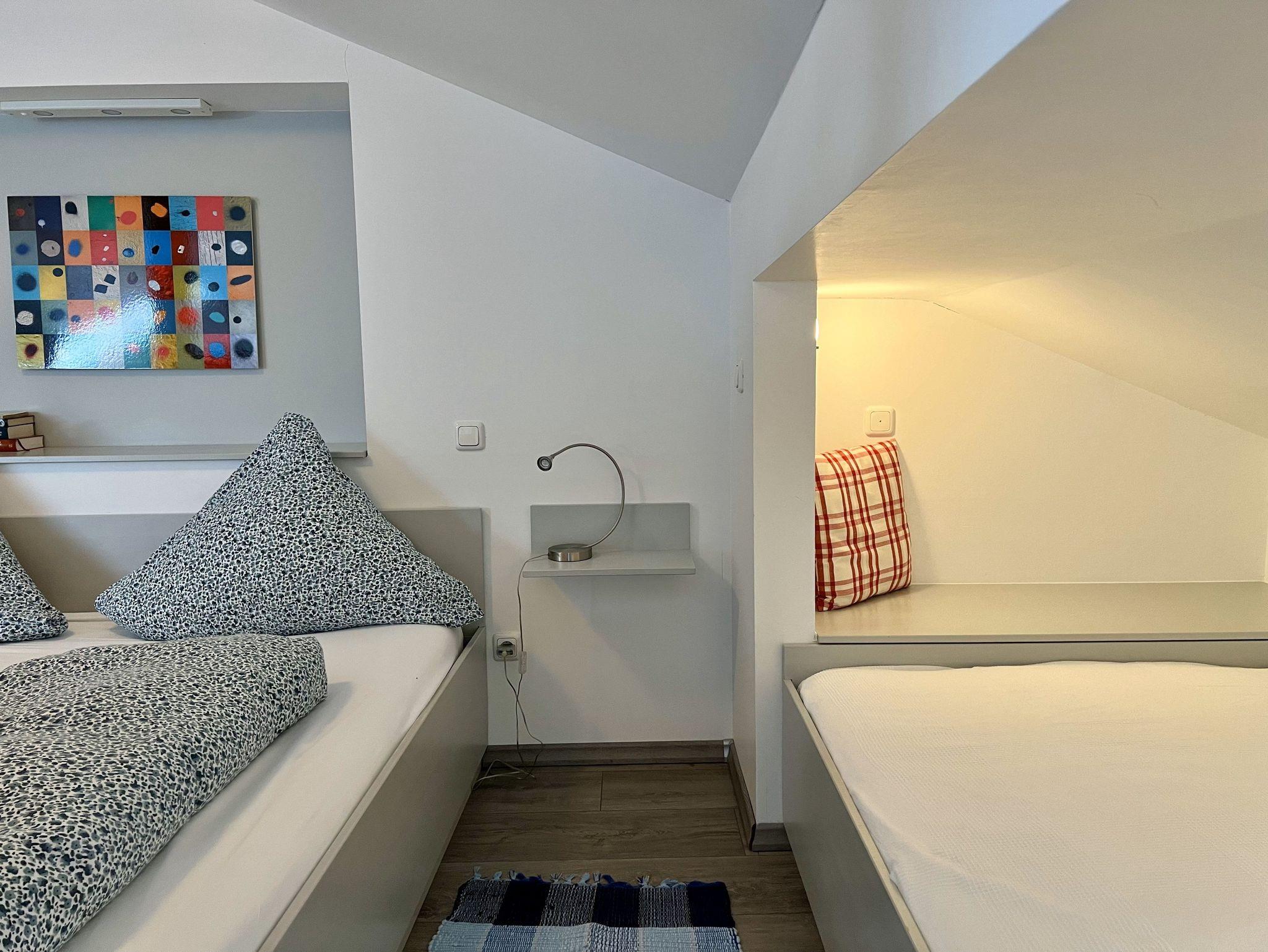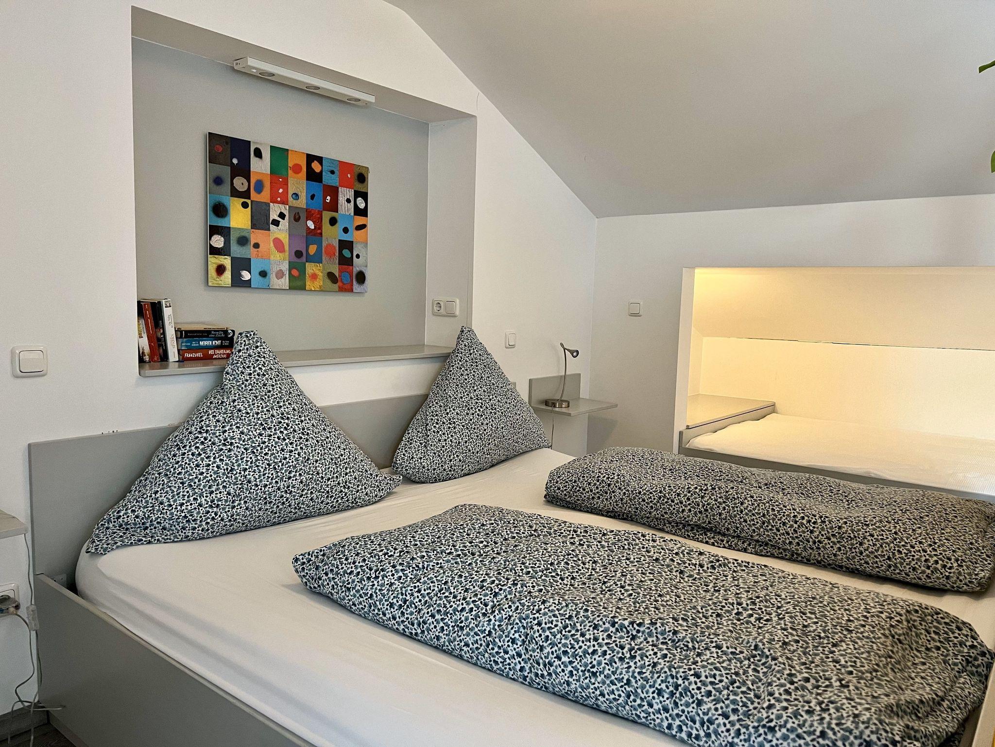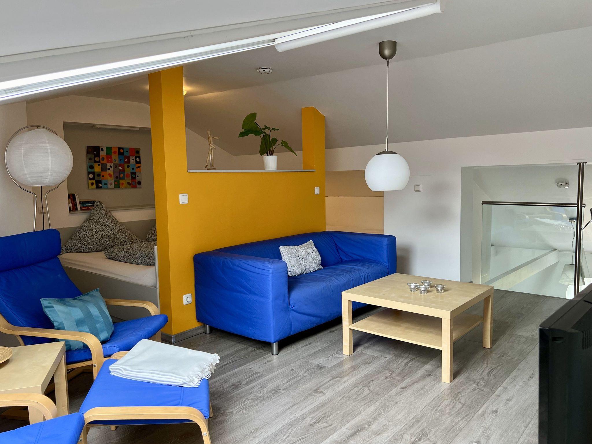 Die Maisonette-Wohnung ist 61 qm gross und bietet loftartig auf zwei Ebenen alles, was das Herz begehrt. Die Wohnung befindet sich im 2. Obergeschoss und ist über einen Fahrstuhl erreichbar. Im Eingangsbereich befinden sich die Küche und der Essraum sowie das Bad mit Du/WC. Im oberen Bereich liegt der kombinierte Wohn-/Schlafraum mit einem Doppelbett (200 x 200 cm) und zusätzlichem Alkovenbett, mit begehbarem Schrankraum sowie einem Sofa und Lehnstühlen zum Wohlfühlen. W-LAN kostenfrei.
