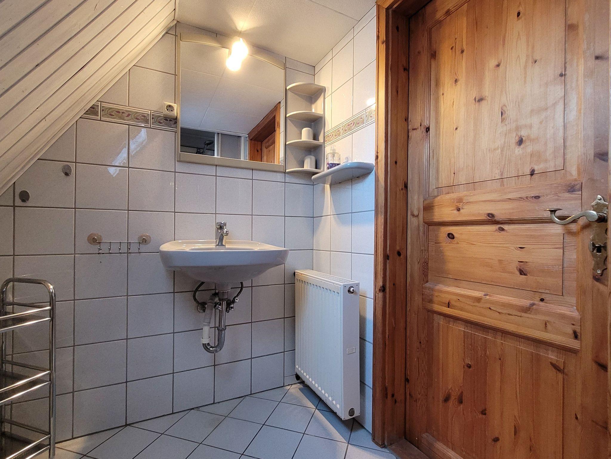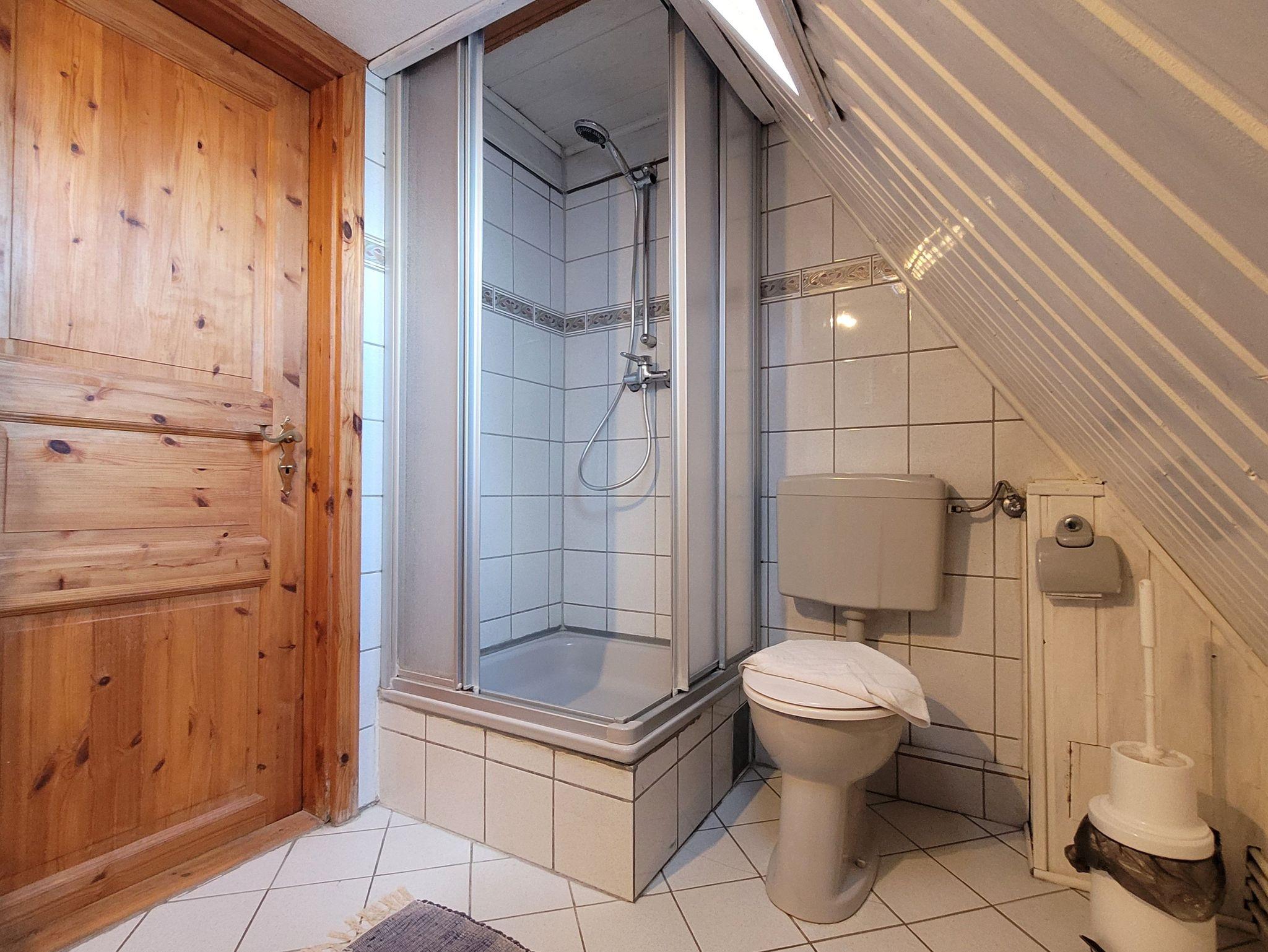 Das Bad ist mit einer Dusche und WC, Toilette und Waschbecken, Regal ausgestattet. Ein Dachfenster spendiert Tageslicht.