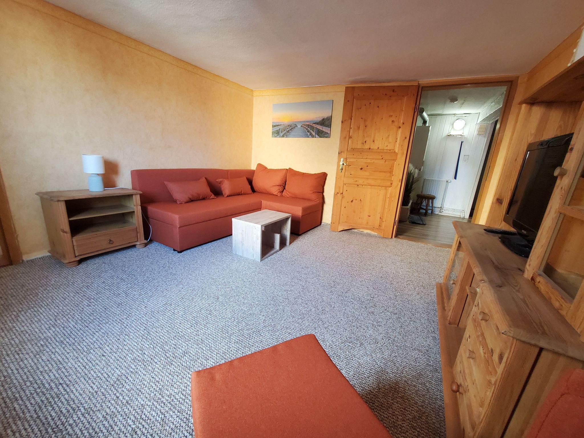 Das Schlafzimmer mit einem Doppelbett (1,60 x 2,00 m), einem Schrank als auch einem Sideboard und einem Sessel ist anheimelnd und gemütlich. Das Wohnzimmer hat eine zusätzliche Schlafcouch (1,30m x 200m) und einen großen HDTV-Fernseher, der Kabelanschluss hat.