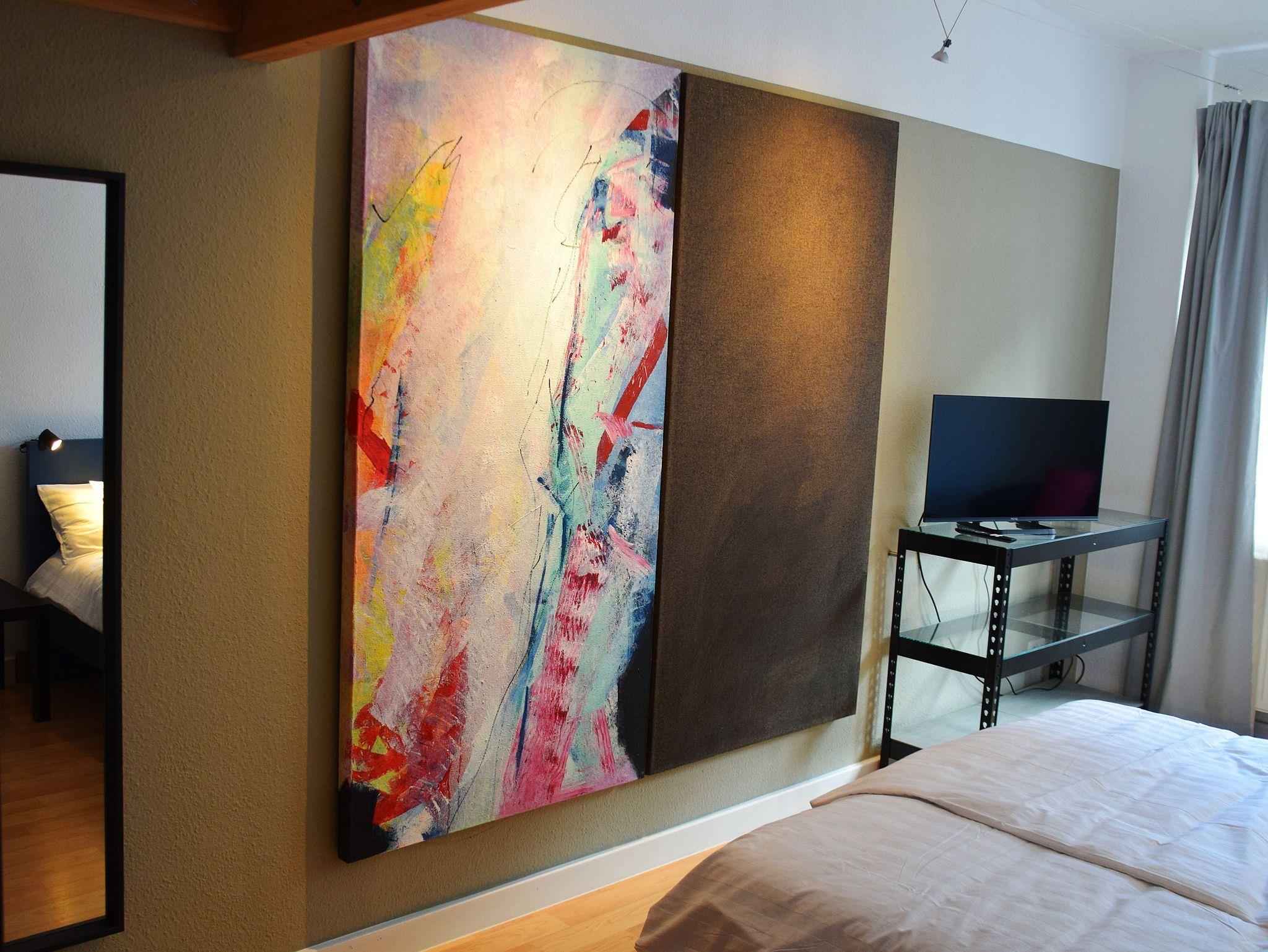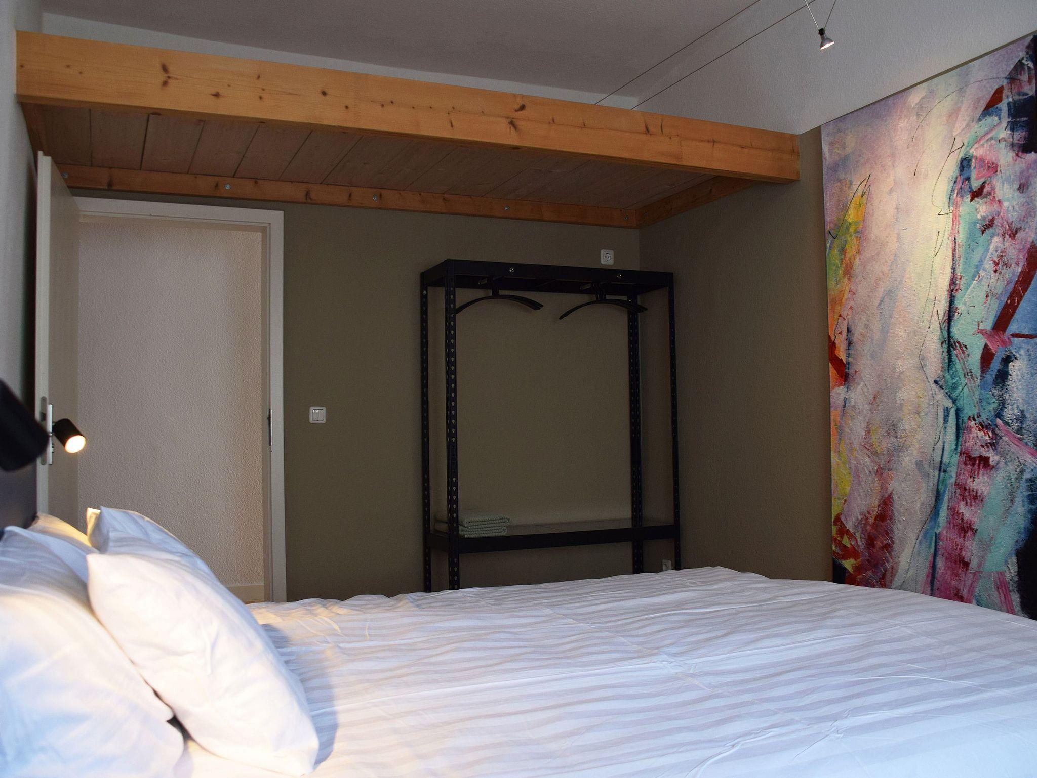Das Zimmer 4 befindet sich in der 3. Etage. Es ist mit einem Doppelbett (1,60 Meter Breite), einem Smart-TV, einer Sitzgelegenheit und einem Kleiderständer ausgestattet.