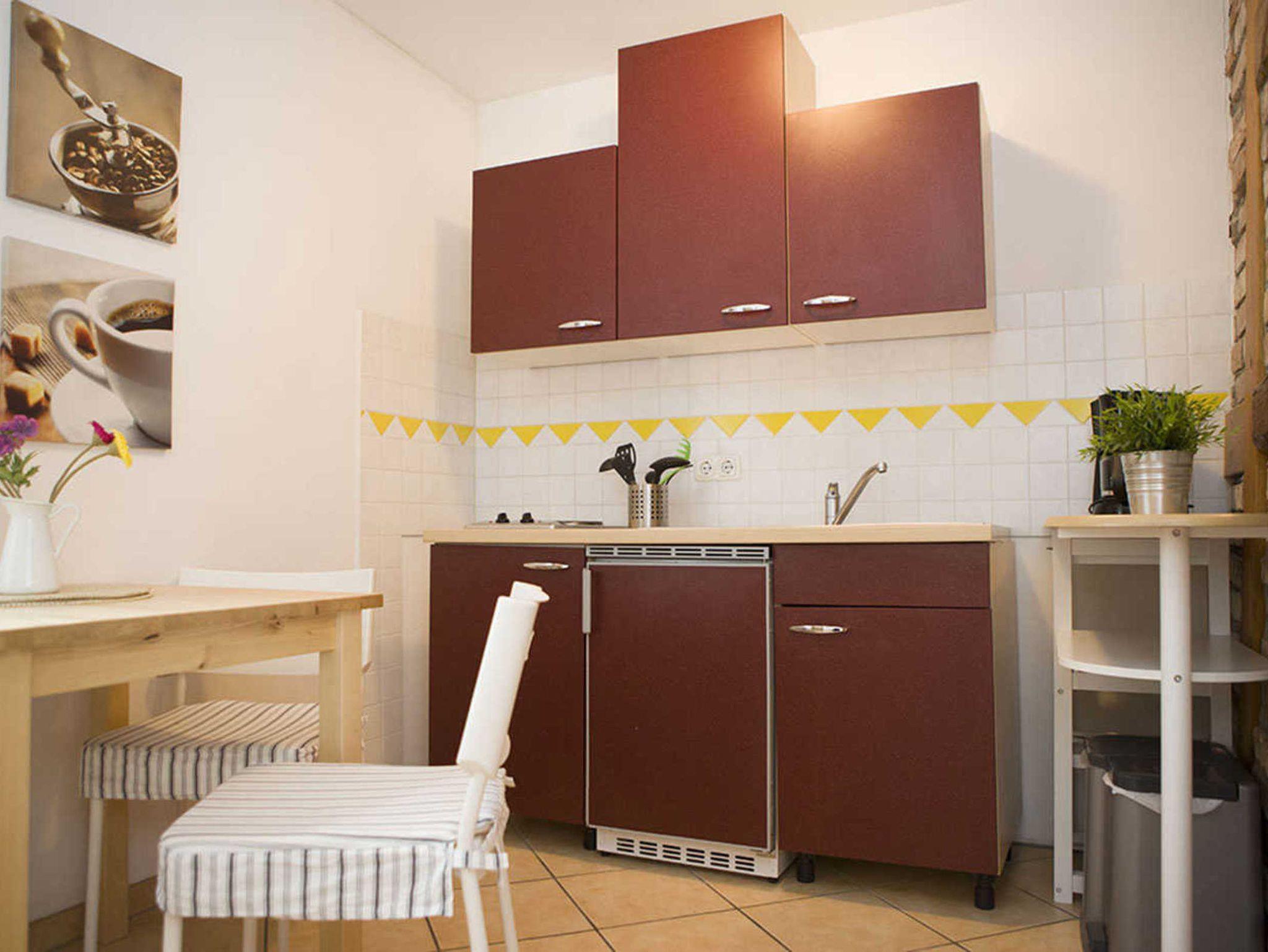 separate Küche mit Essbereich und EBK, Kühlschrank, E-Herd 2 Platten, Geschirr, Besteck,