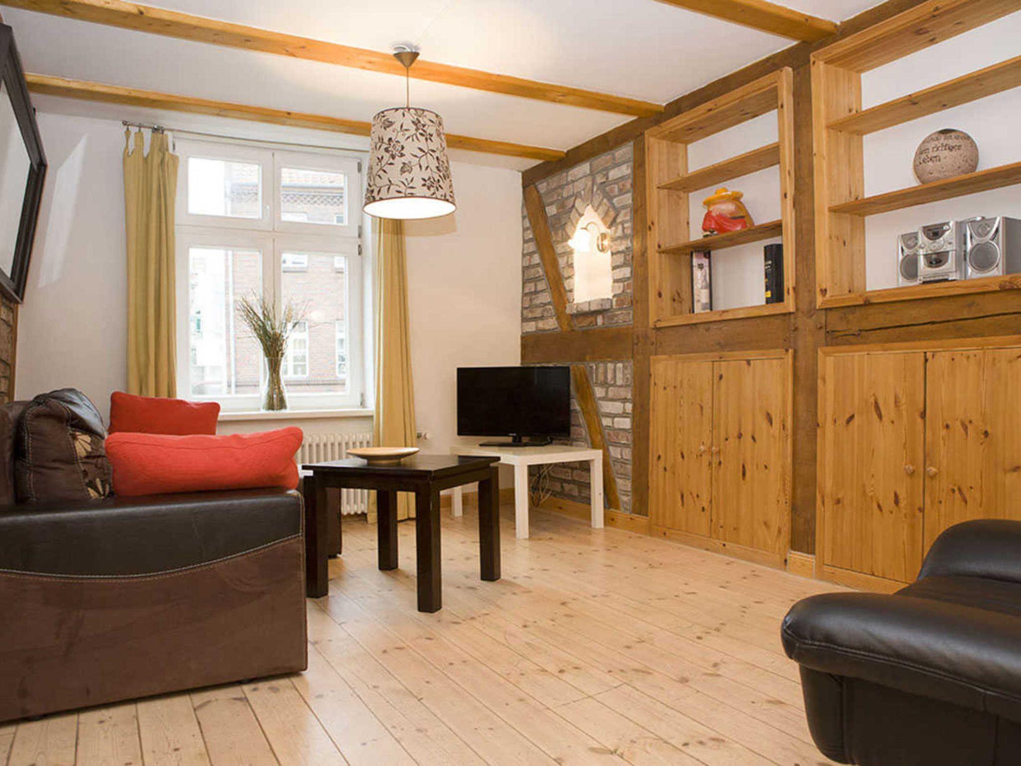 Unsere Ferienwohnung (ca. 45 m²) befindet sich in der Langenstr. 41a im 1. Obergeschoss in der Altstadt am Hafen. Sie verfügt über ein Wohnzimmer und ein extra Schlafzimmer mit Doppelbett. Die Aufbettung für die 3. und 4. Person befindet sich auf der Schlafcouch im Wohnzimmer. Das Bad ist gefliest mit Dusche und WC. Die separate Küche