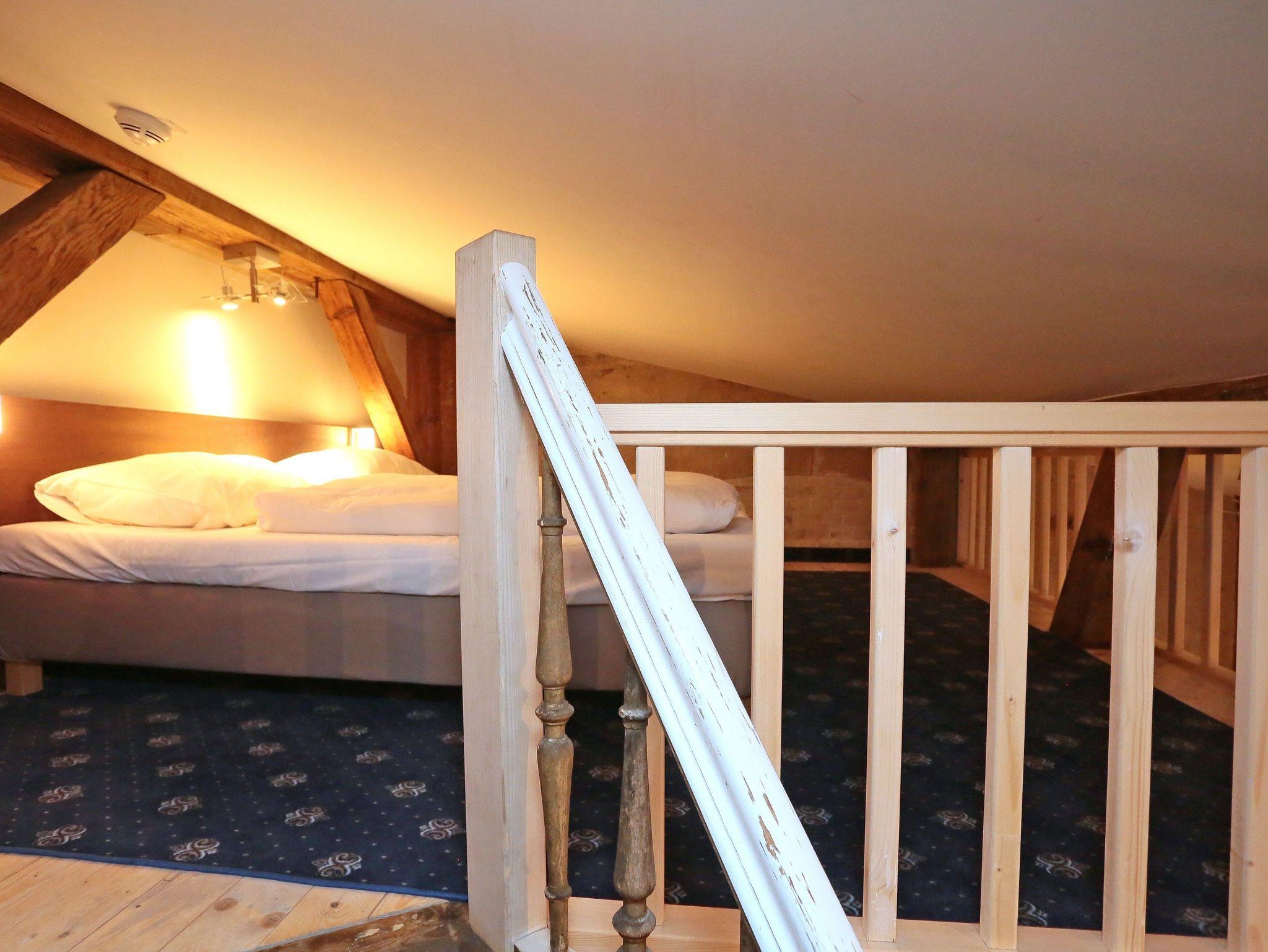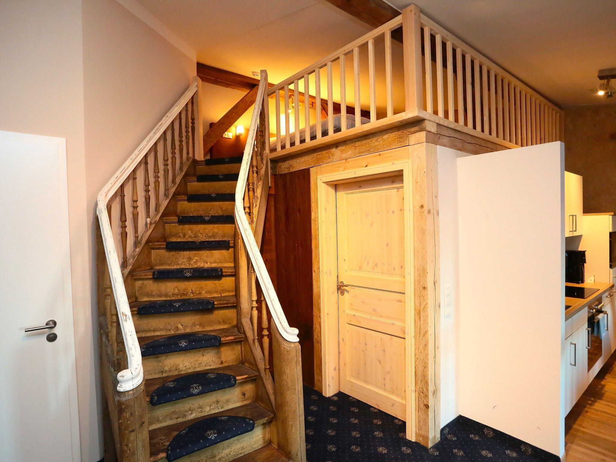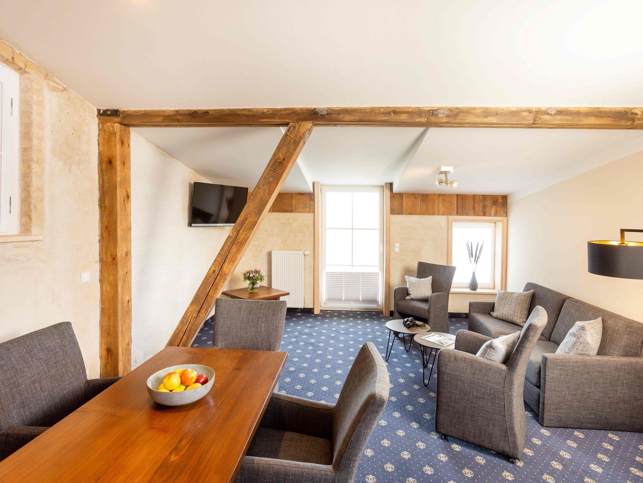 Unser 2-Raum-Apartment Superior befindet sich im 3. Obergeschoss. Es hat ein separates Schlafzimmer mit gemütlichem Boxspringbett. Das zweite Doppelbett erreichen Sie über eine historische Treppe, die auch eine Galerie führt (hier ist leider keine Stehhöhe vorhanden). Eine Möglichkeit zur Aufbettung ist mit einer gemütlichen Schlafcouch im Wohnzimmer möglich. Es ist ebenso ein großer Essplatz, eine Küchenzeile und ein Badezimmer mit Dusche und WC vorhanden.