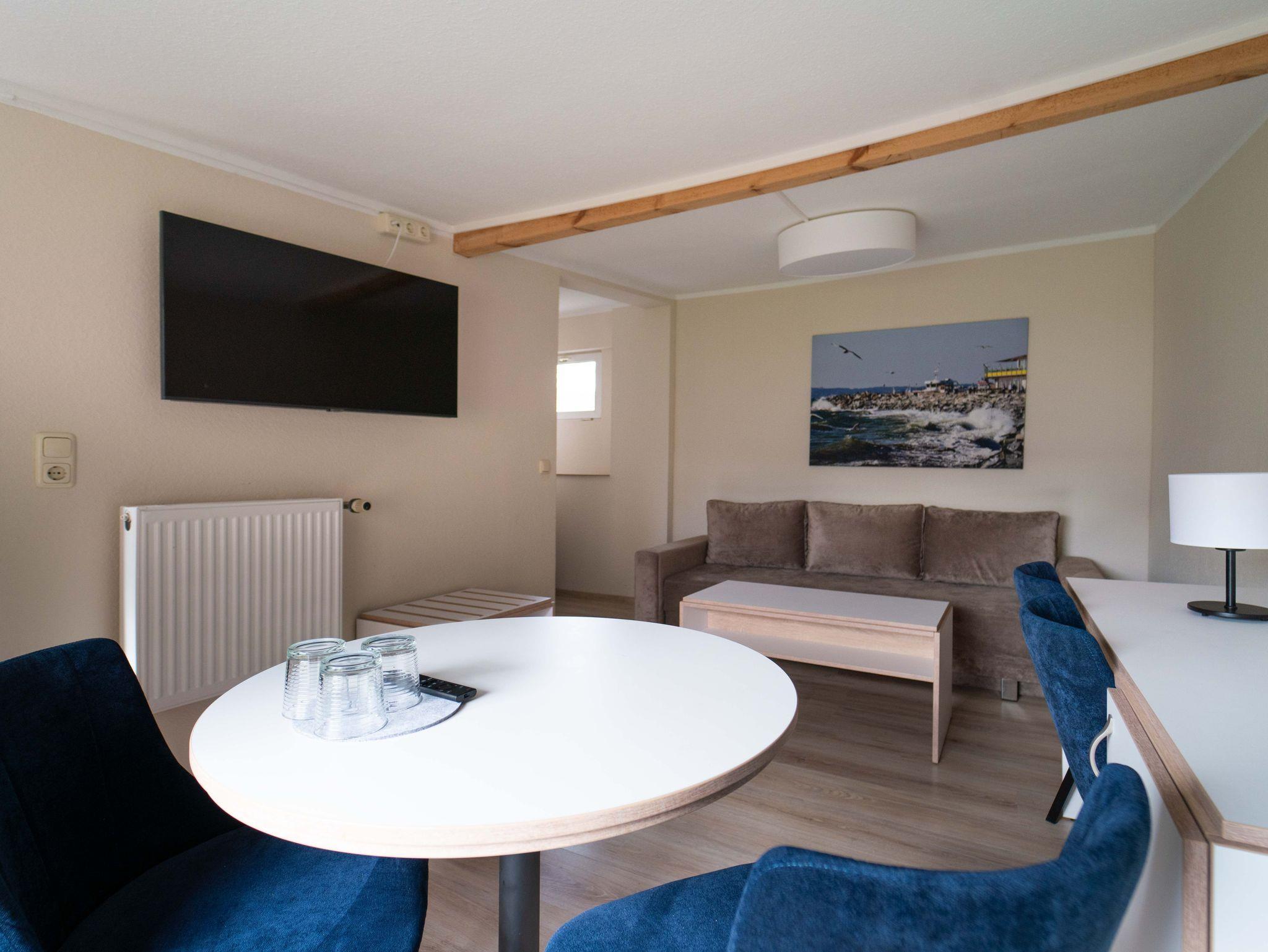 Erleben Sie den Komfort und die Großzügigkeit unseres geräumigen Apartment L! Mit ca. 45 qm bietet es Platz für bis zu drei Personen auf bequemen Einzelbetten (90×200 cm) in einem separaten Schlafzimmer sowie einem gemütlichen Schlafsofa im Wohnbereich. Genießen Sie die Privatsphäre von zwei getrennten Räumen, die ein Schlaf- und Wohnzimmer umfassen. Die voll ausgestattete Küchenzeile mit Kochfeld, Kühlschrank, Kaffeemaschine, Wasserkocher und Mikrowelle ermöglicht Ihnen die Zubereitung Ihrer Lieblingsgerichte. Geschirr und Besteck für zwei Personen runden die Ausstattung ab und machen Ihren Aufenthalt noch angenehmer.