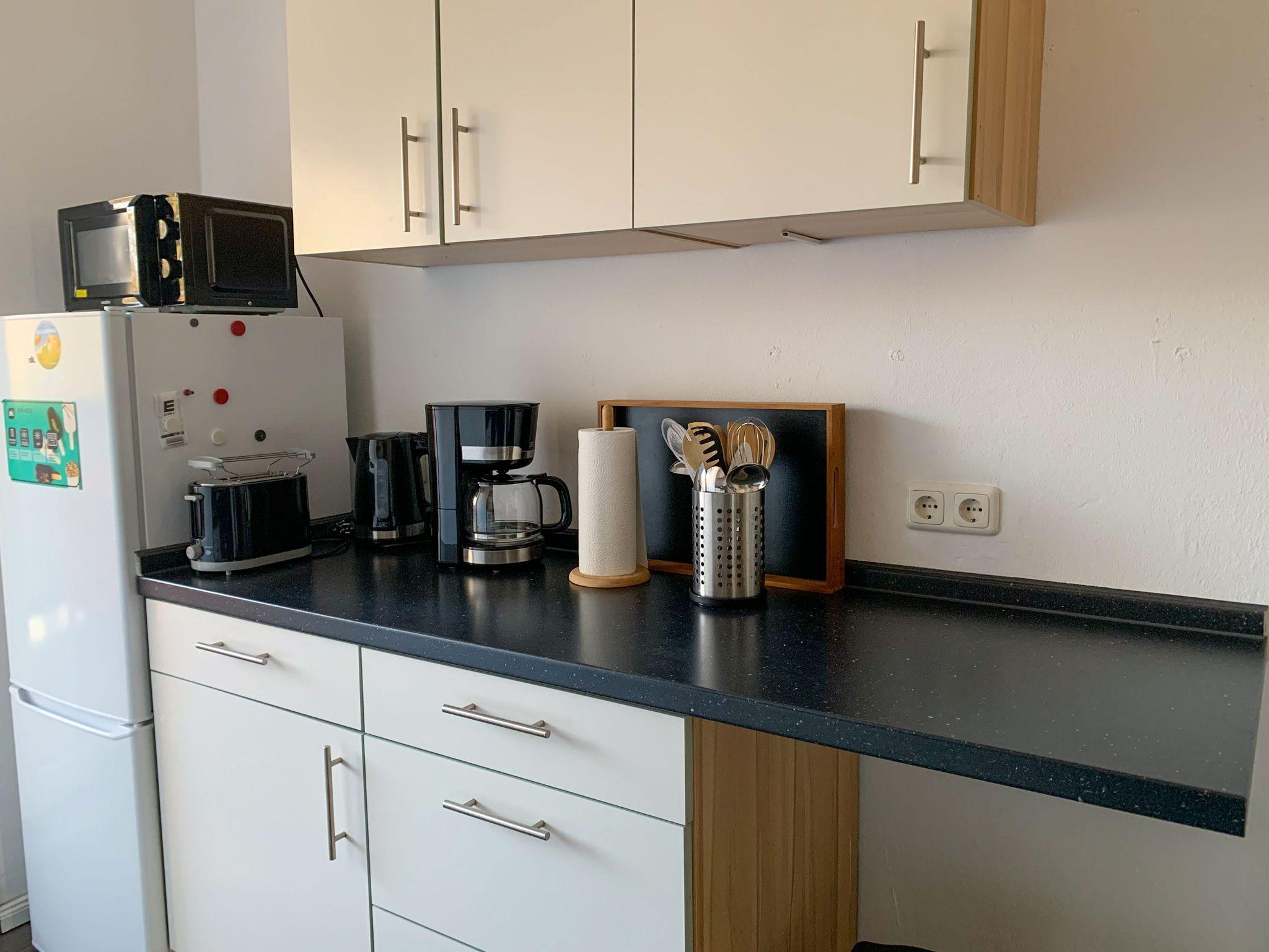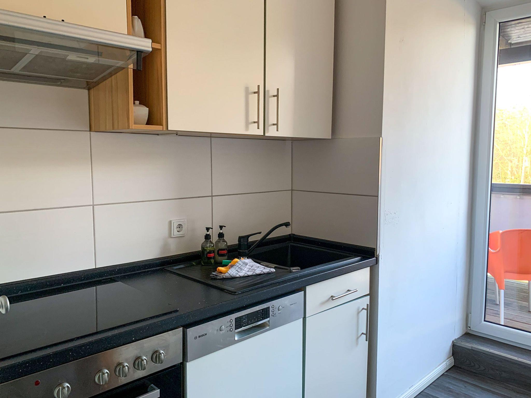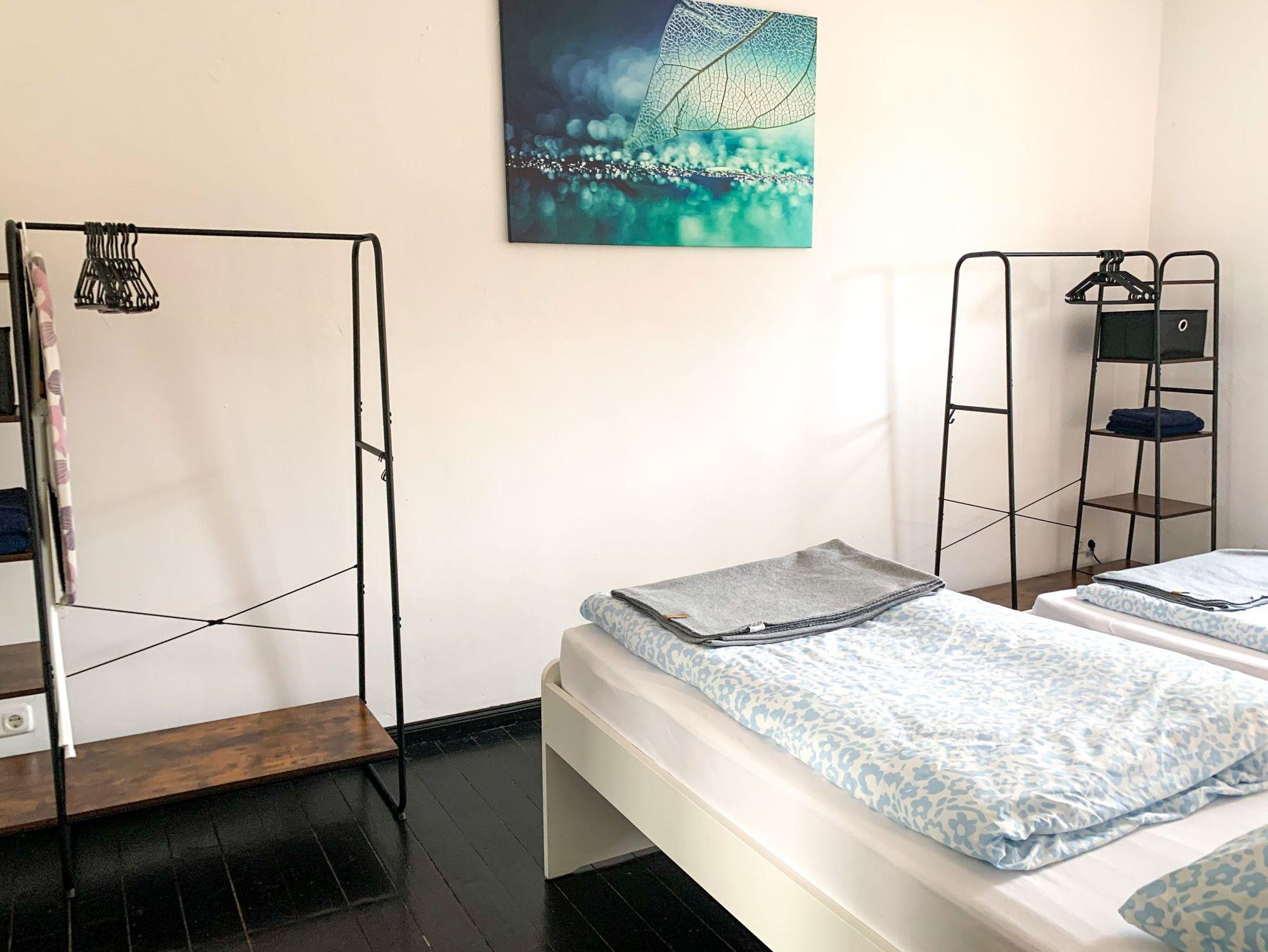 Dich erwarten zwei Schlafzimmer mit Einzelbetten, ein Wohnzimmer mit Sofa und TV sowie eine voll ausgestattete Küche. Von der Küche aus gelangst du auf den kleinen Balkon mit Blick in den Innenhof. Das Badezimmer ist mit einer Dusche ausgestattet.
