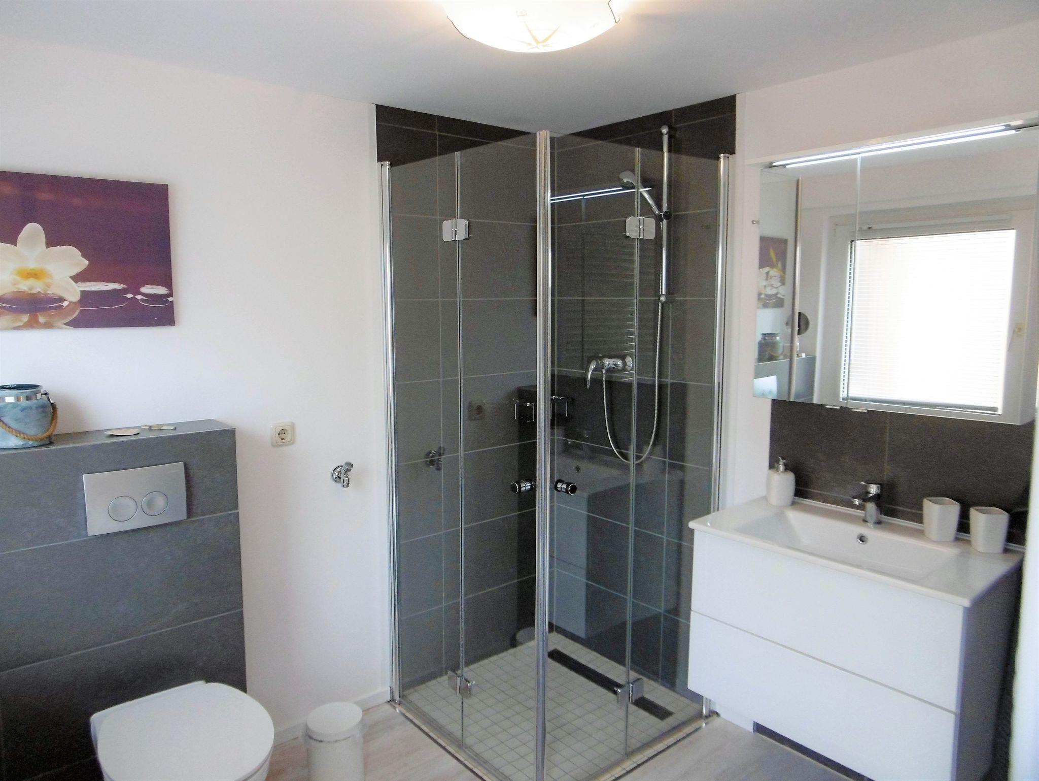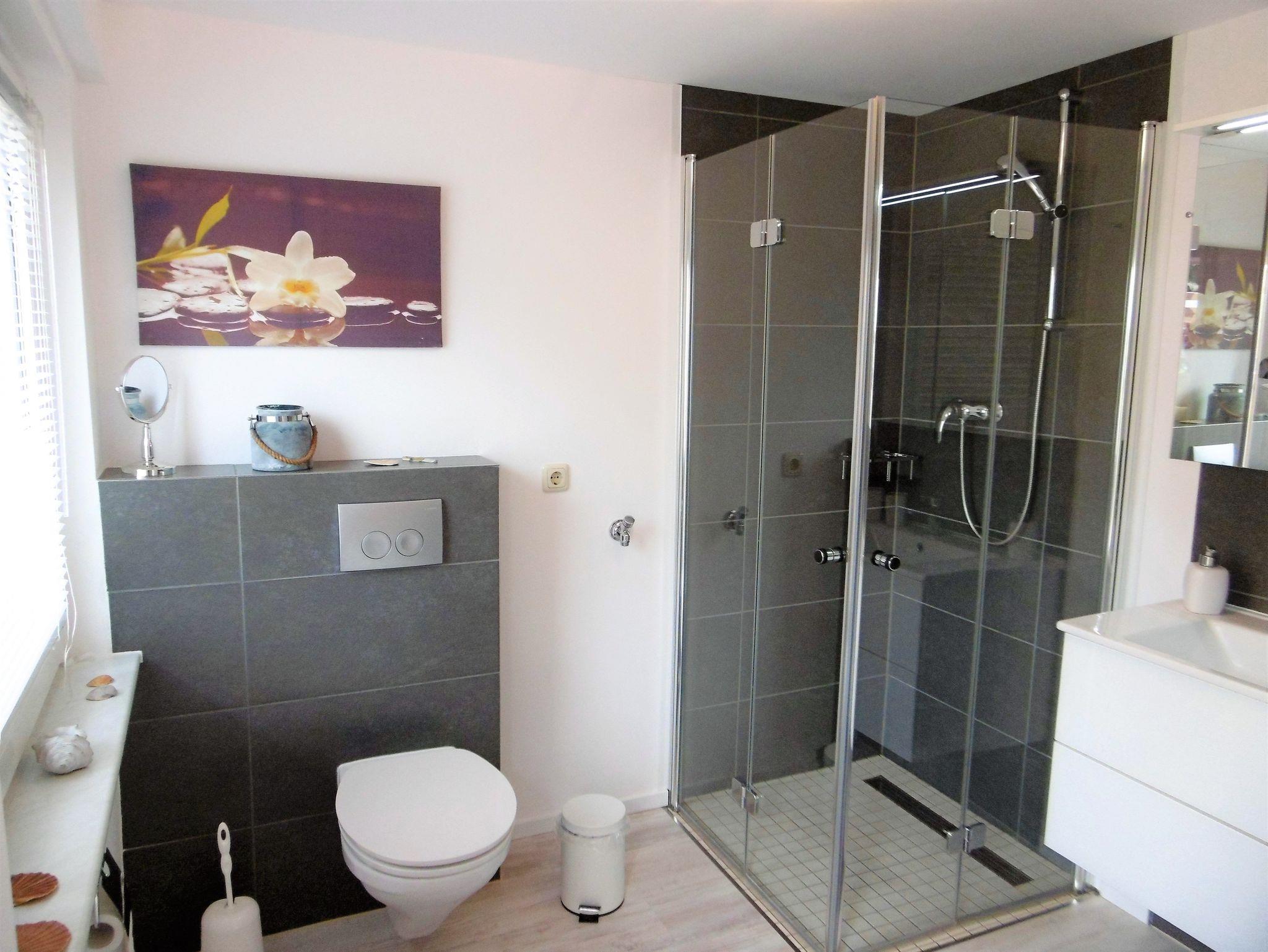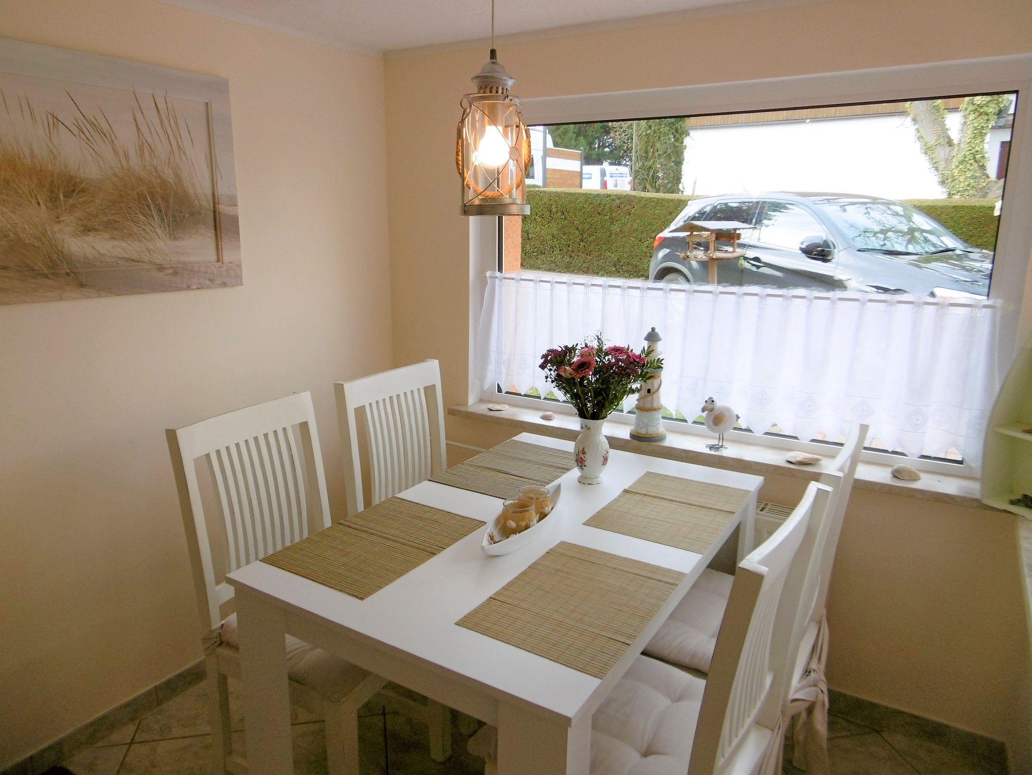 Die modern ausgestattete Ferienwohnung im Erdgeschoss umfasst ein kombiniertes Wohn- / Schlafzimmer mit Doppelbett, ein Schlafzimmer mit 2 Einzelbetten, ein Badezimmer mit ebenerdiger Dusche und eine kleine Diele mit Esstisch.