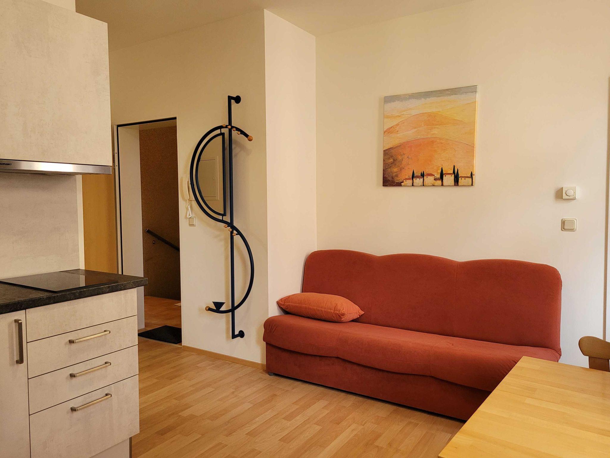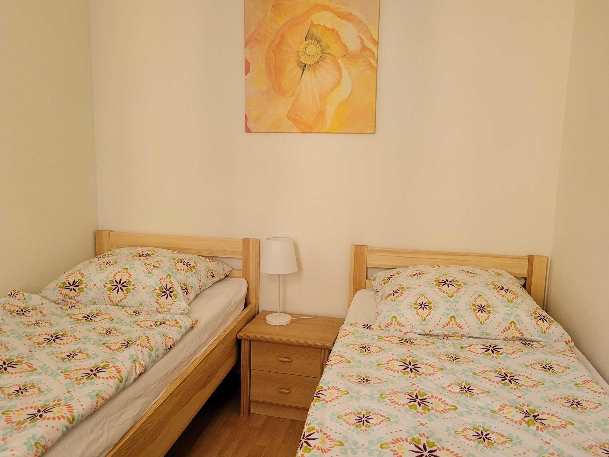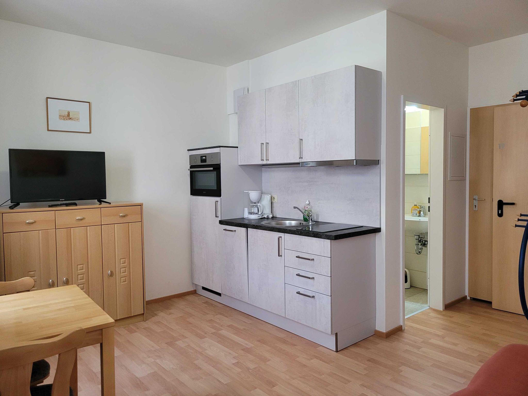 Die Wohnung verfügt über ein Schlafzimmer mit zwei Einzelbetten, Wohnzimmer, Wohnküche, Bad mit Dusche/WC und liegt zur Straßenseite (Kopfsteinpflaster).