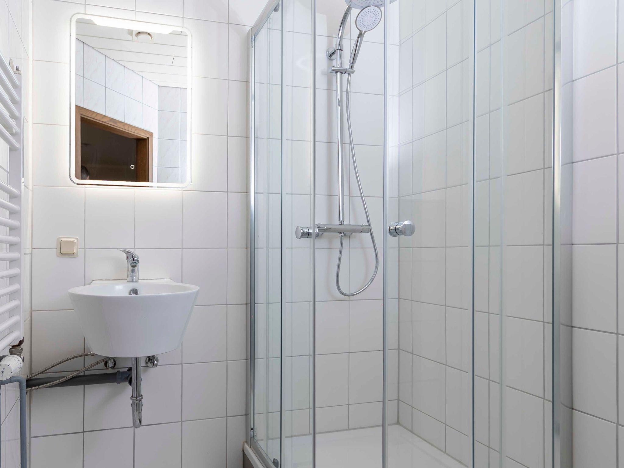 Die Doppelzimmer sind ca. 15qm groß und verfügen über zwei Betten (90 cm x 200 cm), die wir wahlweise zusammen oder auseinander stellen können sowie einen Schrank, eine Sitzgelegenheit, einen Kühlschrank und einen Wasserkocher. Das Bad verfügt über eine Dusche.