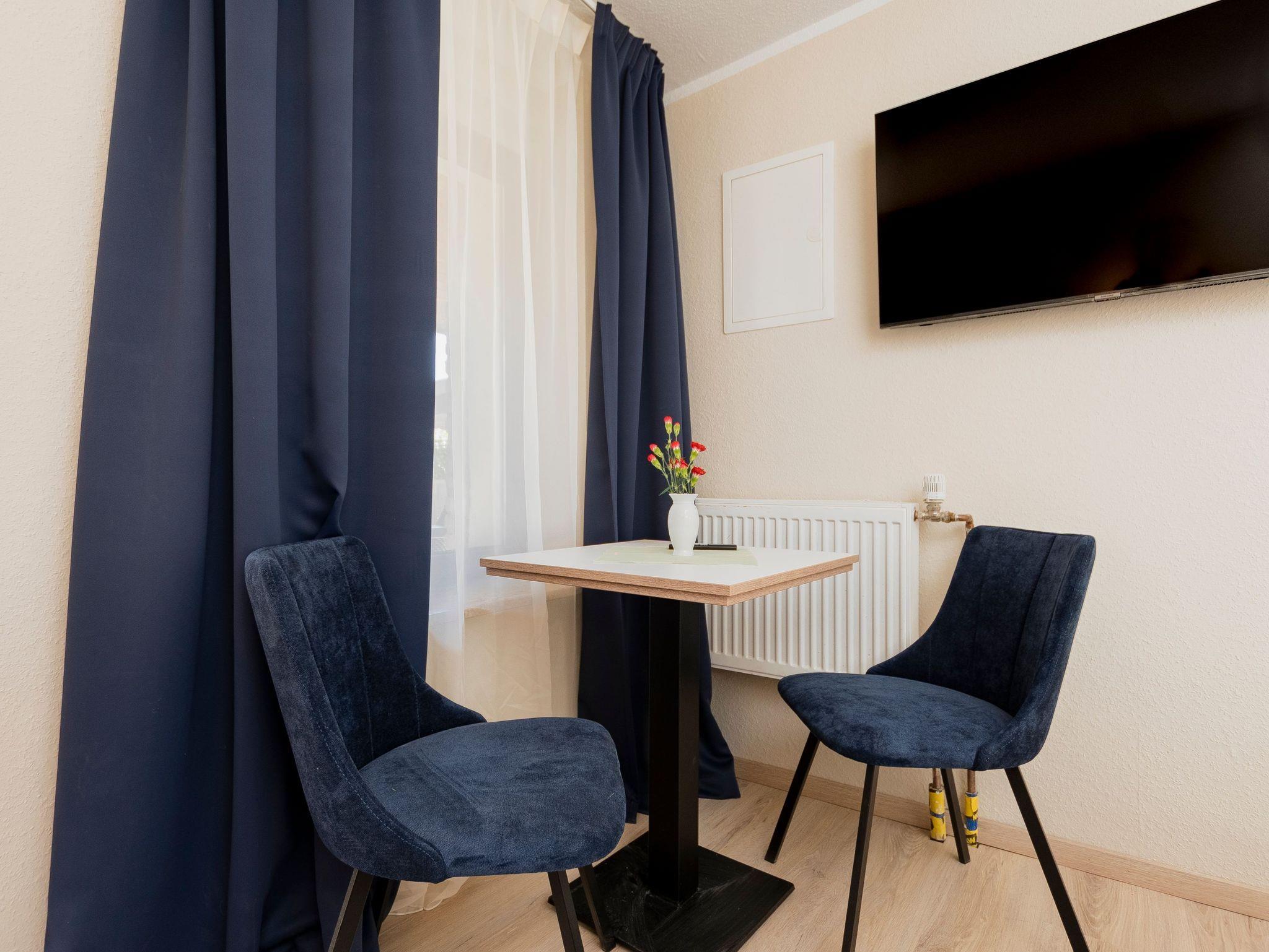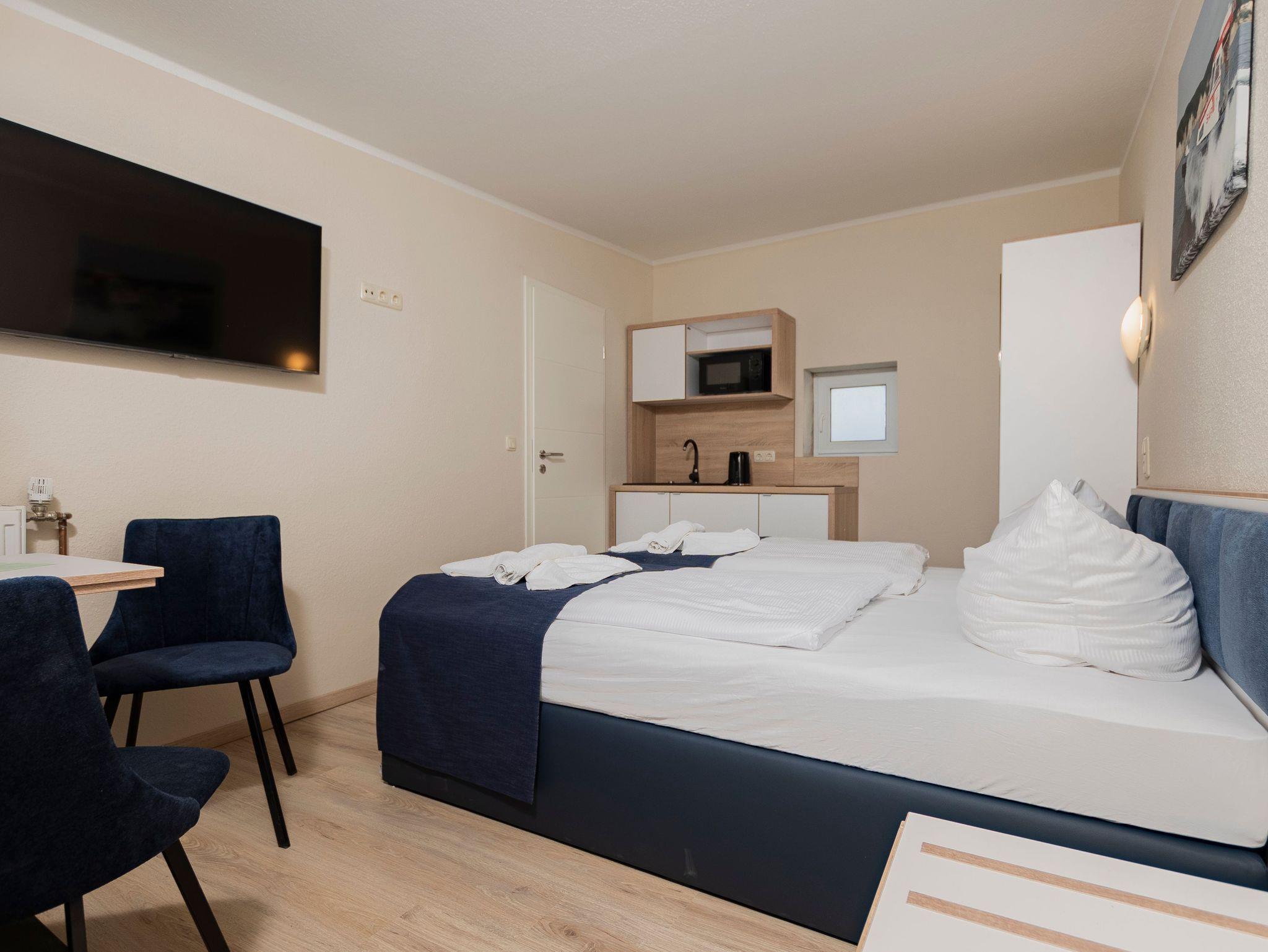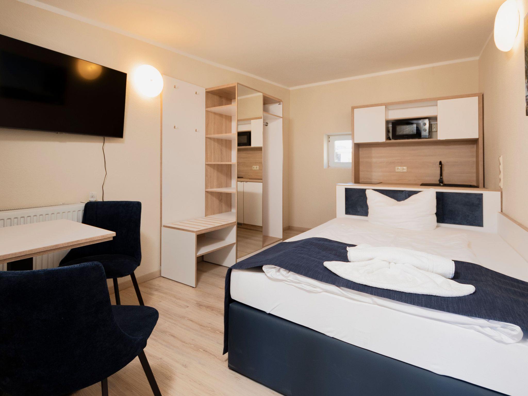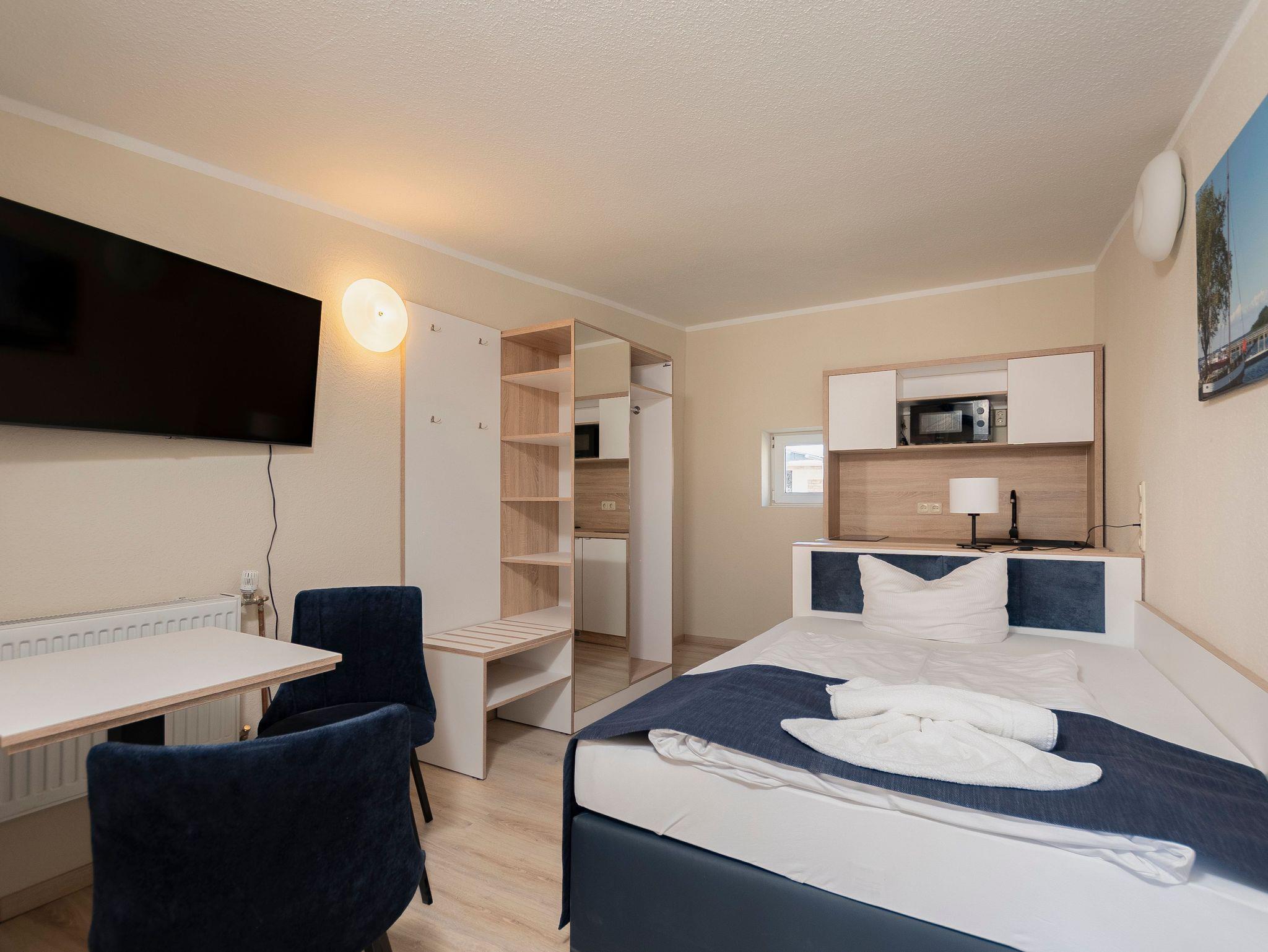 Modernes Studio im Aparthotel Stralsund mit Pantryküche, ruhiger Lage und Fahrradraum, ideal für Paare oder Alleinreisende.