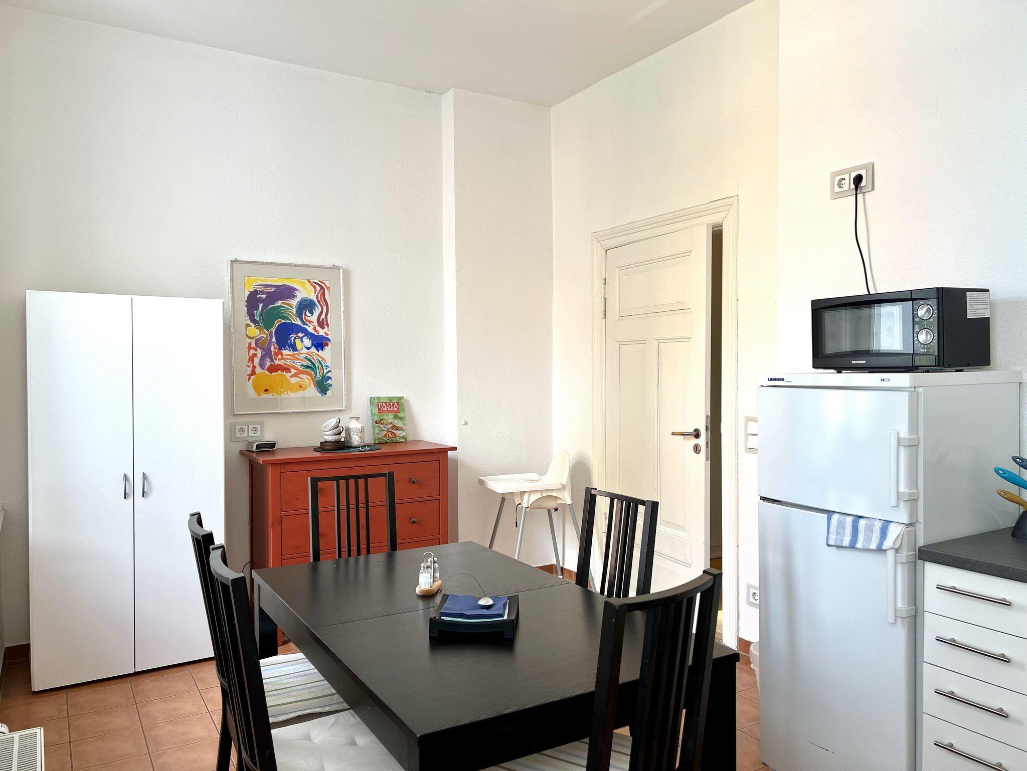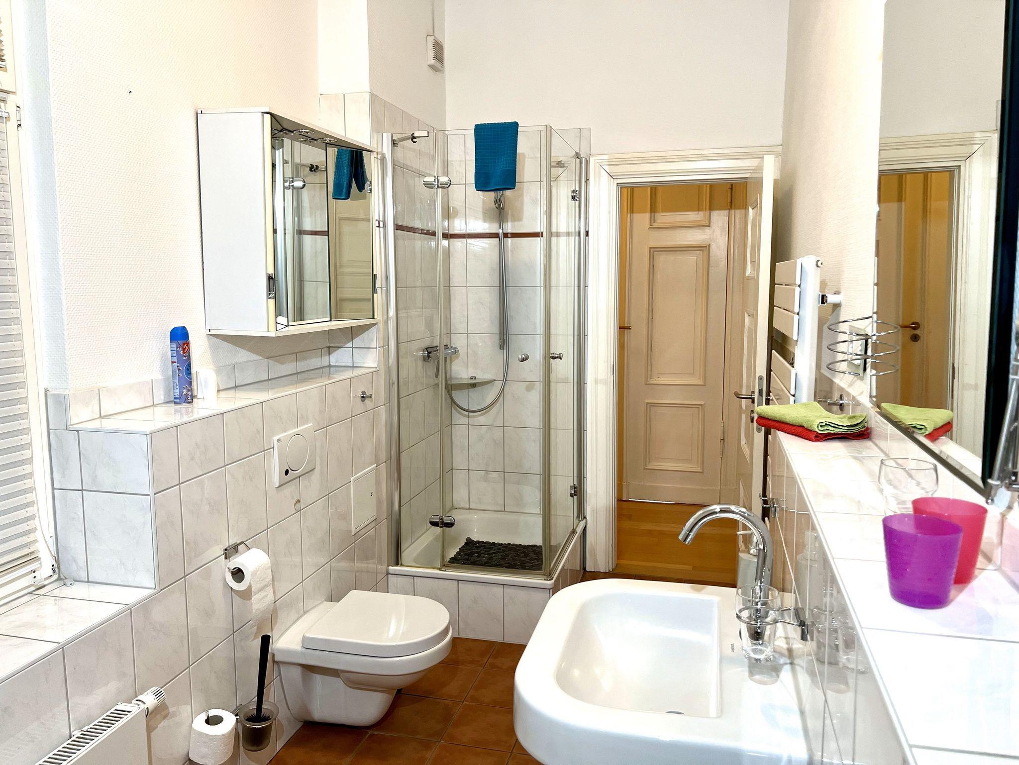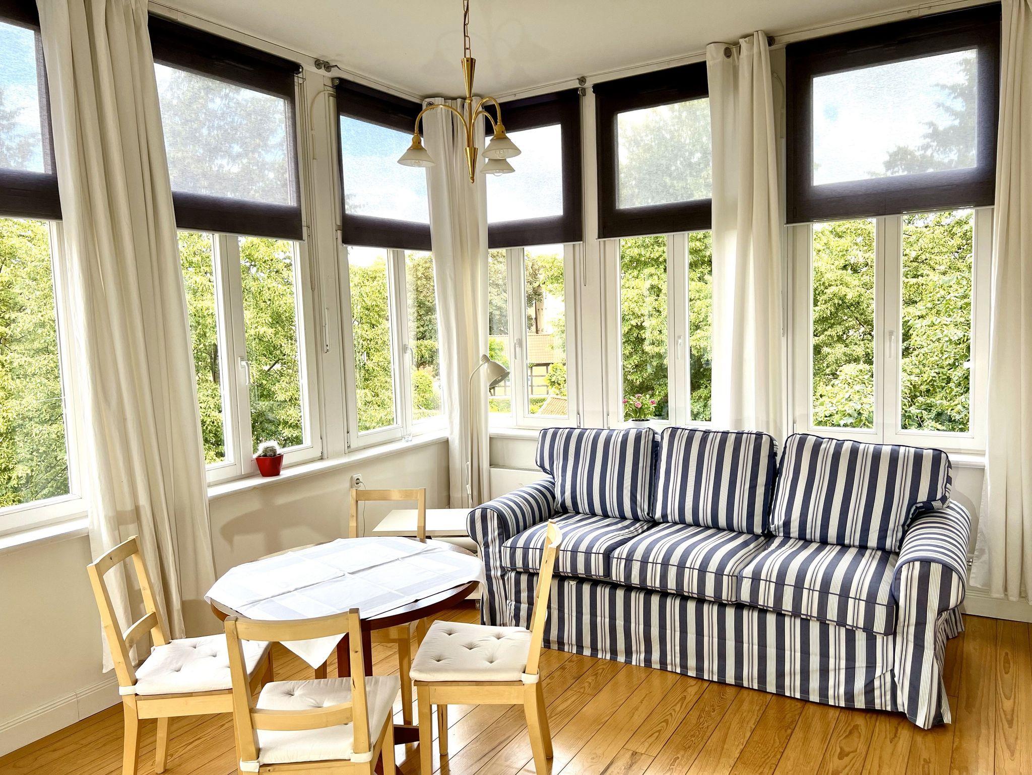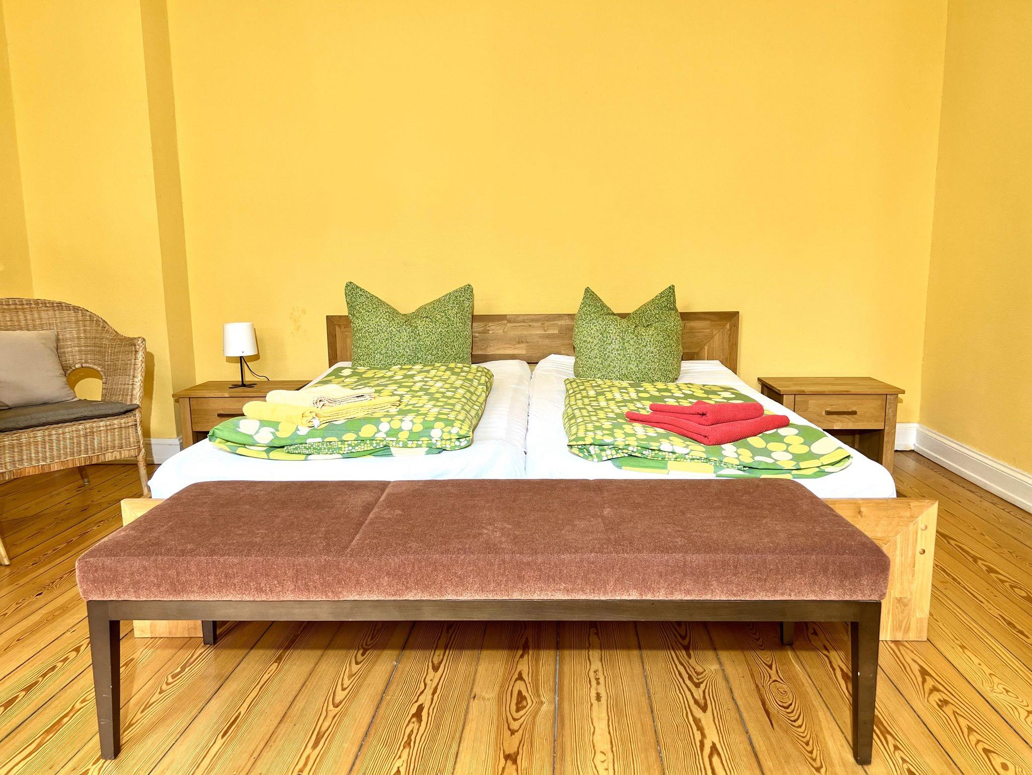 Das komfortable, herrschaftliche Appartement ist 137 qm groß und verfügt über zwei große Schlafzimmer mit Doppelbett (180 x 200 cm) und Stuckdecke, ein ebenfalls mit Stuck verziertes, gemütliches Wohnzimmer mit Chemineeofen, Stereoanlage, einen Wintergarten mit Bettsofa (hier ist eine Kinderaufbettung möglich), eine moderne Einbauküche mit ausziehbarem Esstisch sowie ein Bad mit Badewanne/DU/WC und ein Bad mit Du/WC. WLAN kostenfrei. In dieser Wohnung können bis zu 2 Kinderbettchen aufgestellt werden.