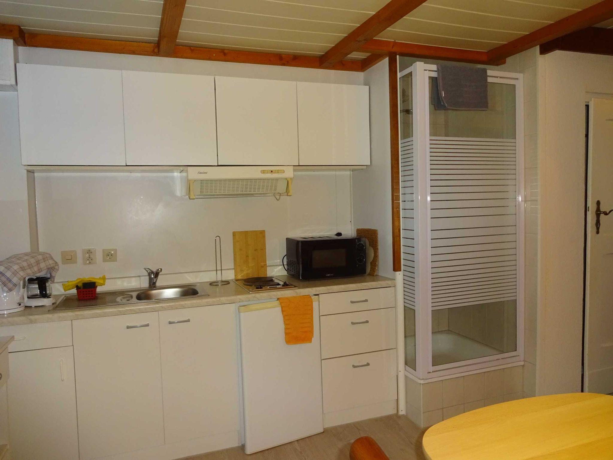 Die Duschkabine befindet sich baubedingt neben der Küchenzeile (kein separater Raum).
