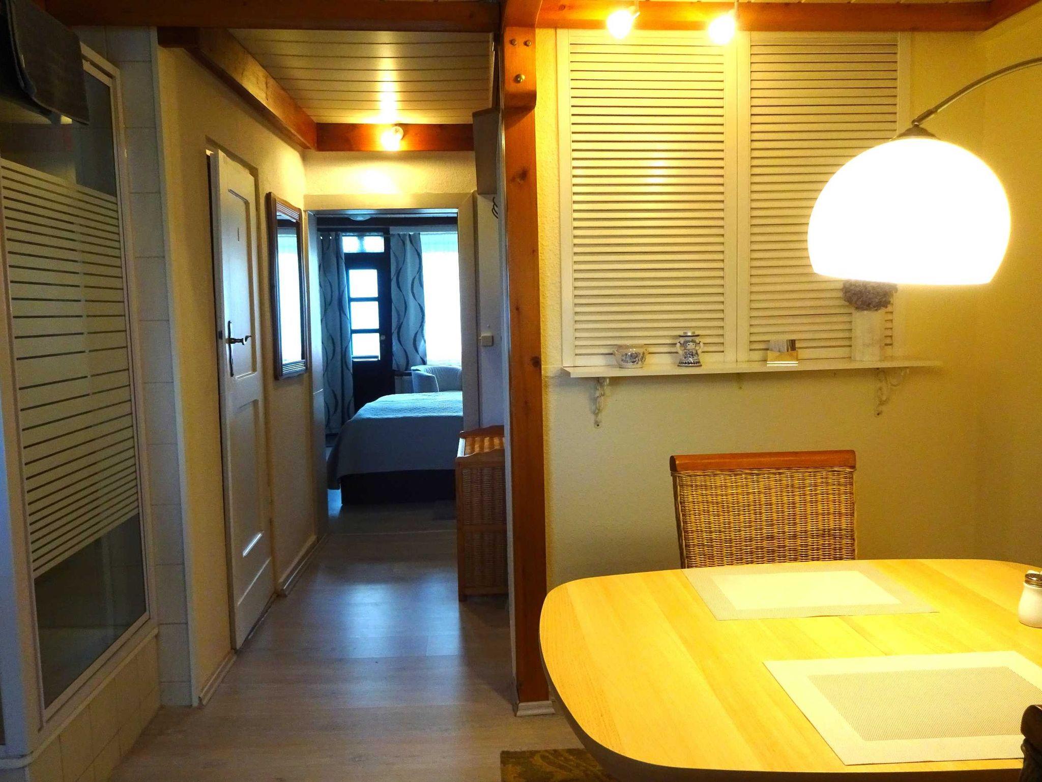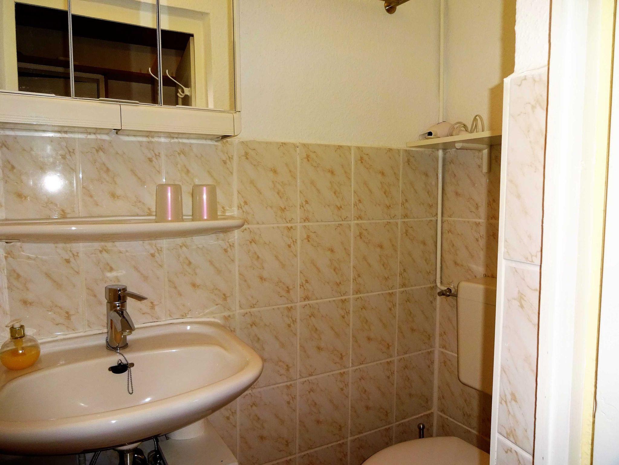 Unsere Erdgeschoss-Ferienwohnung ist 28 qm groß und gut und zweckmäßig ausgestattet. Sie ist ohne Stufen erreichbar und verfügt über einen separaten Schlafraum (Polsterbett mit zwei Matratzen je 80 cm breit, Topper vorhanden, nicht als Einzelbetten nutzbar), eine Wohnküche sowie ein WC mit Waschmöglichkeit. In der Wohnküche befinden sich Kühlschrank, Wasserkocher, Kaffeemaschine, 2 eingebauten Kochplatten, Eierkocher, Toaster, Mikrowelle.