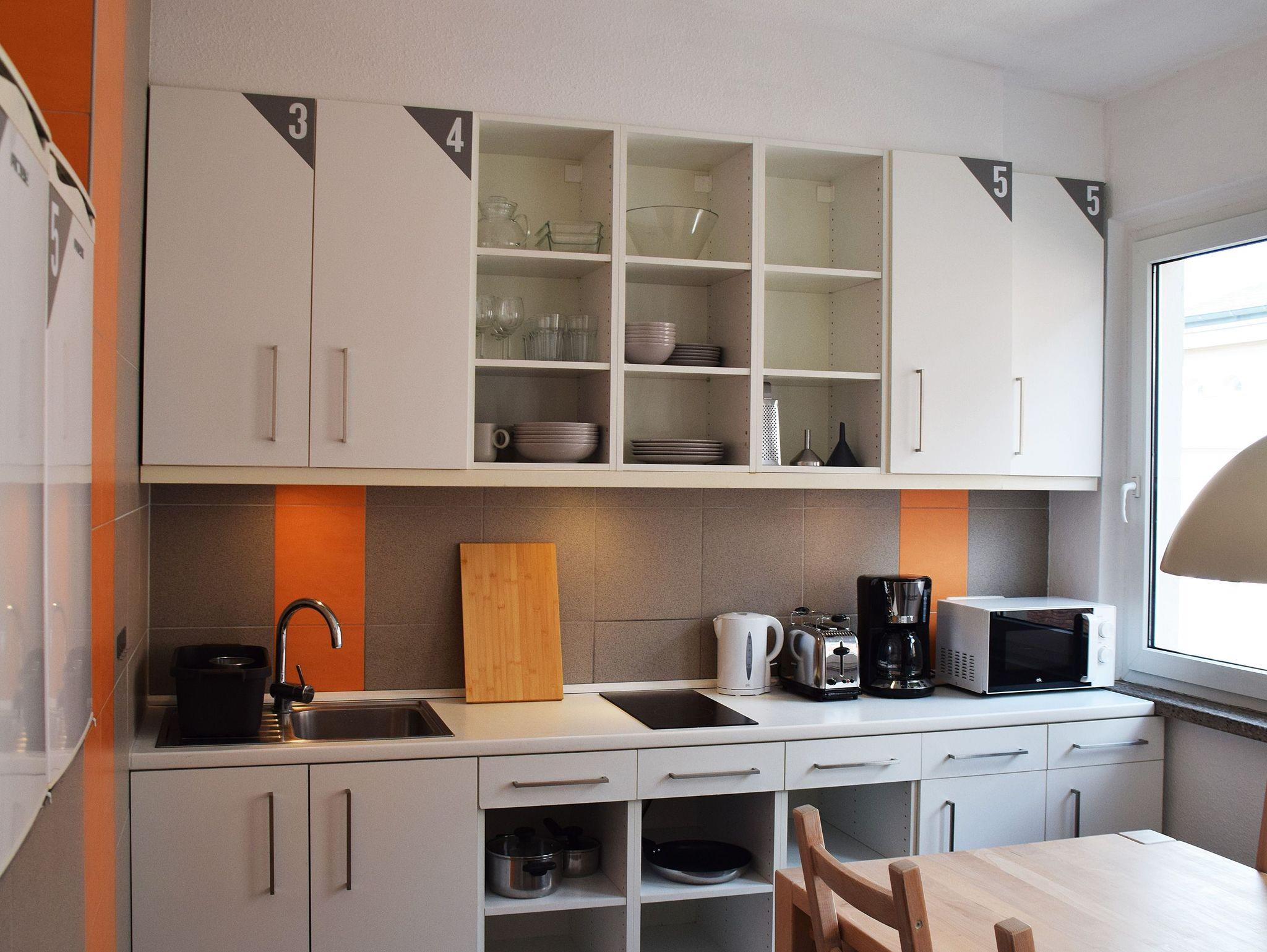 - Küche (Backofen, Herd, Spülmaschine, Kaffeemaschine, Wasserkocher, Toaster, je Zimmer ein Kühlschrank)