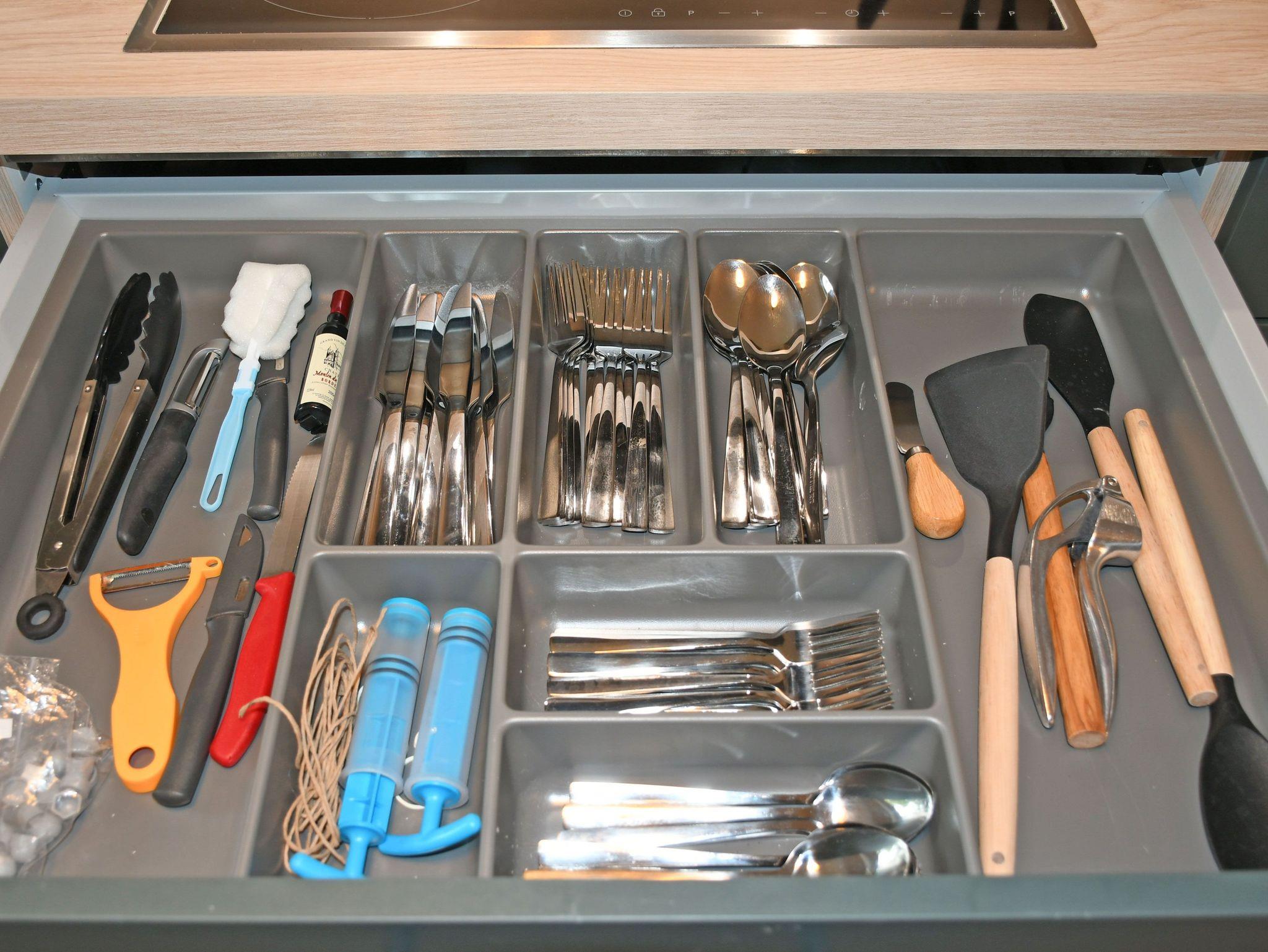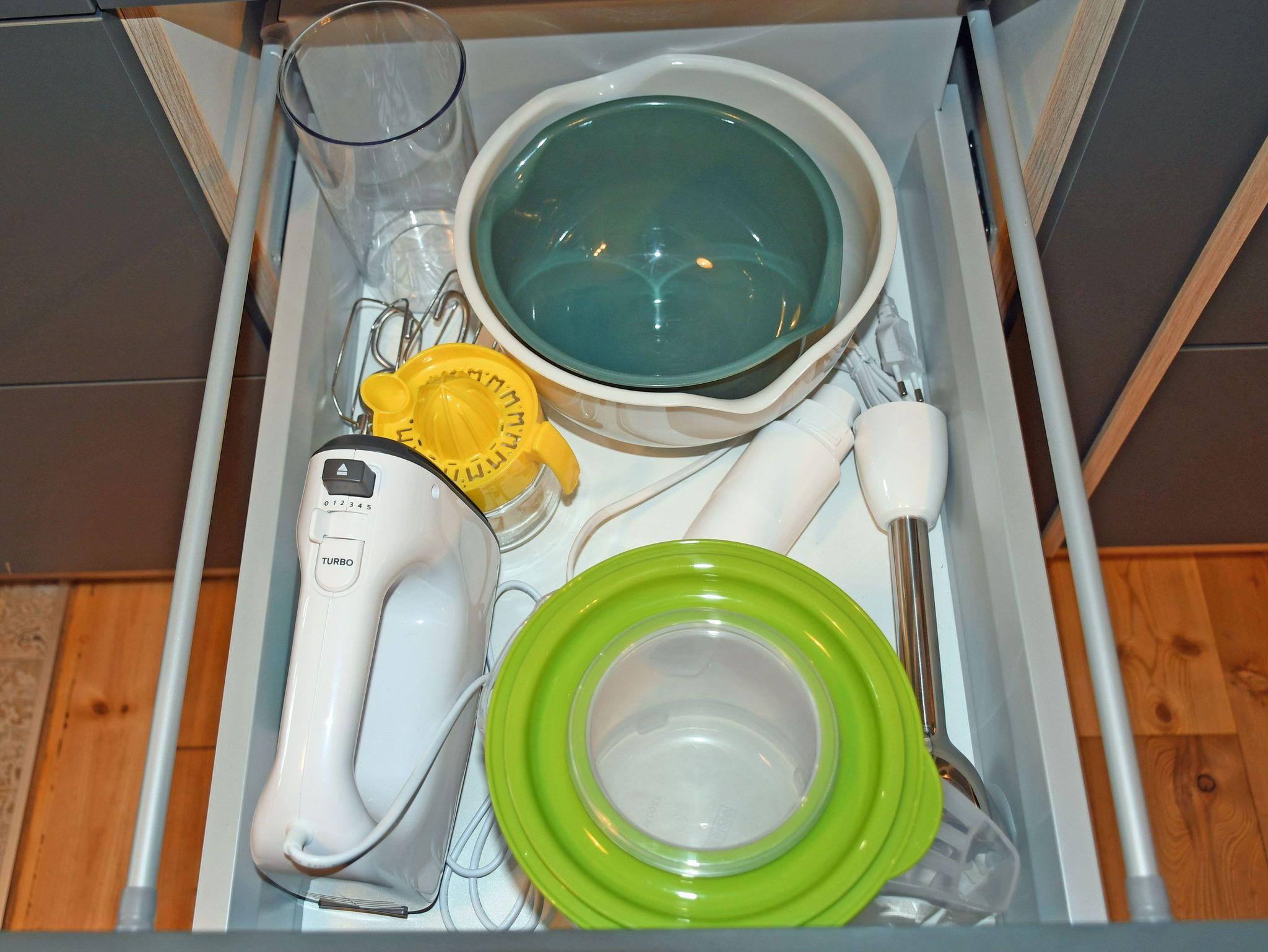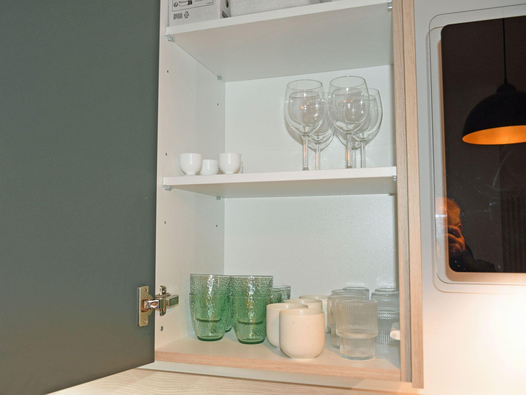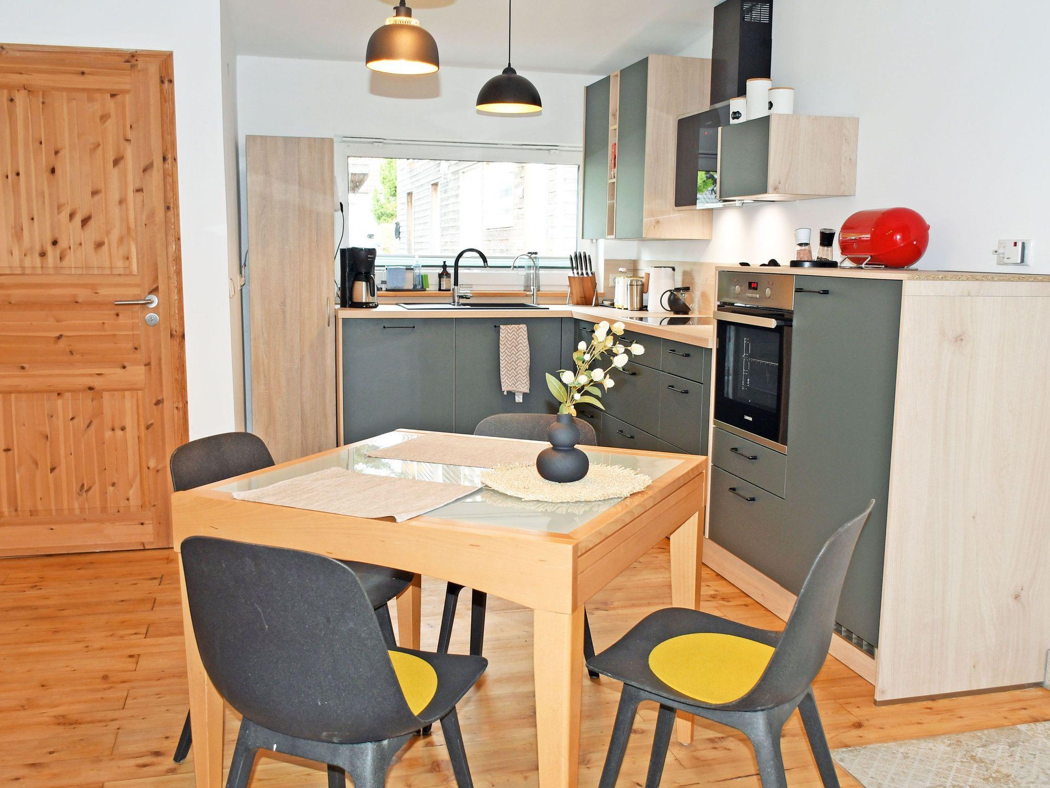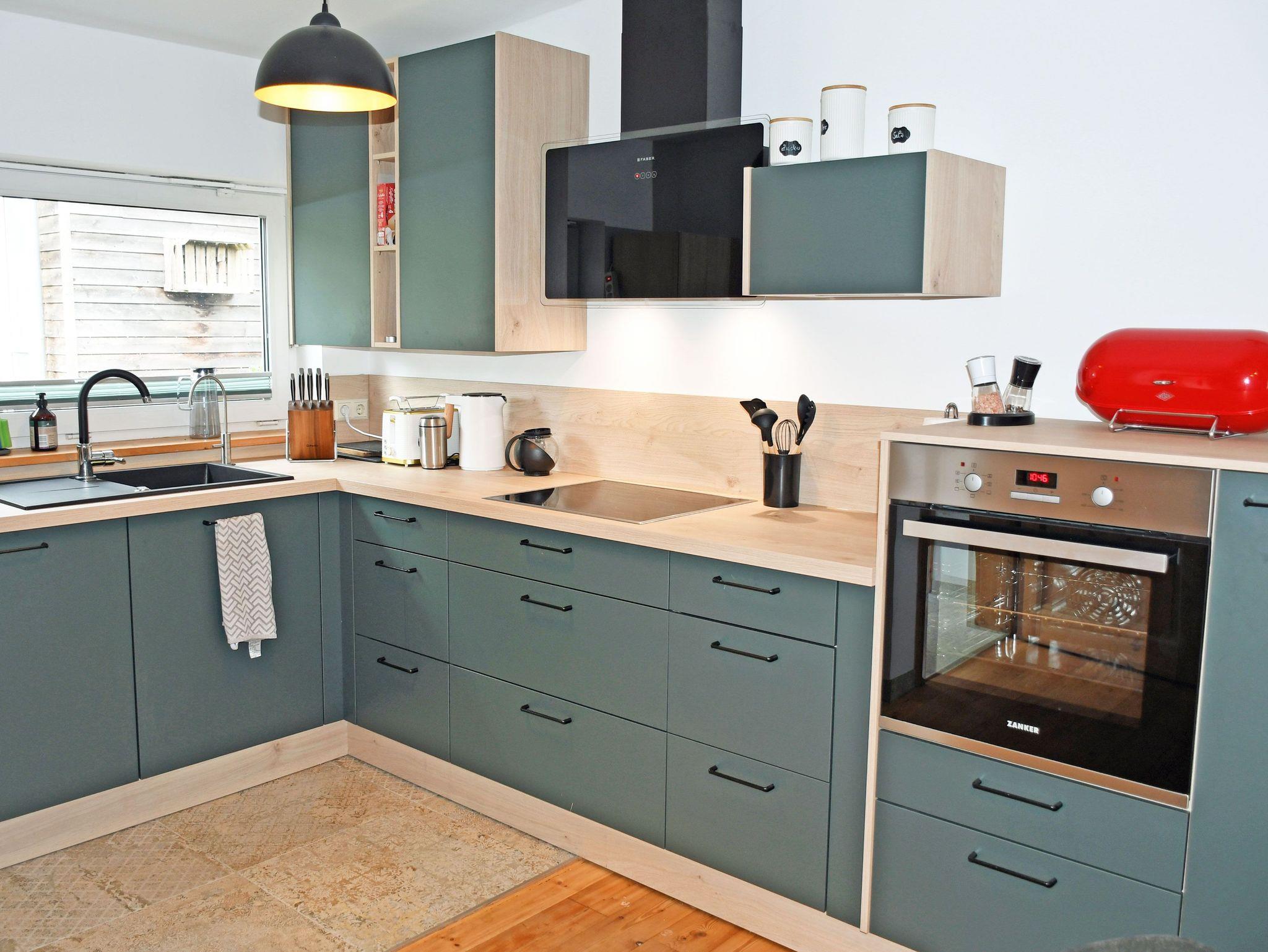 Die moderne Küchenzeile ist mit einem Ceranfeld-Herd, Backofen, Abzugshaube, Wasserkocher, Kaffeemaschine, Toaster und Kühlschrank mit Gefrierfach komplett ausgestattet.