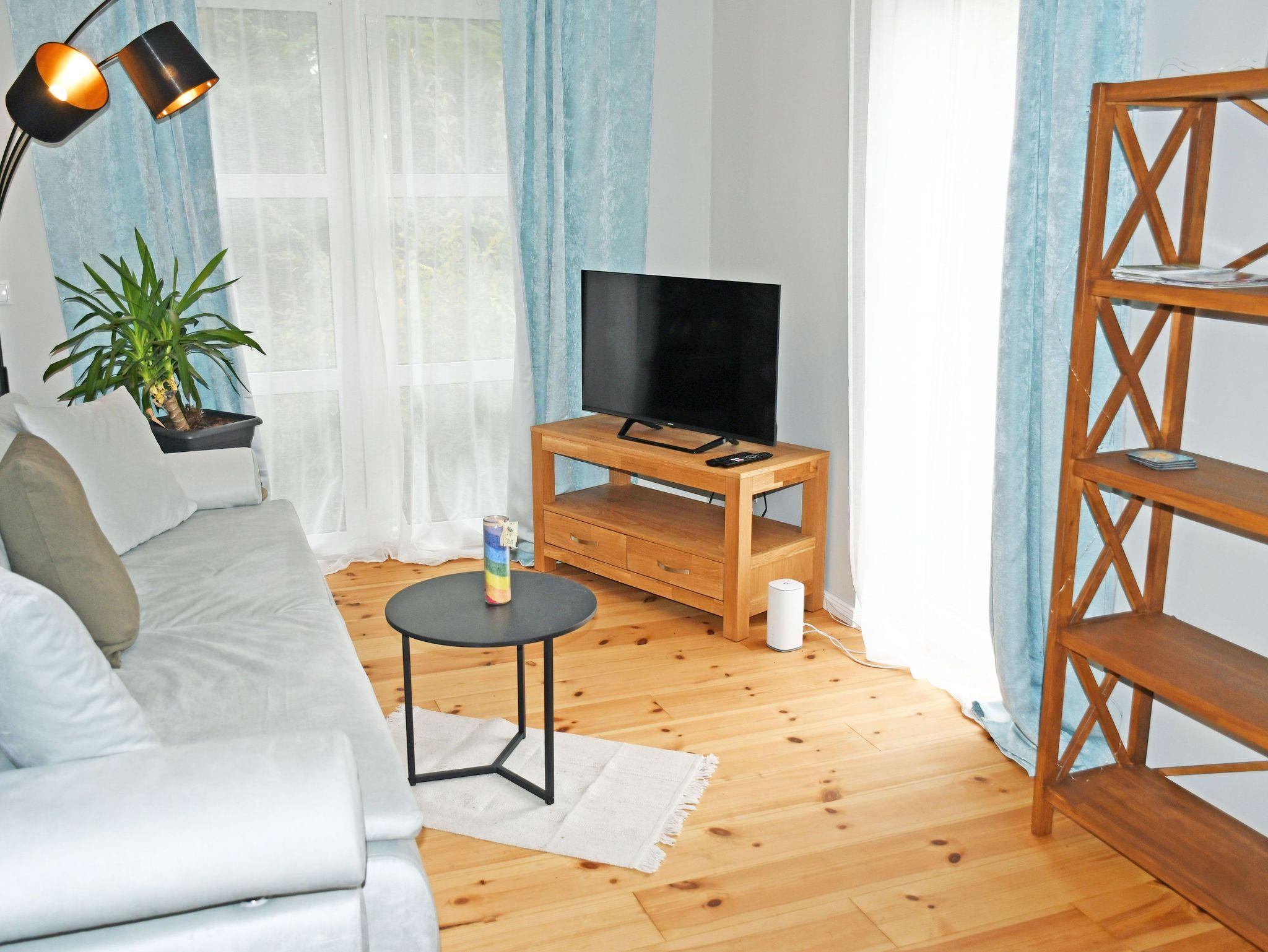 Sie ist ca. 60 qm groß, hat Platz für maximal 4 Erwachsene und ein Kind bis 3 J. im Kinderreisebett. Sie wurde modern und liebevoll eingerichtet. Im Wohnraum befinden sich eine bequeme Sitzcouch mit Tisch und ein modernes Flachbild-TV-Gerät. Hier steht auch ein Esstisch mit Sitzgelegenheiten.