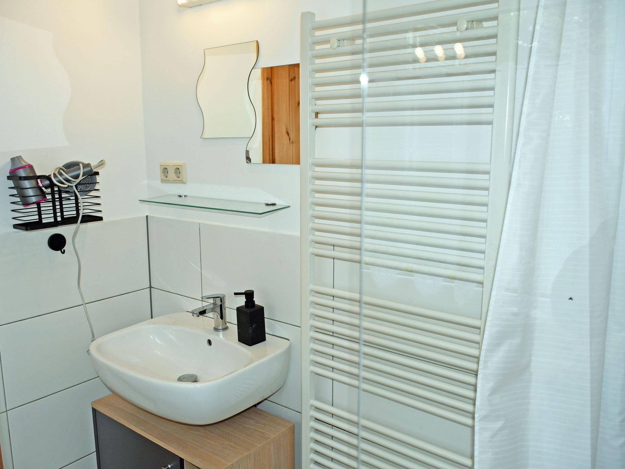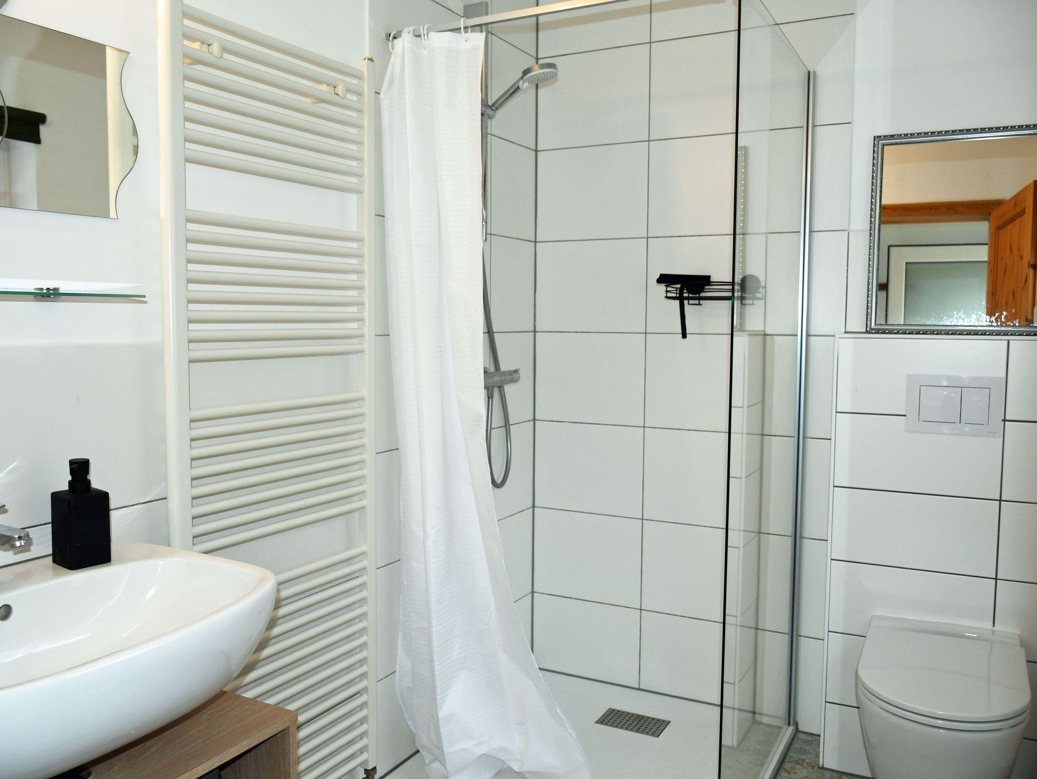 Das moderne Bad ist mit Dusche, Haartrockner, WC und Waschtisch ausgestattet, es hat Fenster und Tageslicht.