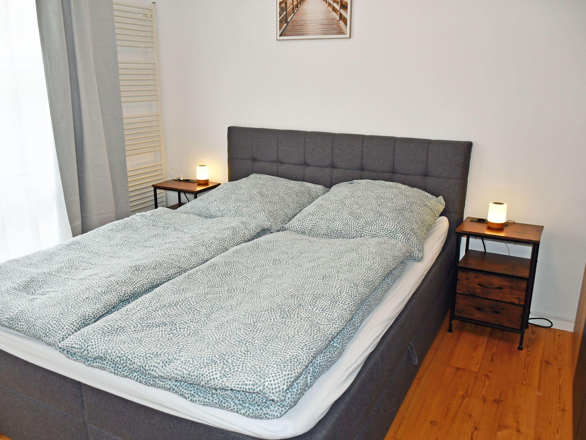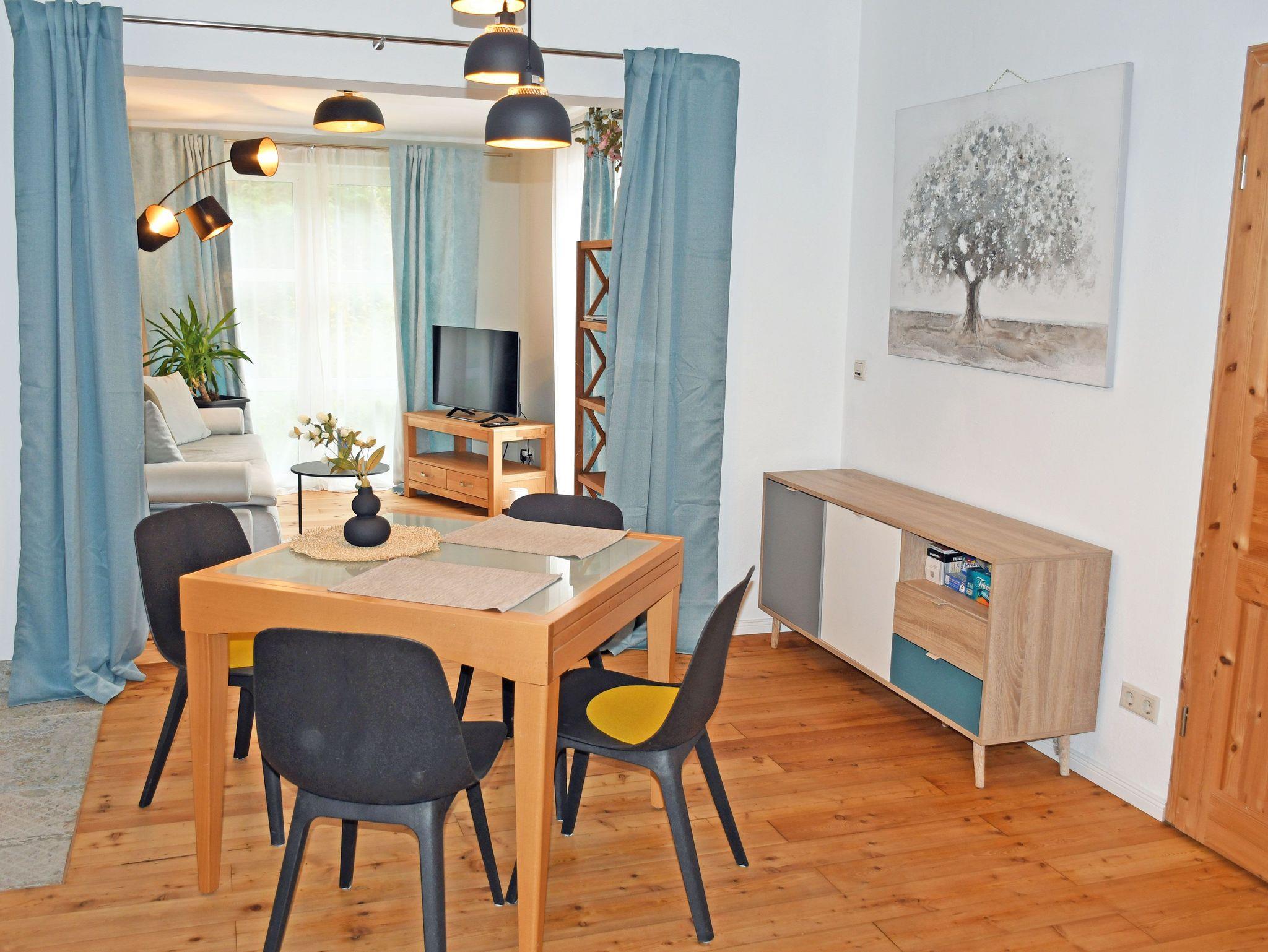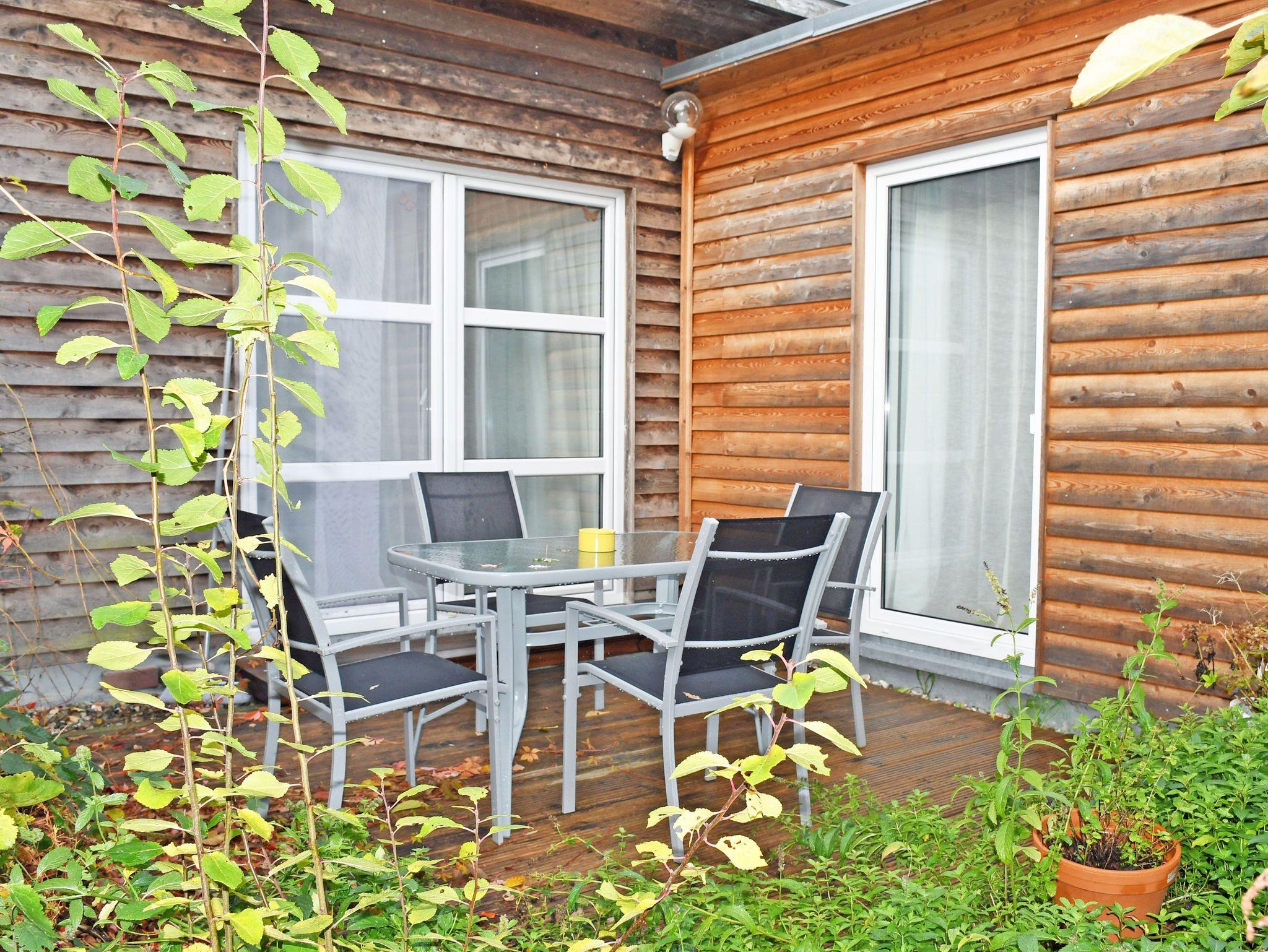 Moderne, ruhige Ferienwohnung mit Terrasse nahe dem Strelasund in Stralsund für entspannte Urlaubstage.