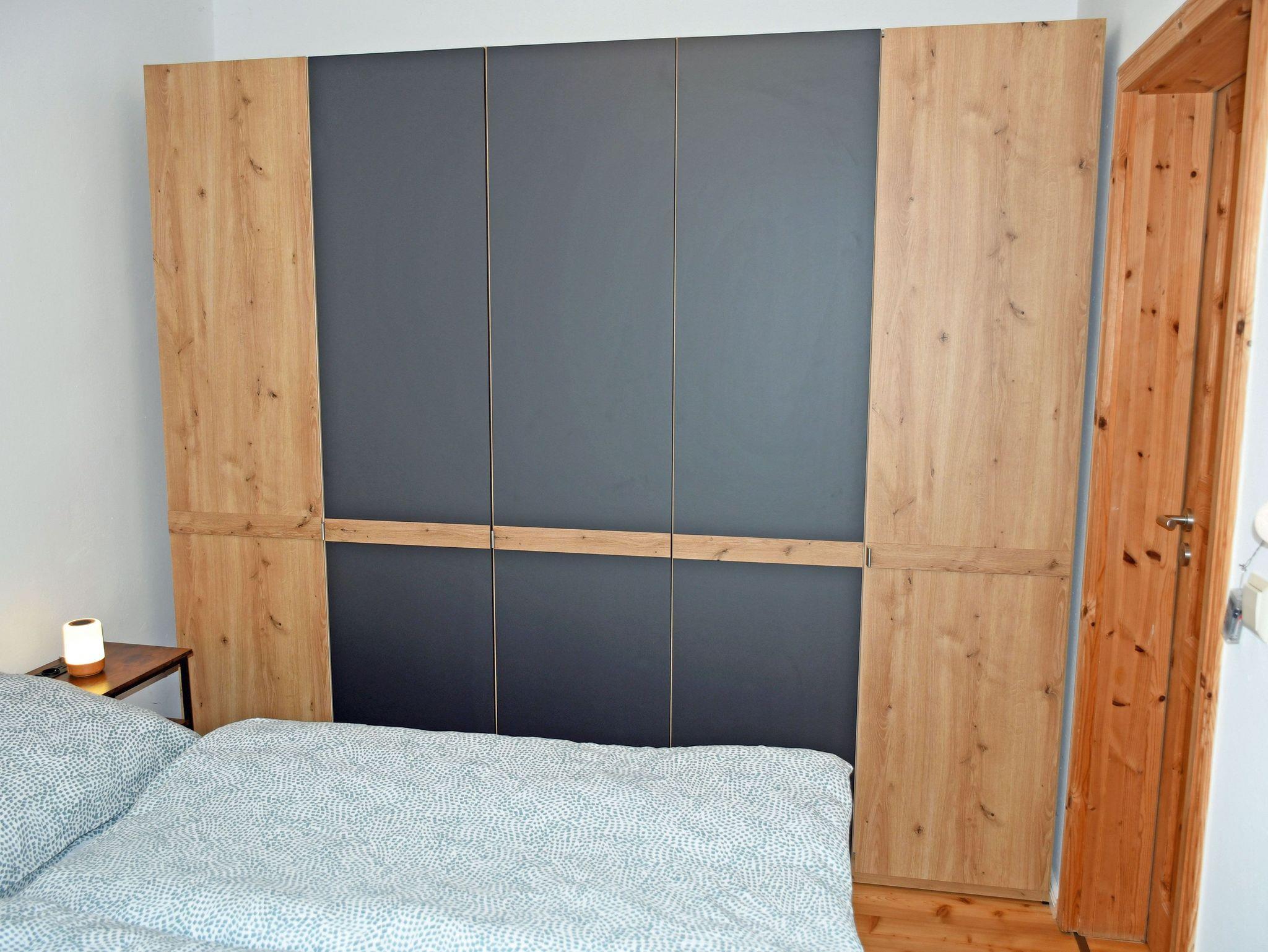 Das Schlafzimmer ist mit einem bequemen Doppelbett mit Nachttischen und Leselampen sowie einem Kleiderschrank ausgestattet.
