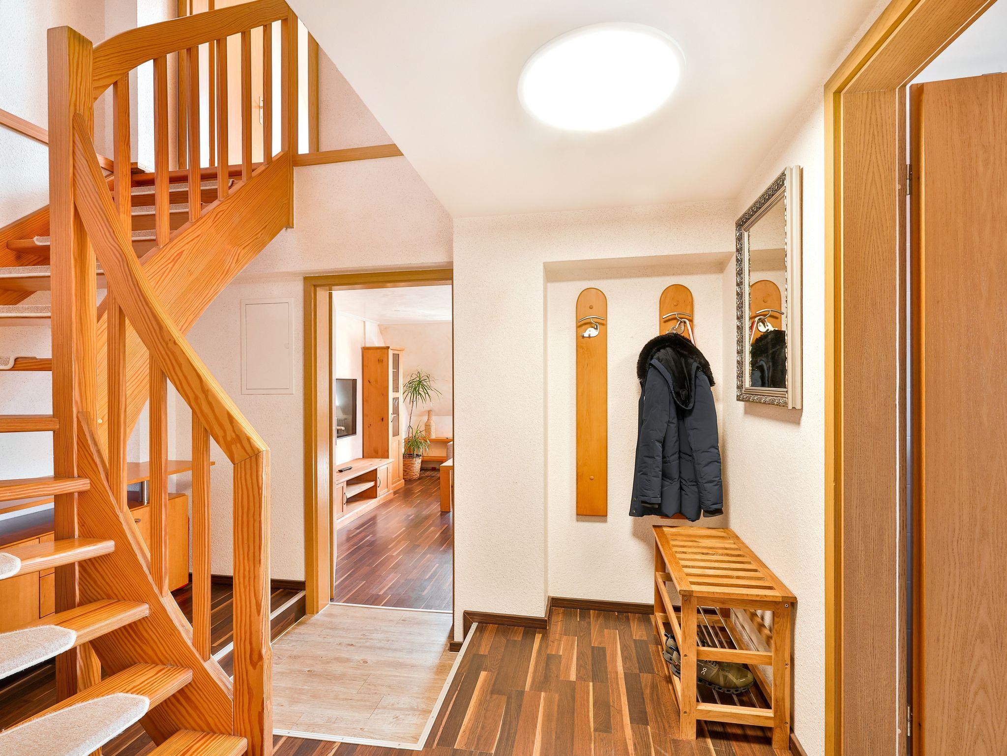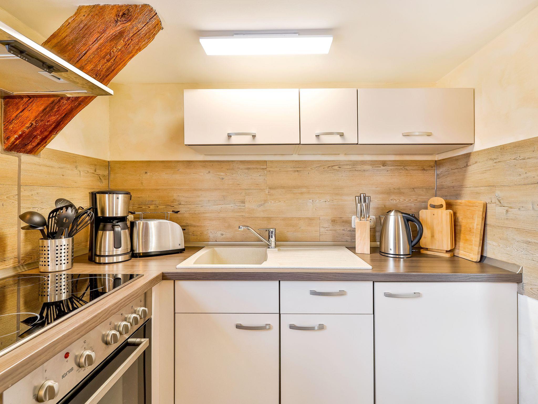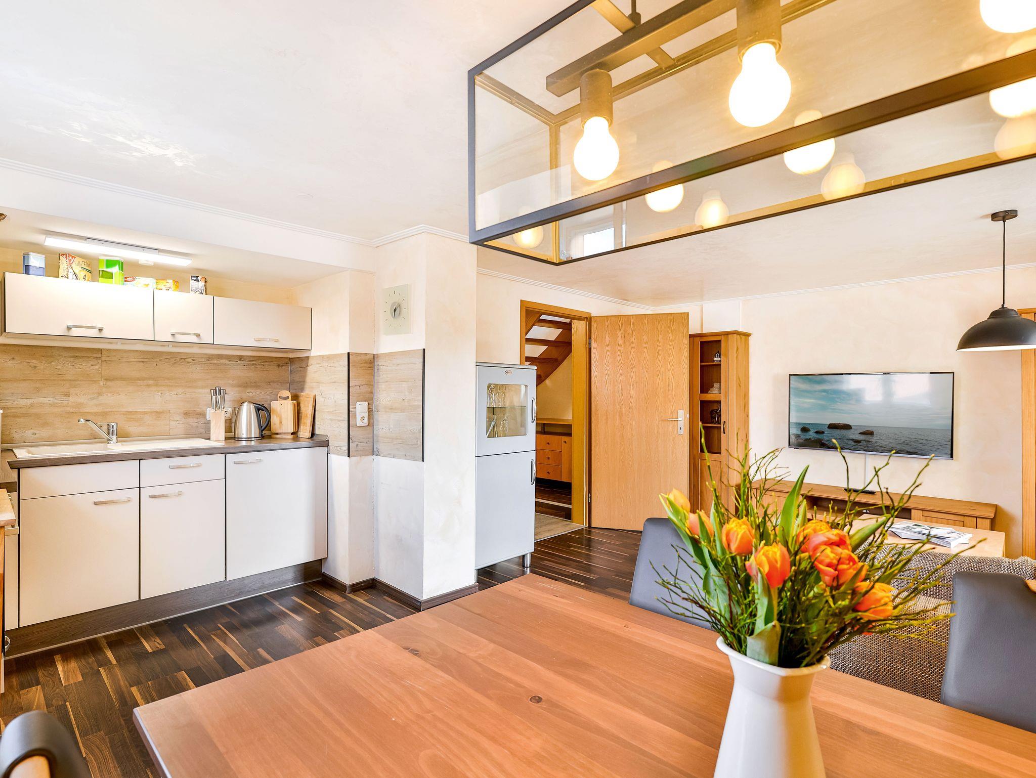 Die Ferienwohnung 3 liegt im 2.OG. Die Wohnung besteht aus einem großen Wohnraum mit offener Küche und Essbereich und dem Bad. Über eine innenliegende Holztreppe kommt man in das DG, in dem sich das Badezimmer befindet.