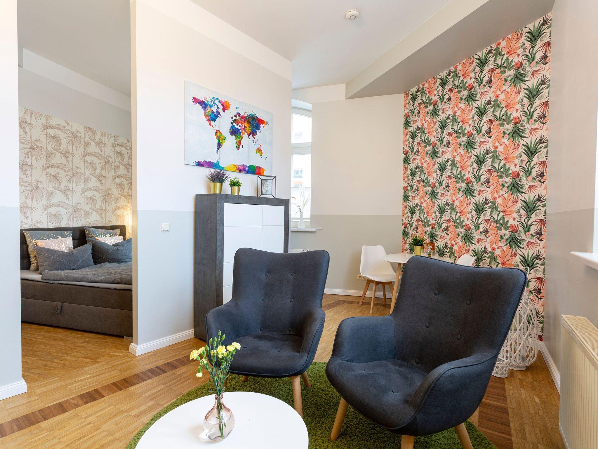 Modernes Altstadt-Studio 6 in Stralsund, ideal für Ostsee-Städtetrips mit eigener Küche und hellem Wohnbereich.