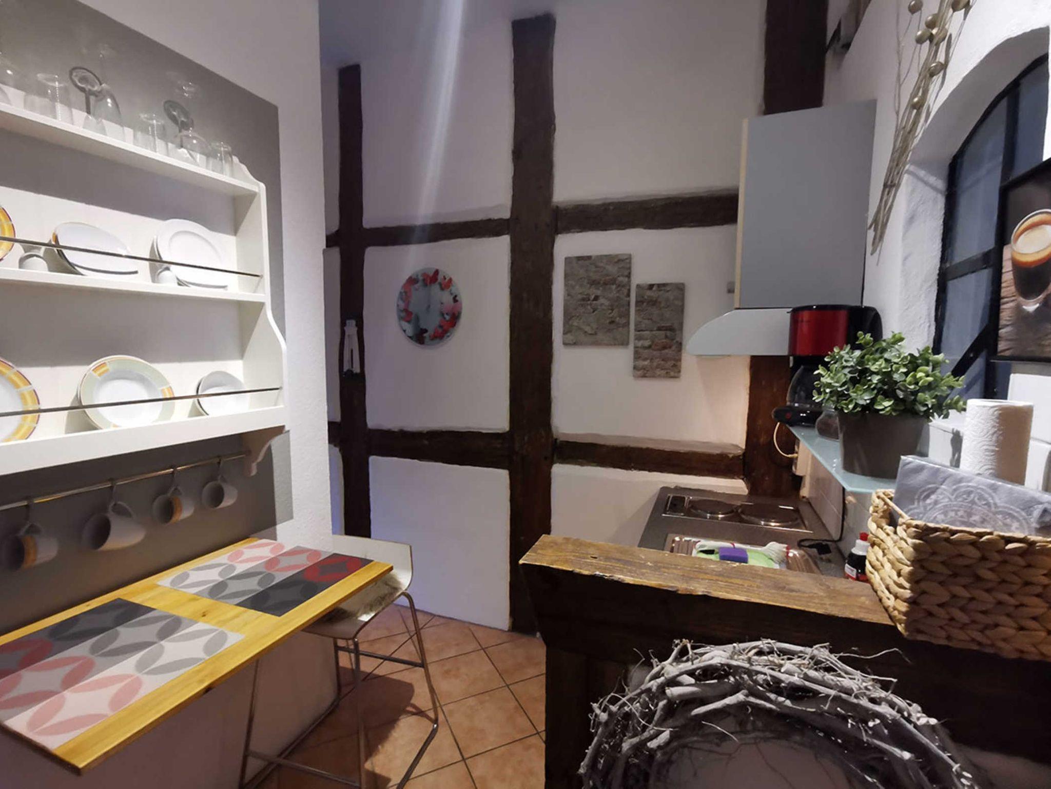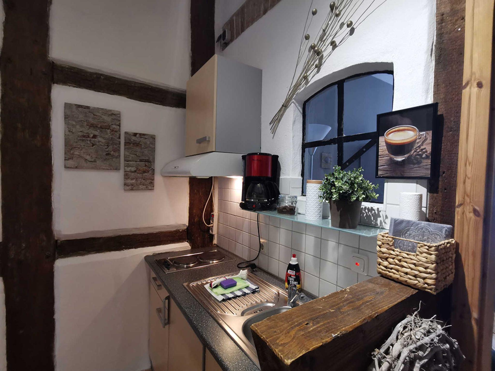 Die FeWo hat ein kombiniertes Wohn- und Schlafzimmer mit 2 getrennten Betten, die man zum Kuscheln natürlich auch zusammen schieben kann. Die Küche bietet einen Kühlschrank, E-Herd, Wasserkocher, sowie eine kleine Sitzgelegenheit zum Frühstück oder Abendessen. Das Bad ist gefliest, mit Dusche und einem Fenster zum begrünten Innenhof.