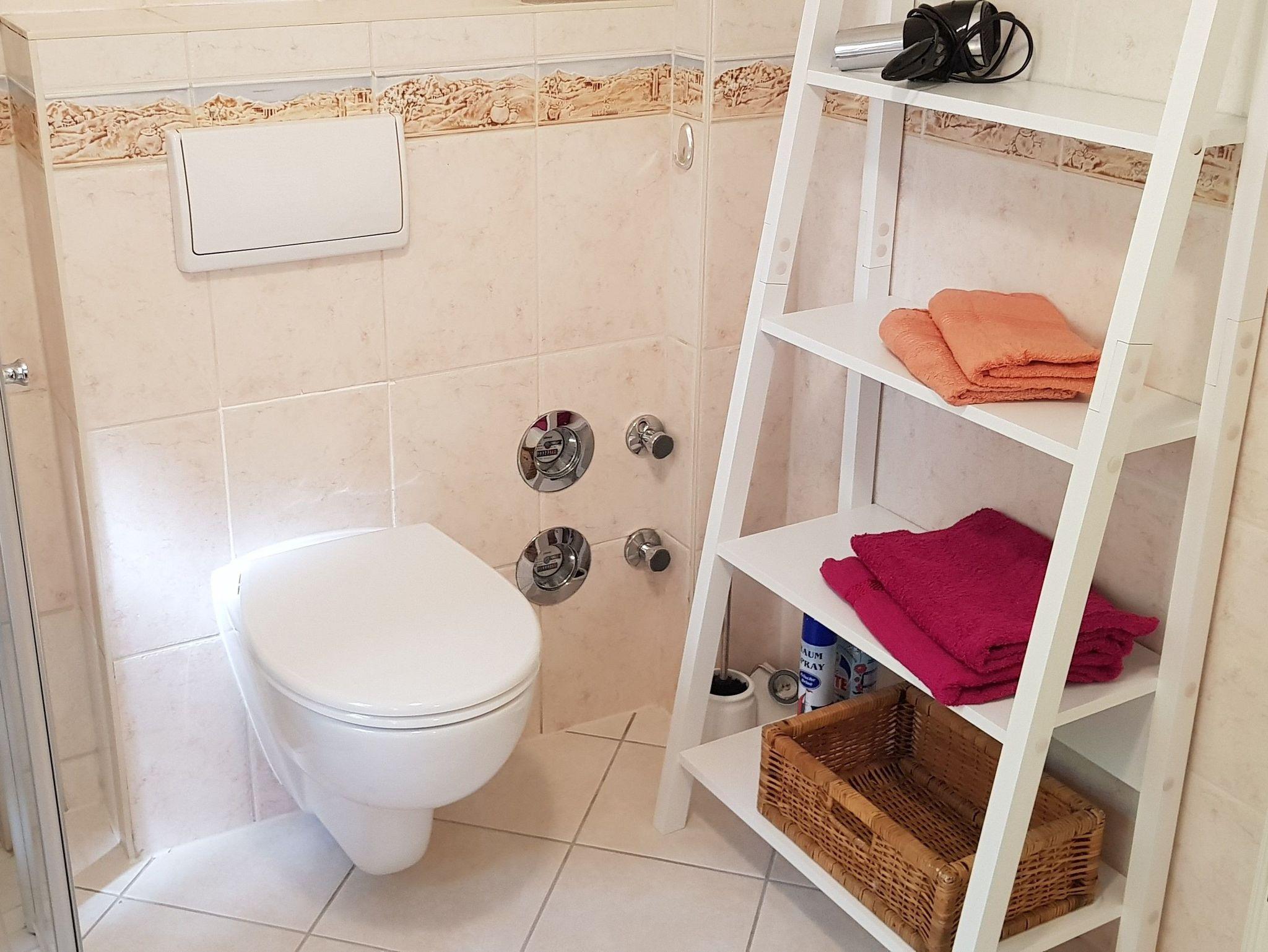 Die großzügig geschnittene Küche ist voll ausgestattet, das Bad mit ebenerdiger Dusche, Wanne und WC