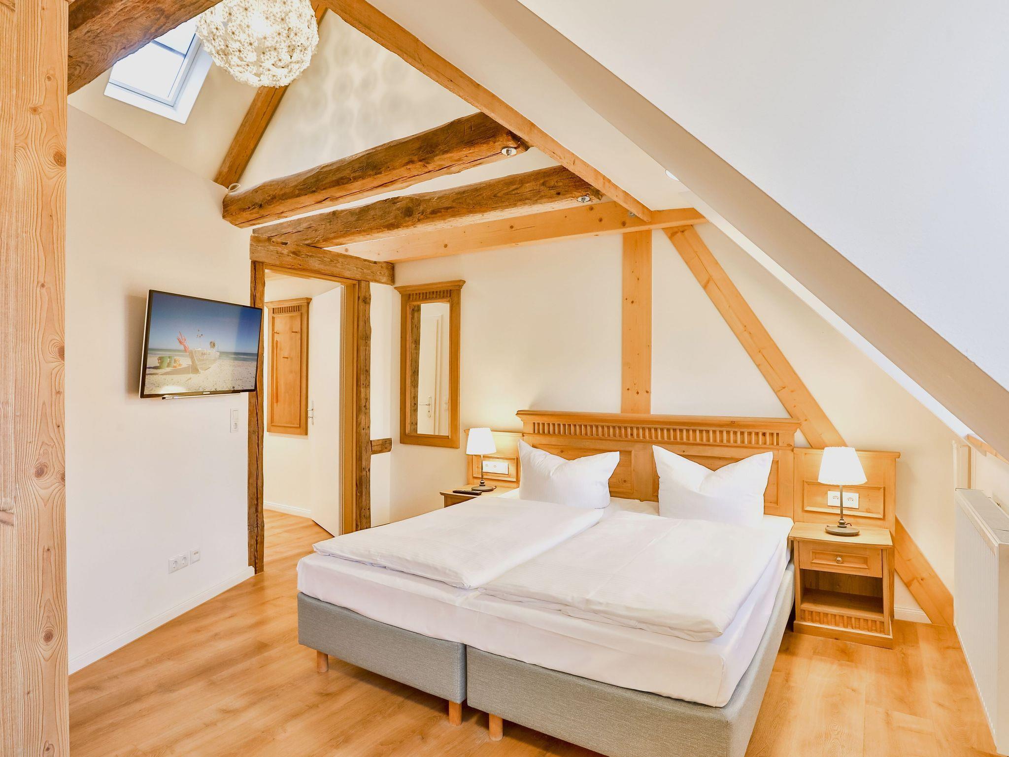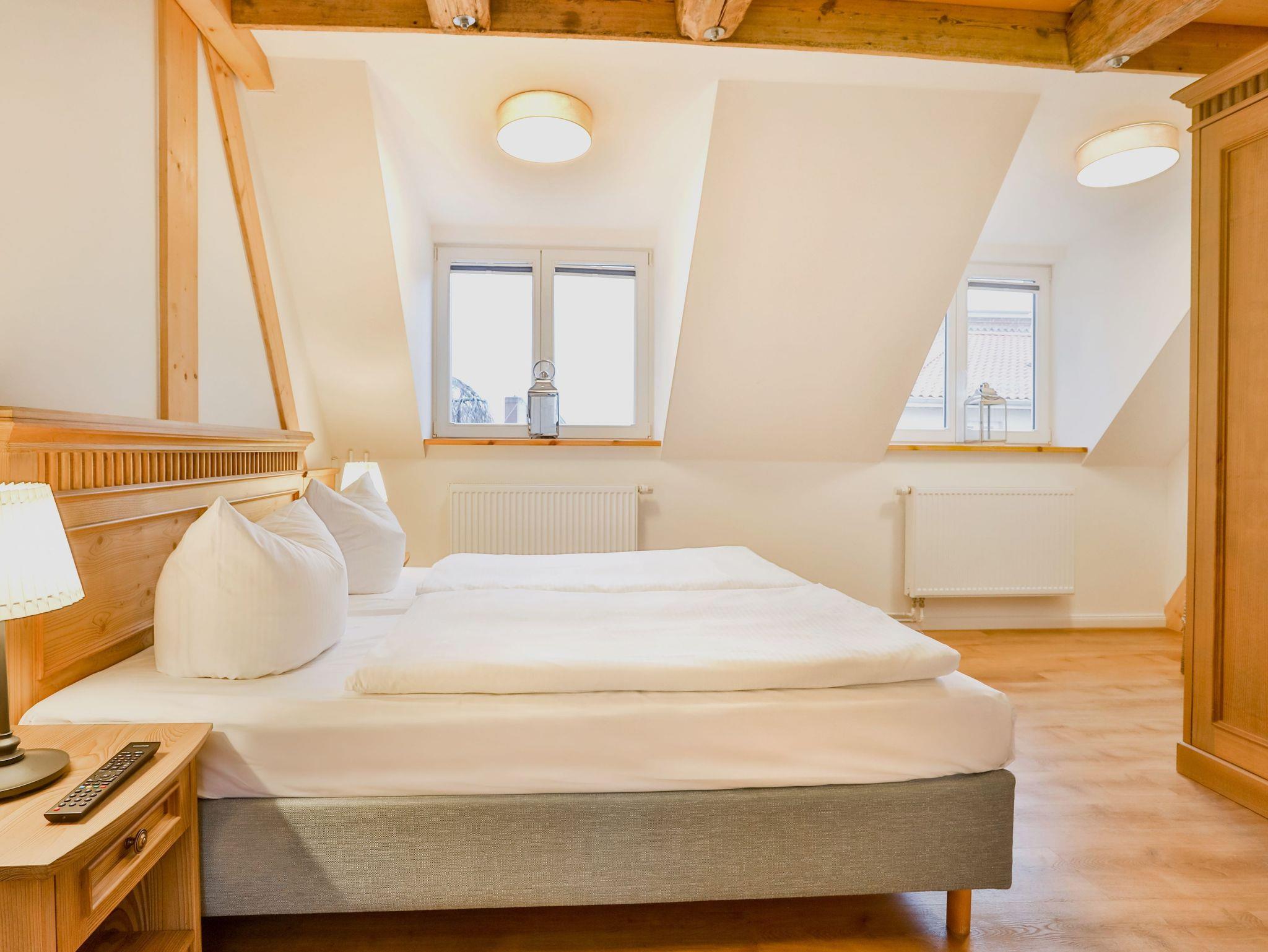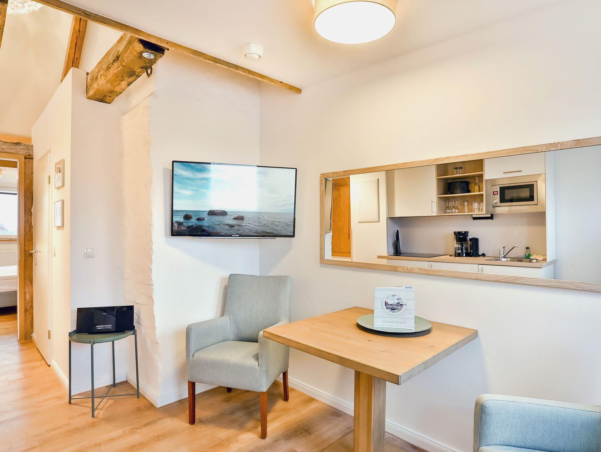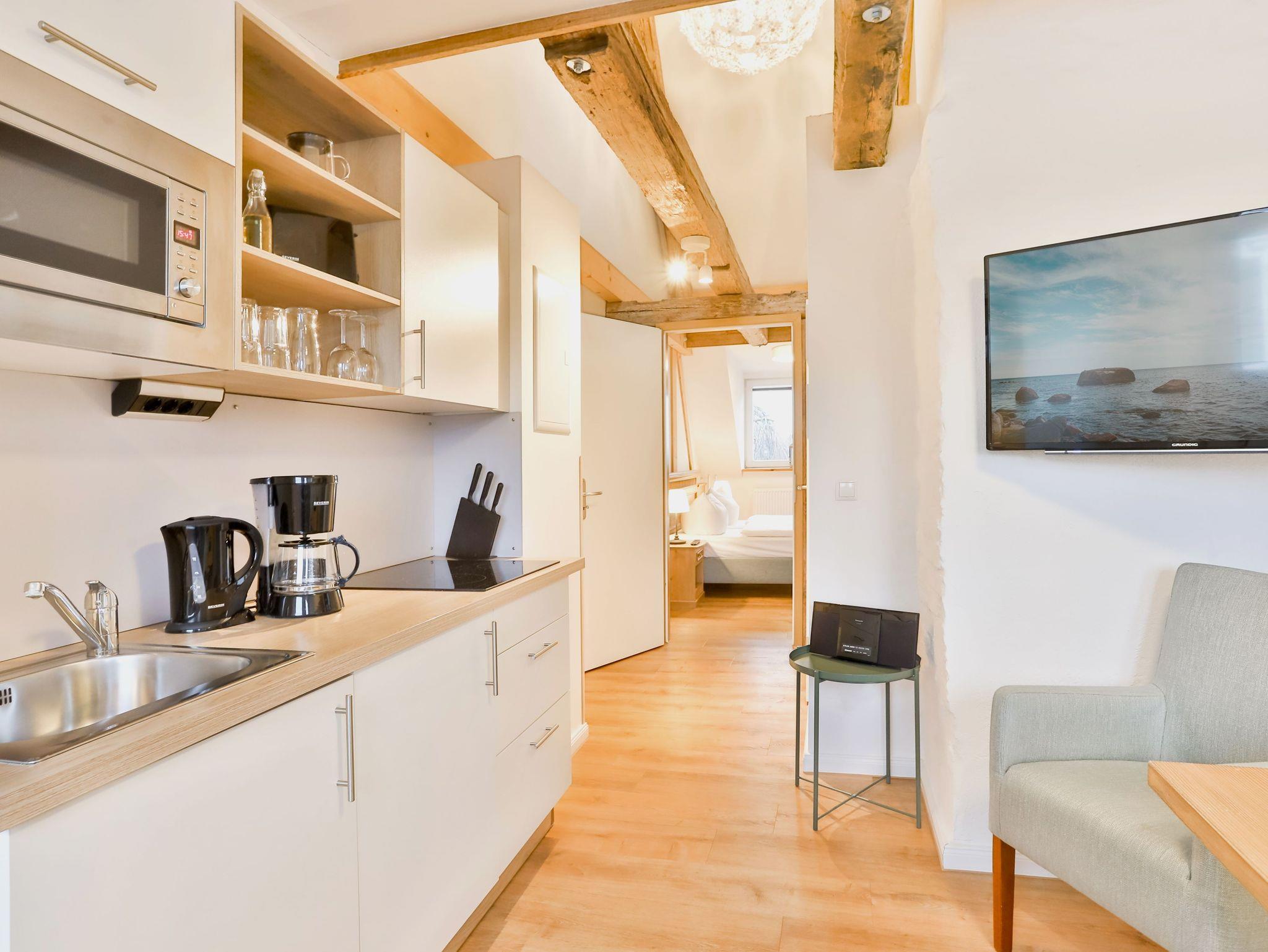 Unsere Zwei-Raum-Apartments Deluxe befinden sich im 3. Obergeschoss und verfügen über ein separates Schlafzimmer mit einem gemütlichen Boxspringbett. Zur Ausstattung gehören eine Sitzecke, TV/Radio, eine praktische Küchenzeile, ein Badezimmer mit Dusche und teilweise ein Balkon zum Innenhof.
