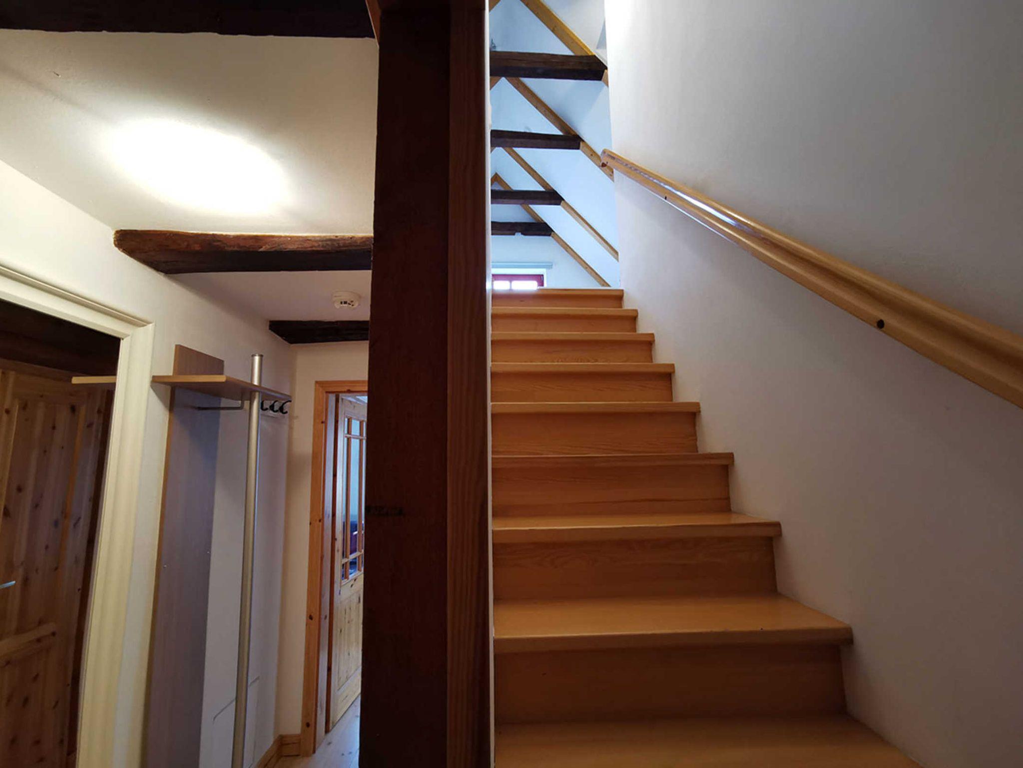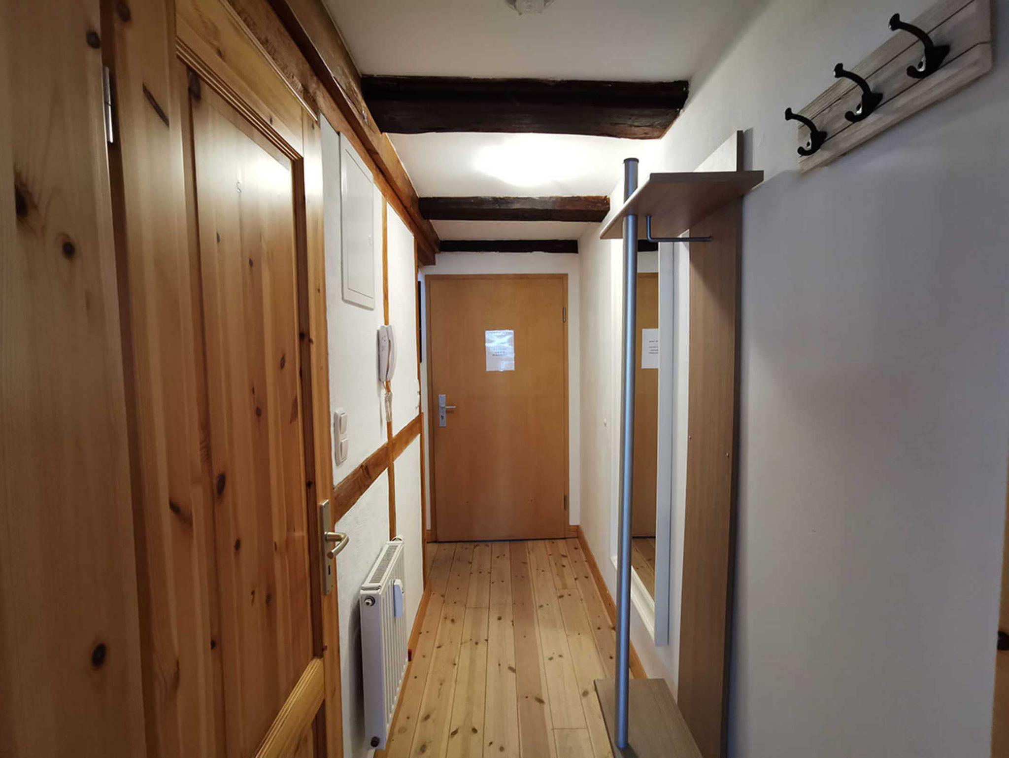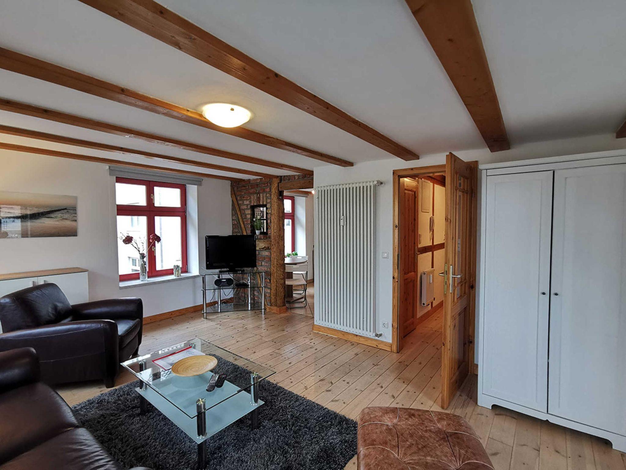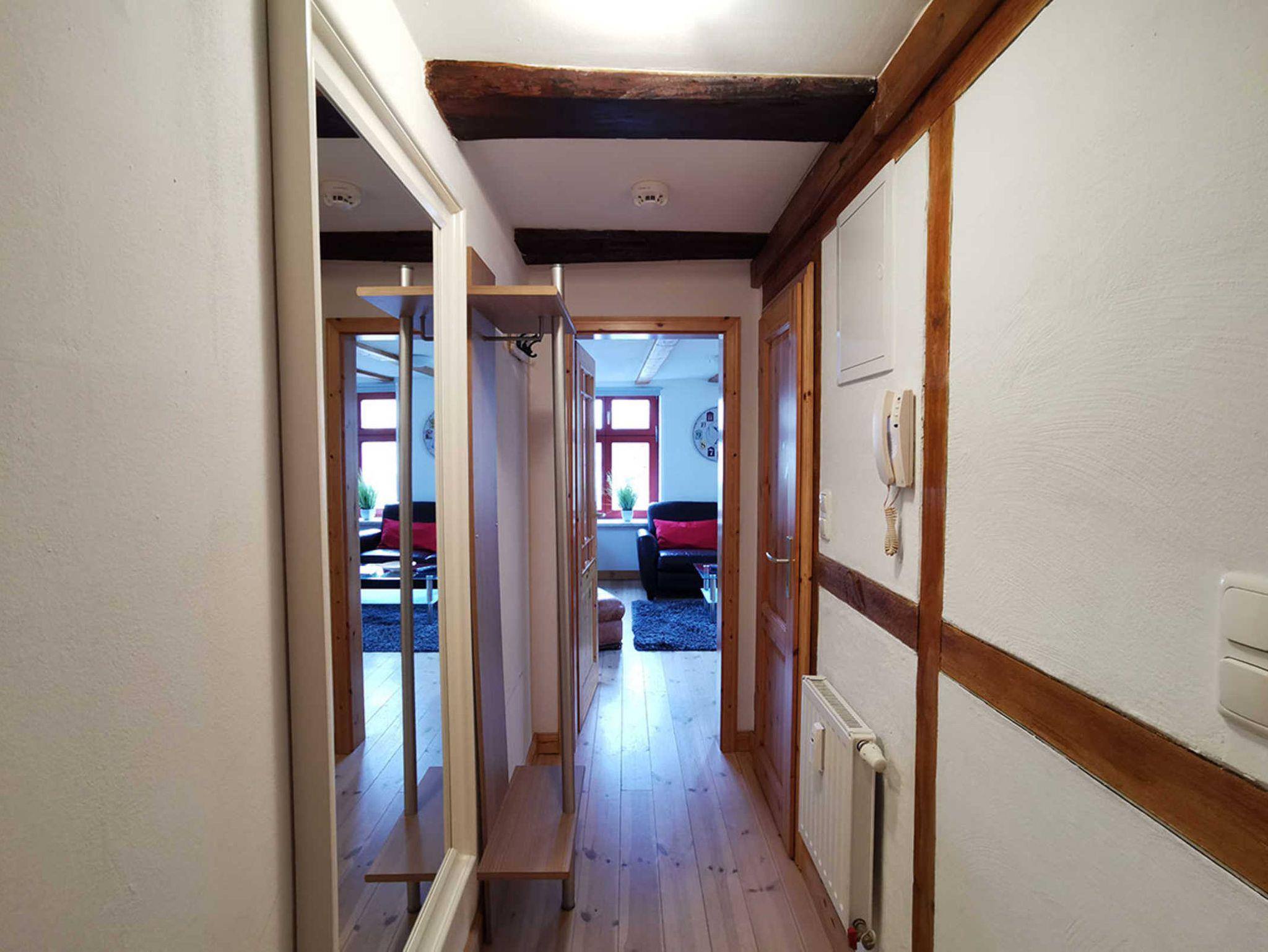 Unsere Ferienwohnung Nordwind 2, ideal für 1 ? 4 Personen, befindet sich in der Langenstraße 41 Ecke Fischmarkt in Stralsund, über 2 Etagen im 1. OG mit Dielen & Fliesen, Küche, offenes Fachwerk, Bad mit Dusche und WC.