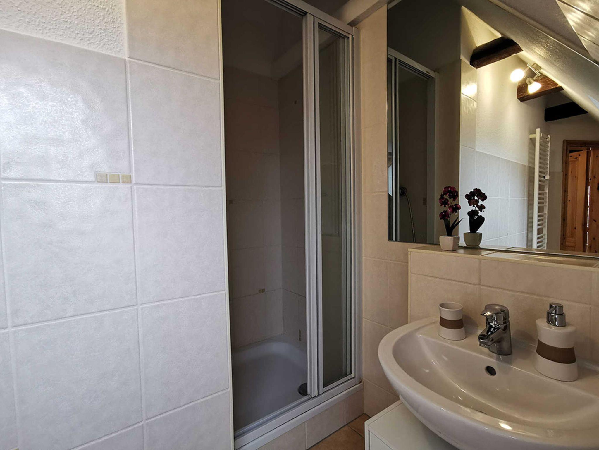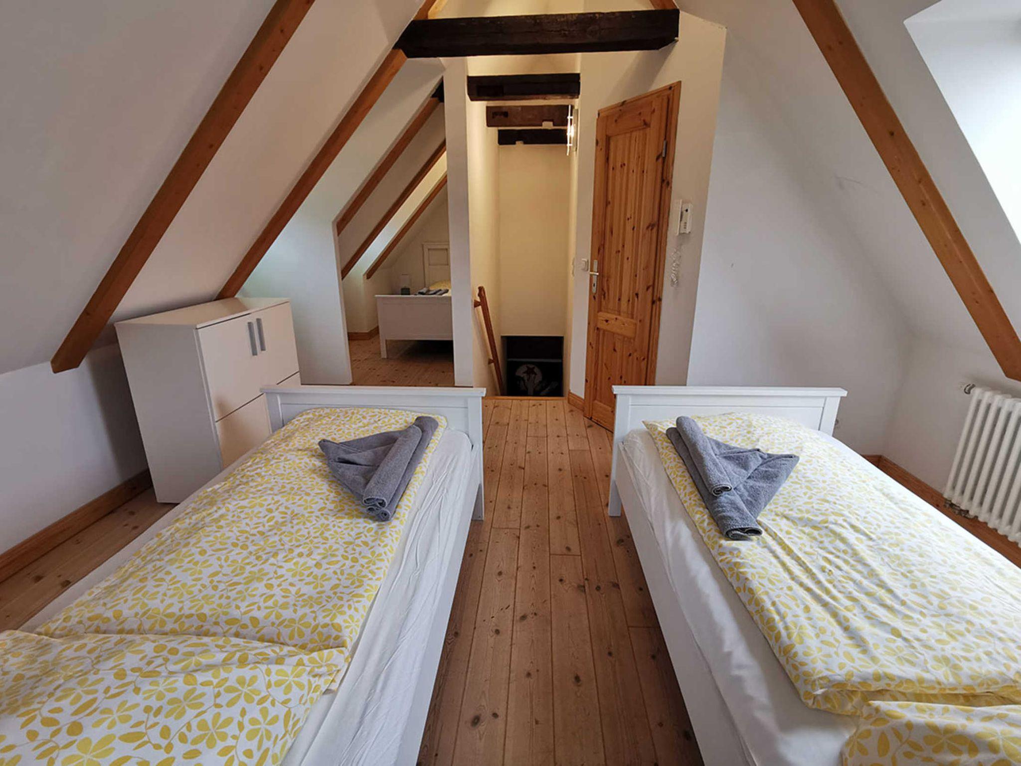 1 Schlafzimmer mit 2 Einzelbetten (können zusammen geschoben werden), 1 kleines Schlafzimmer (offen) mit 1 Bett, Bad mit Dusche