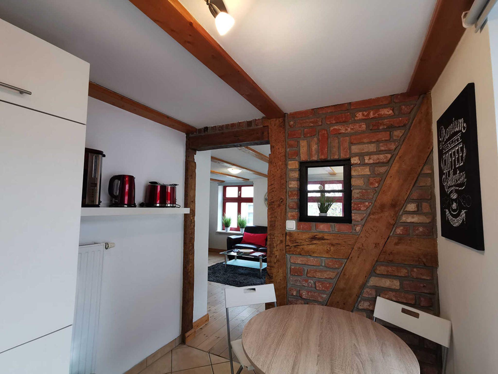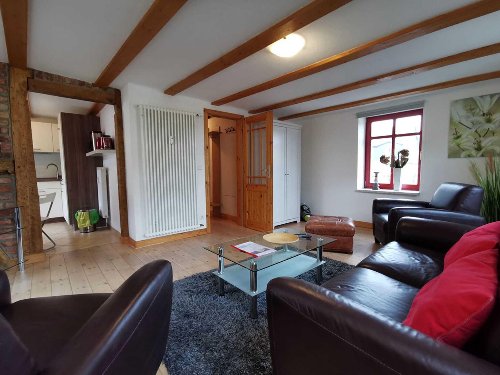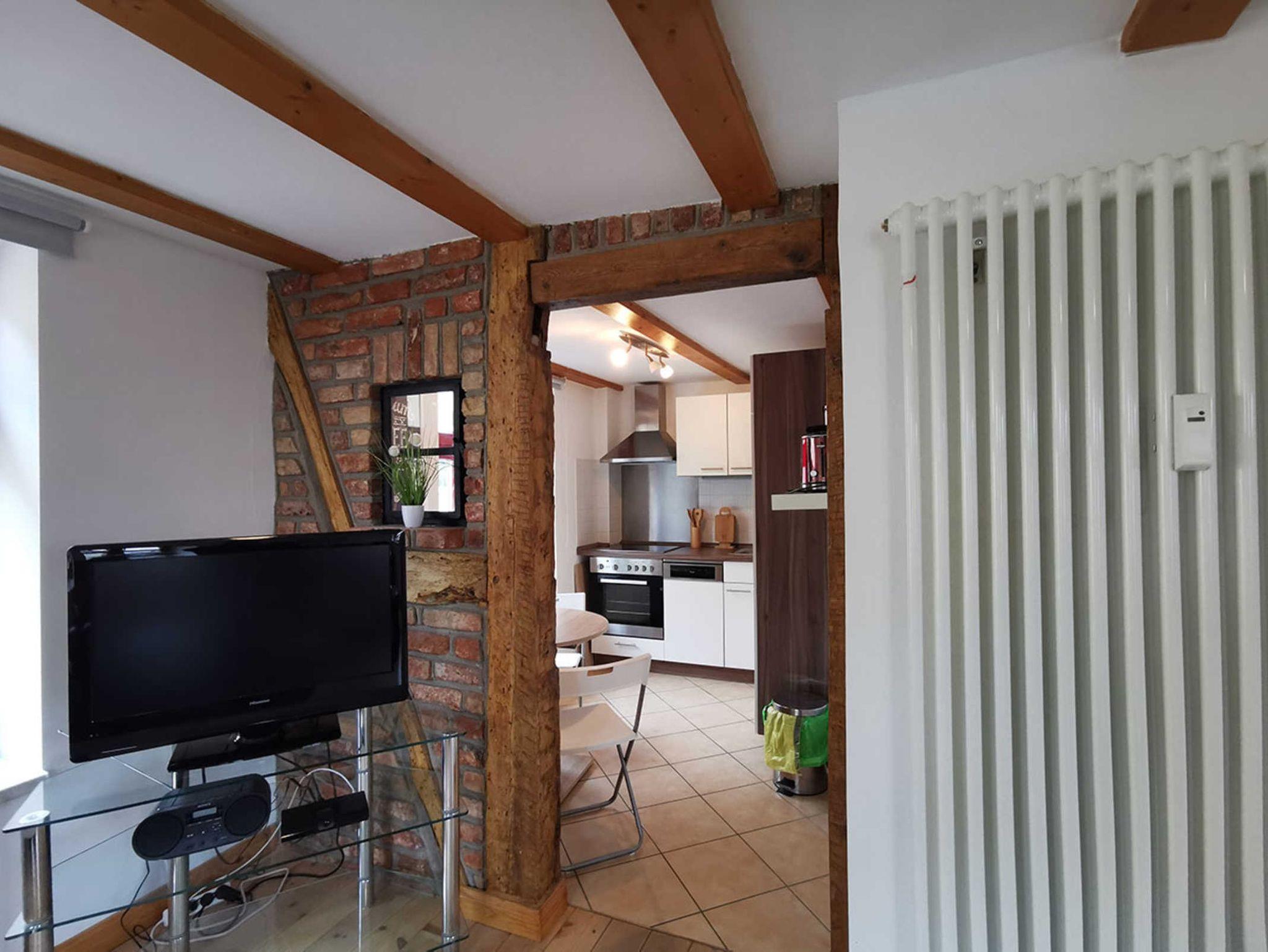 Die FeWo hat Dielen und Fliesen, eine toll eingerichtete Küche, ein offenes Fachwerk. Das Bad ist mit Dusche und WC im modernen Design.
