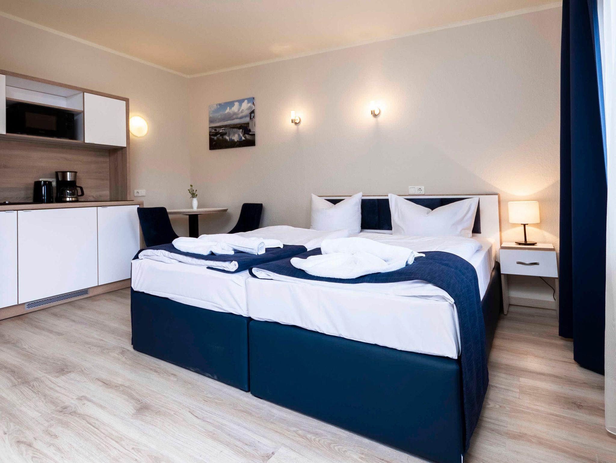 Modernes und ruhiges Studio M im Aparthotel Stralsund, zentral und frisch renoviert, mit Küche und WLAN nah am Stadtzentrum.