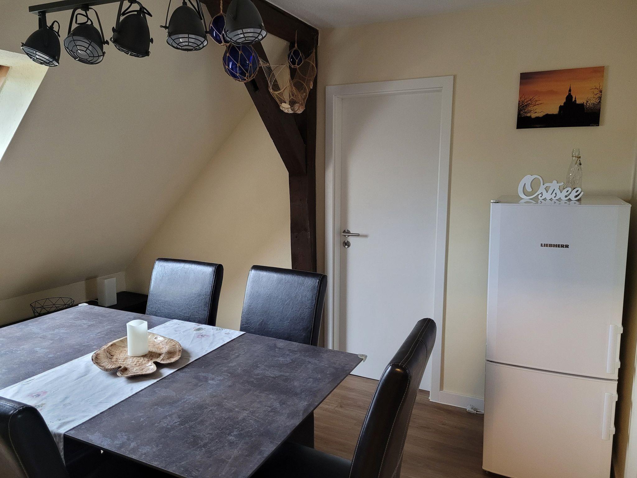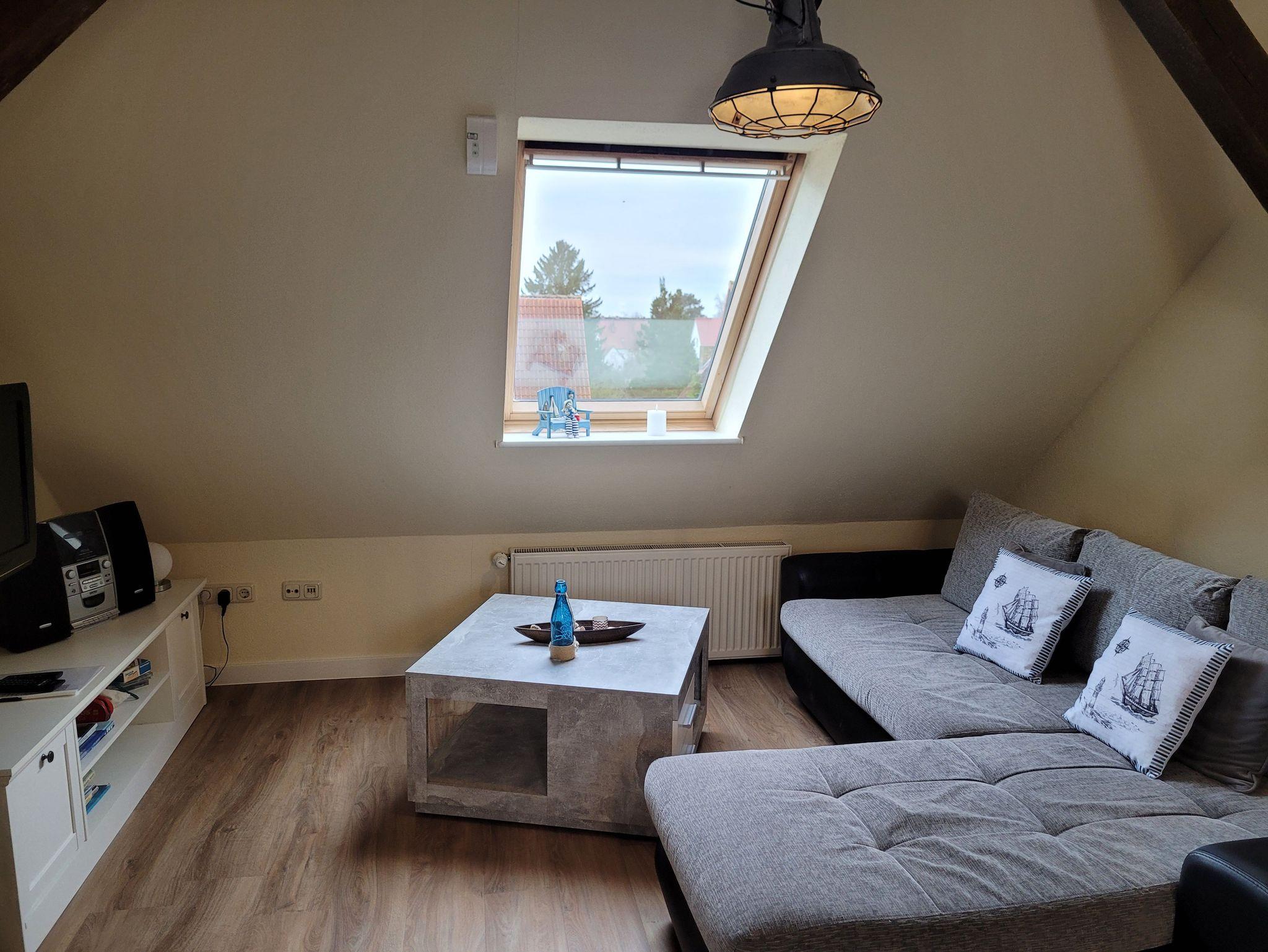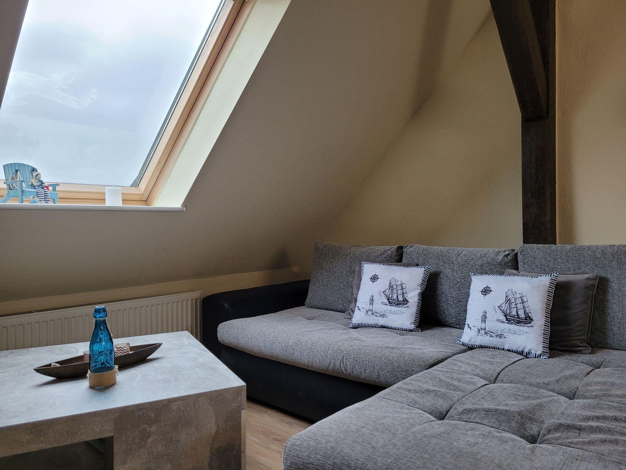 Unsere Ferienwohnung ist 56 qm groß und liegt im Dachgeschoss unseres Hauses. Sie verfügt über einen kombinierten Wohn-/Schlafraum (ausziehbare Couch für 2 Personen) mit Smart-TV, Internet, ein Schlafzimmer mit Doppelbett (1,40 Meter Breite), ein Schlafzimmer mit zwei Einzelbetten, einer offenen Küche mit alltäglichen elektrischen Geräten und einem großen Esstisch, einem Badezimmer mit Dusche und WC. Auf dem Hof besteht die Möglichkeit zu grillen. Dort ist eine gemütliche Chill-Ecke vorhanden.