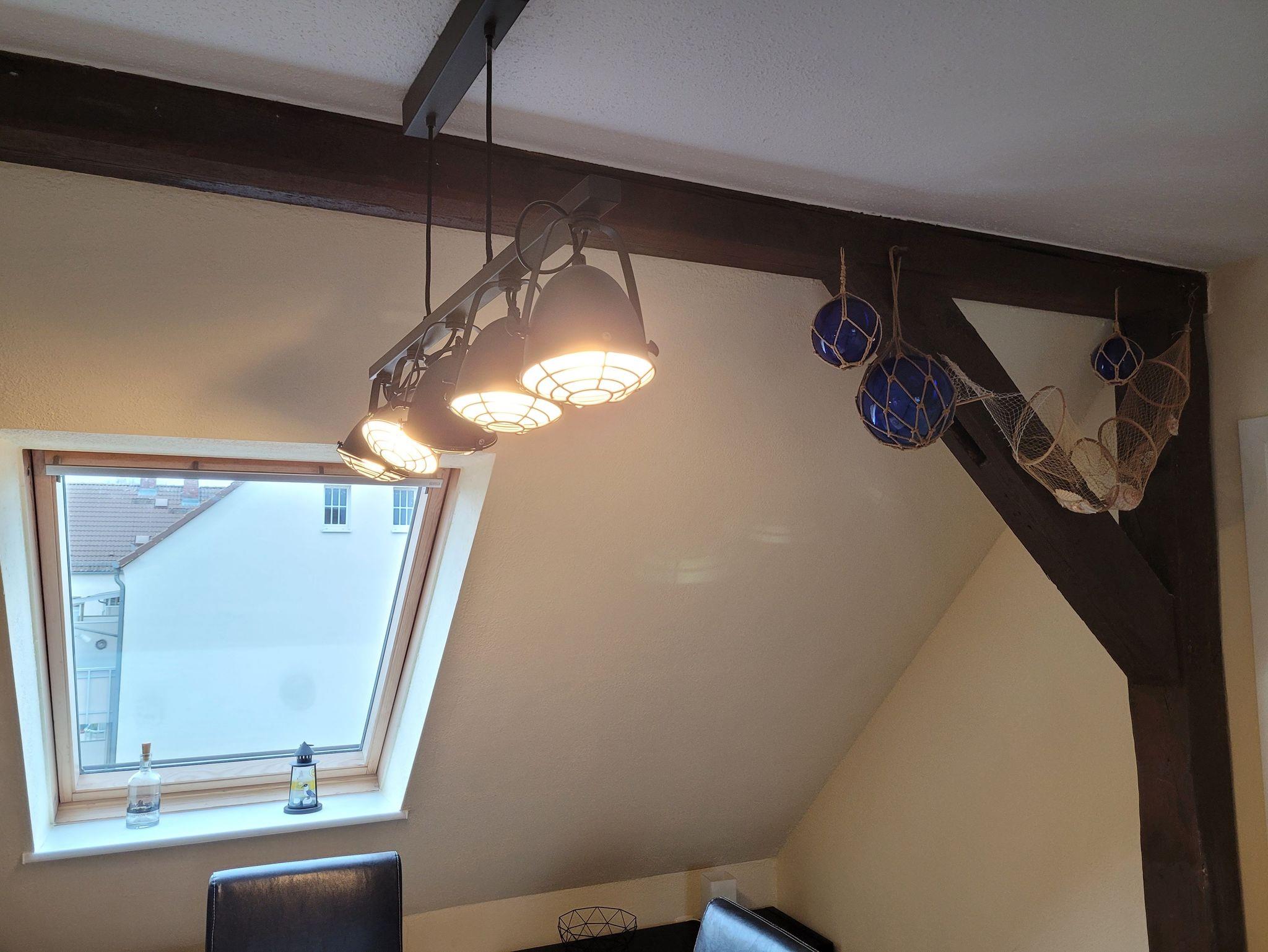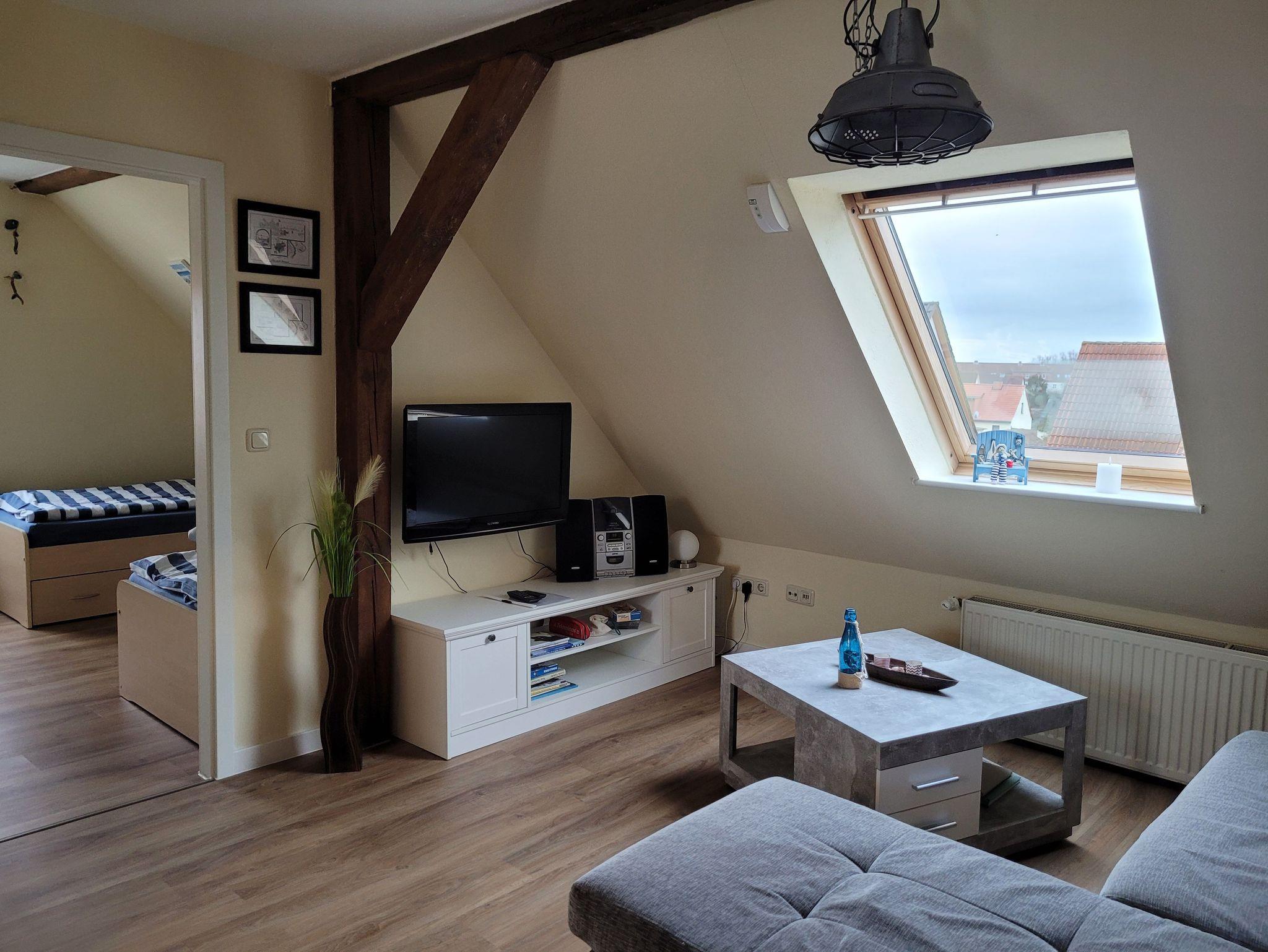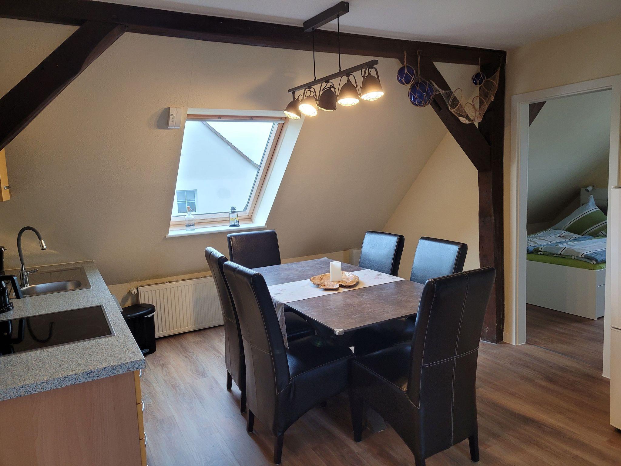 Unsere Ferienwohnung ist 56 qm groß und liegt im Dachgeschoss unseres Hauses. Sie verfügt über einen kombinierten Wohn-/Schlafraum (ausziehbare Couch für 2 Personen) mit Smart-TV, Internet, ein Schlafzimmer mit Doppelbett (1,40 Meter Breite), ein Schlafzimmer mit zwei Einzelbetten, einer offenen Küche mit alltäglichen elektrischen Geräten und einem großen Esstisch, einem Badezimmer mit Dusche und WC. Auf dem Hof besteht die Möglichkeit zu grillen. Dort ist eine gemütliche Chill-Ecke vorhanden.