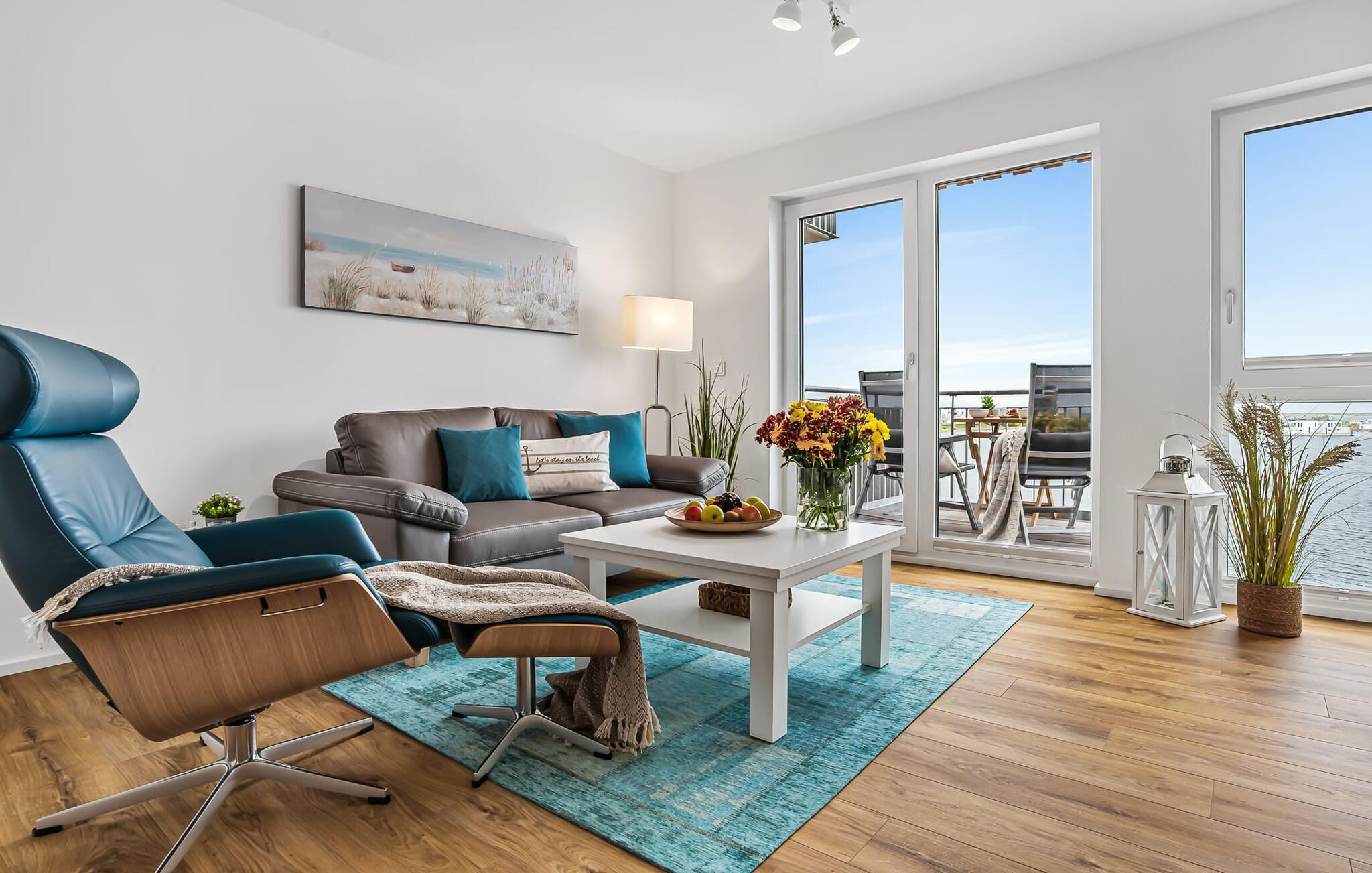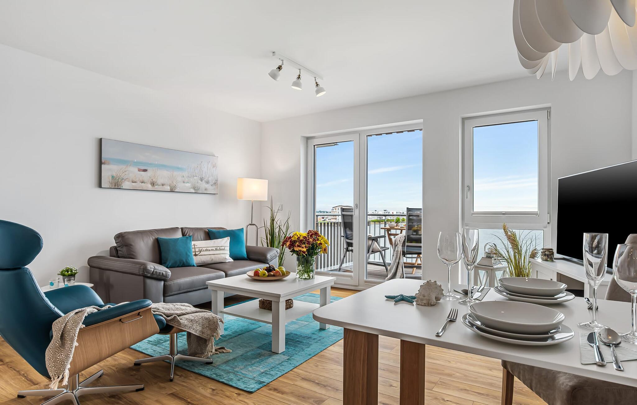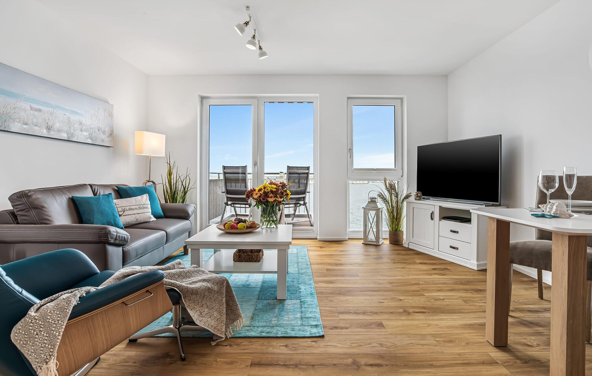 Moderne Ferienwohnung in Olpenitz mit Hafenblick, Balkon und Nähe zum Strand – ideal für Paare mit Hund.