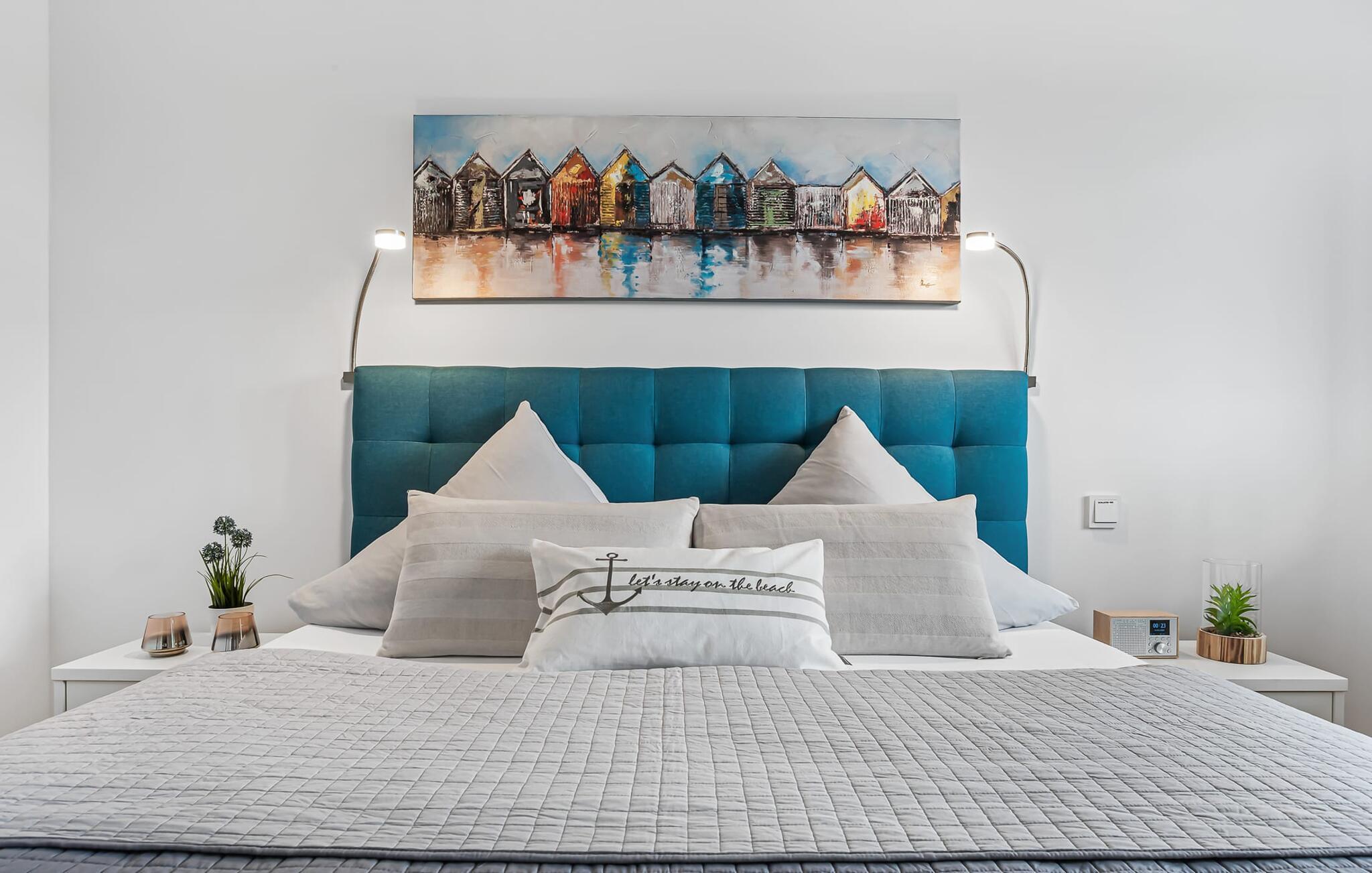 Im Schlafzimmer verspricht ein komfortables Doppelboxspringbett erholsamen Schlaf und ein Fernseher bringt, wenn gewünscht, die letzten Nachrichten.