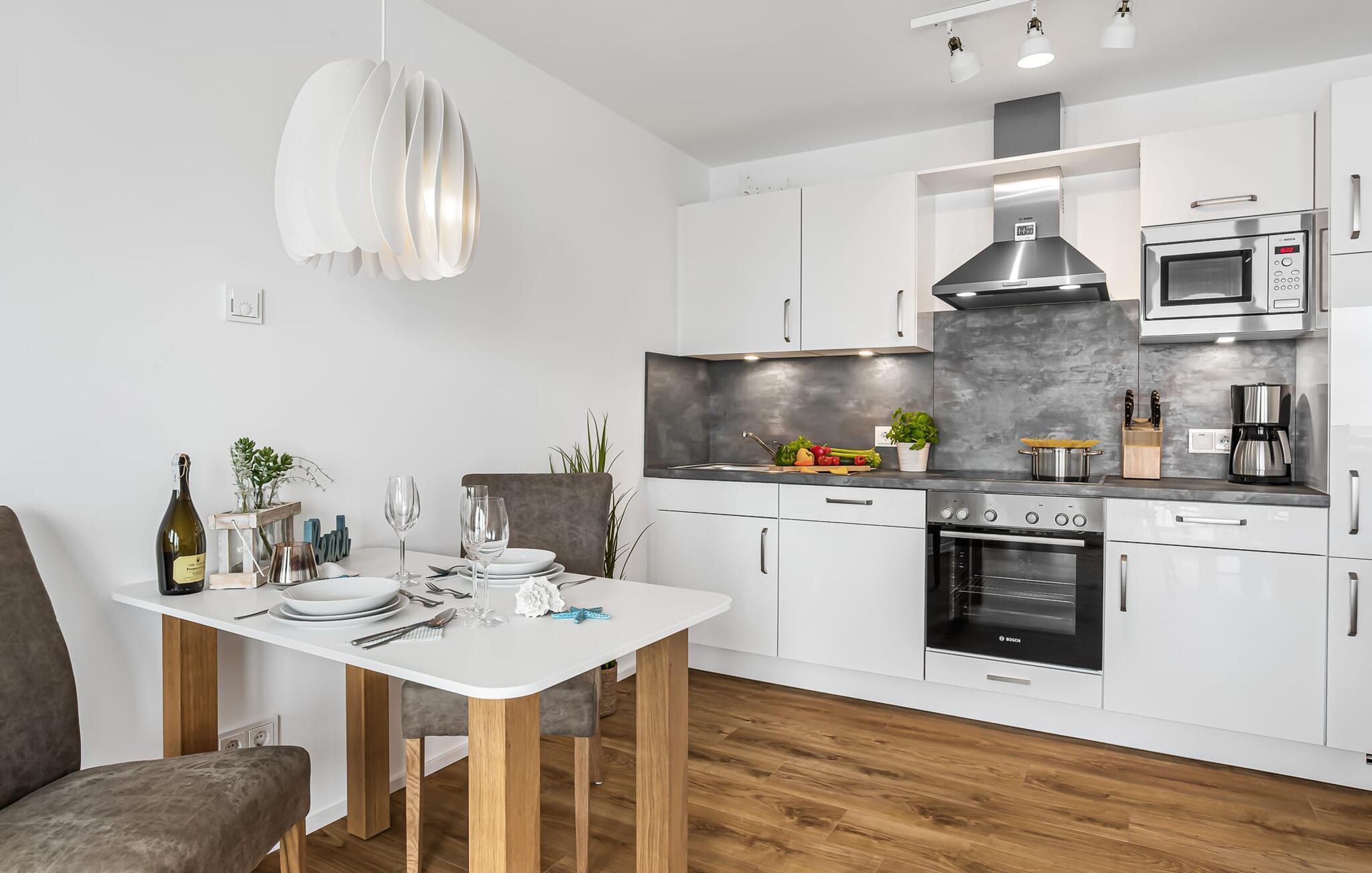 Die perfekt ausgestattete Küchenzeile lässt keine Wünsche offen und Mahlzeiten zuzubereiten macht Spaß, denn der Blick über Hafen, die schwimmenden Häuser und die entfernte Ostsee begleitet den Koch ununterbrochen. Das Essen oder eine Kaffee mit frisch aufgeschäumter Milch dann später auf dem Balkon zu genießen, ist ganz ohne Frage ein Urlaubserlebnis der besonderen Art.