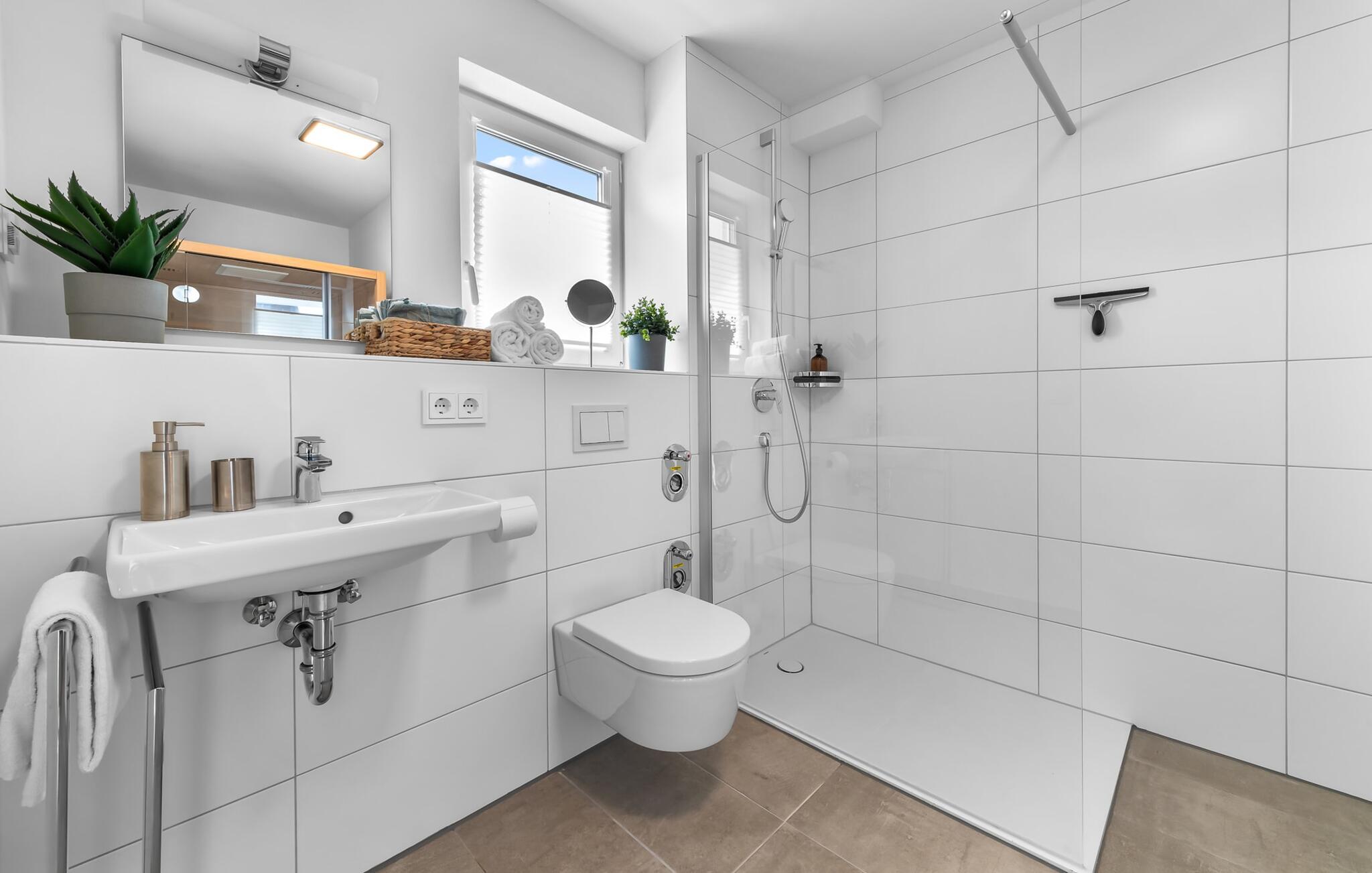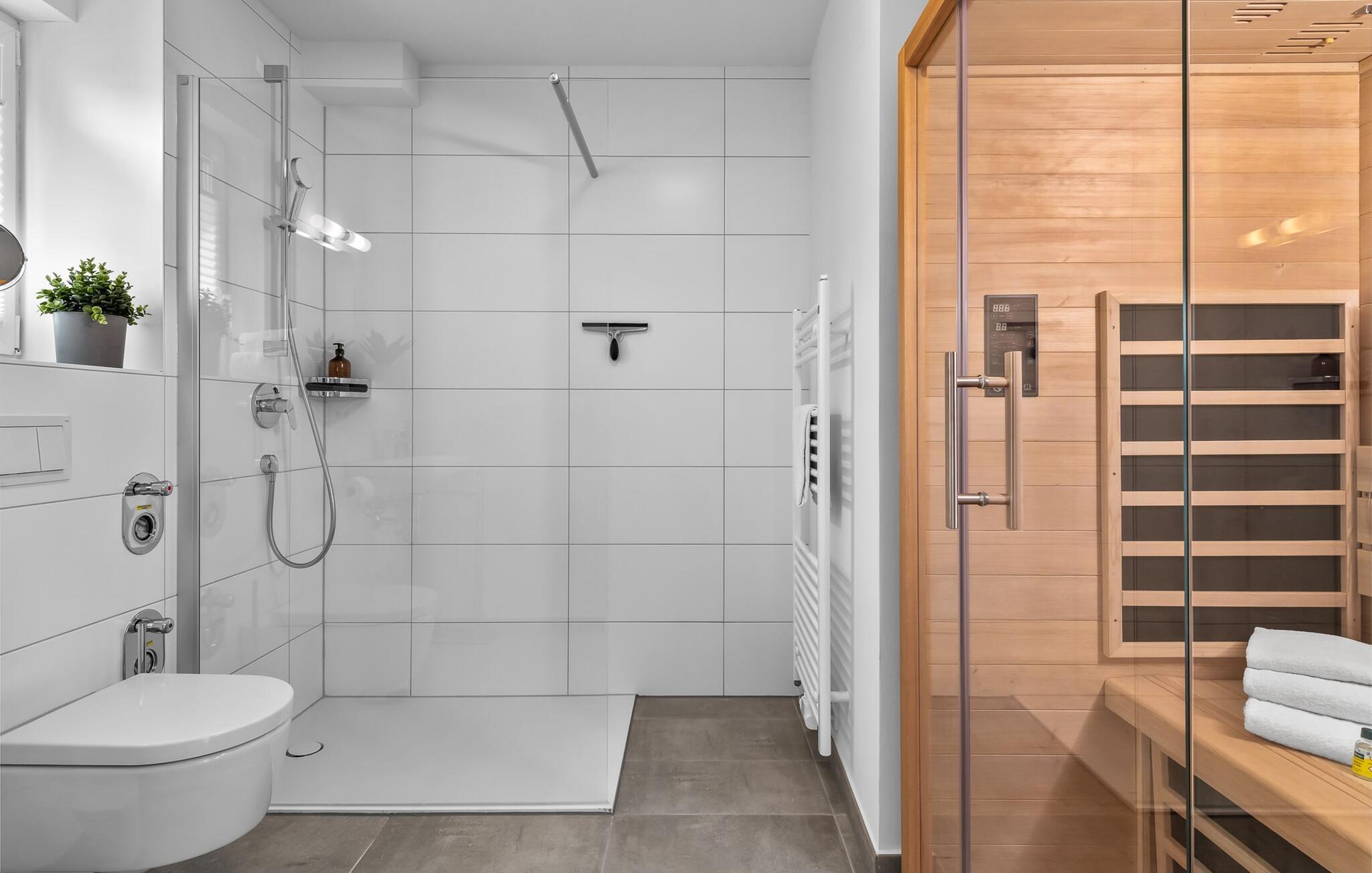 Das Highlight des Badezimmers ist die bodengleiche Dusche und die Infrarot-Sauna, die für entspannende Momente nach einem erlebnisreichen Urlaubstag sorgen.