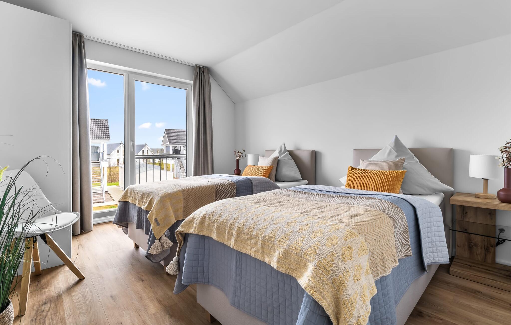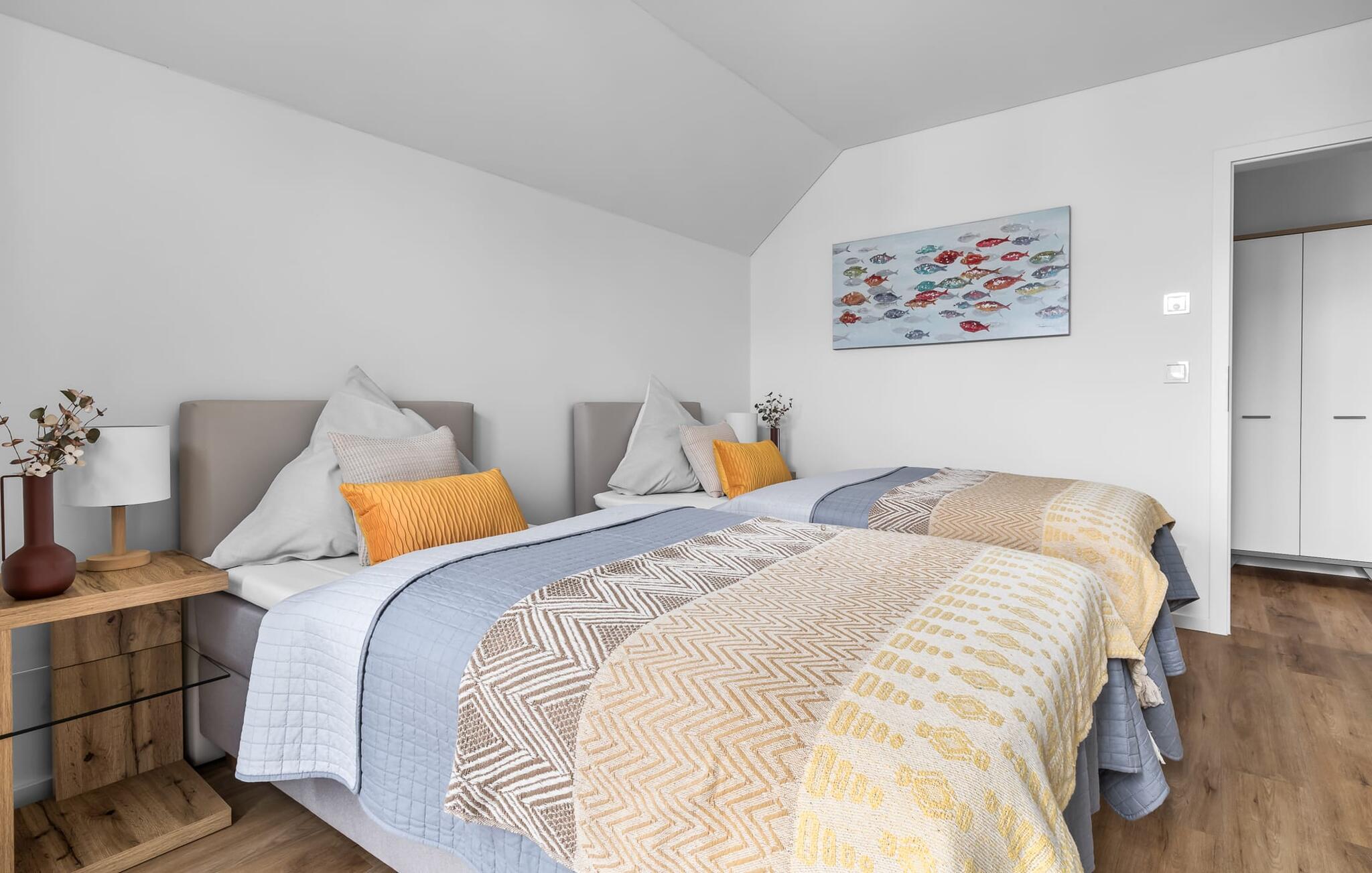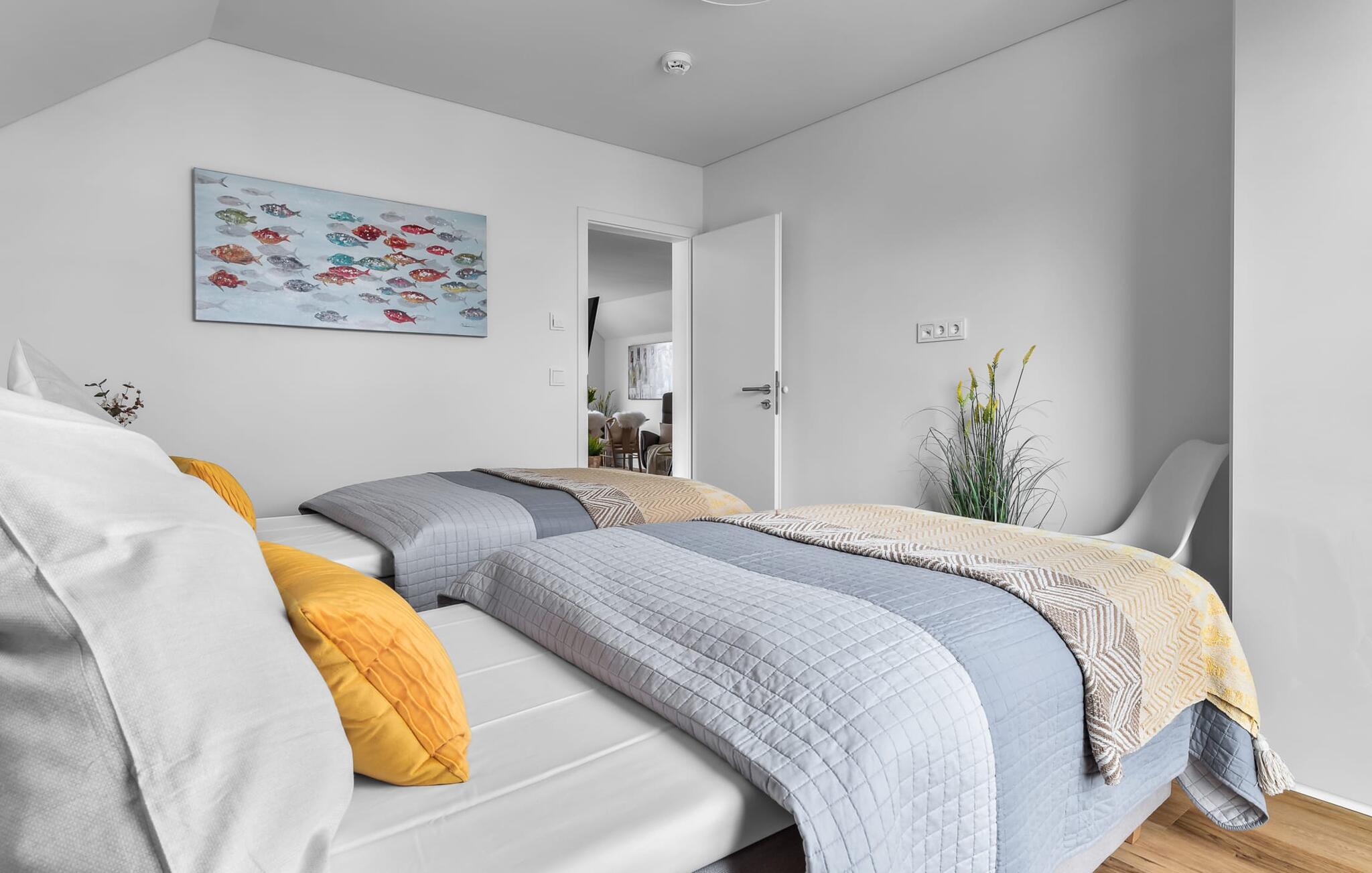 Für erholsamen Schlaf stehen euch zwei Schlafzimmer zur Verfügung. Das erste Schlafzimmer verfügt über ein komfortables Doppelboxspringbett sowie einen eigenen Fernseher. Im zweiten Schlafzimmer findet ihr zwei Einzelboxspringbetten. Alle Zimmer können dank Plissees und Vorhängen komplett abgedunkelt werden.