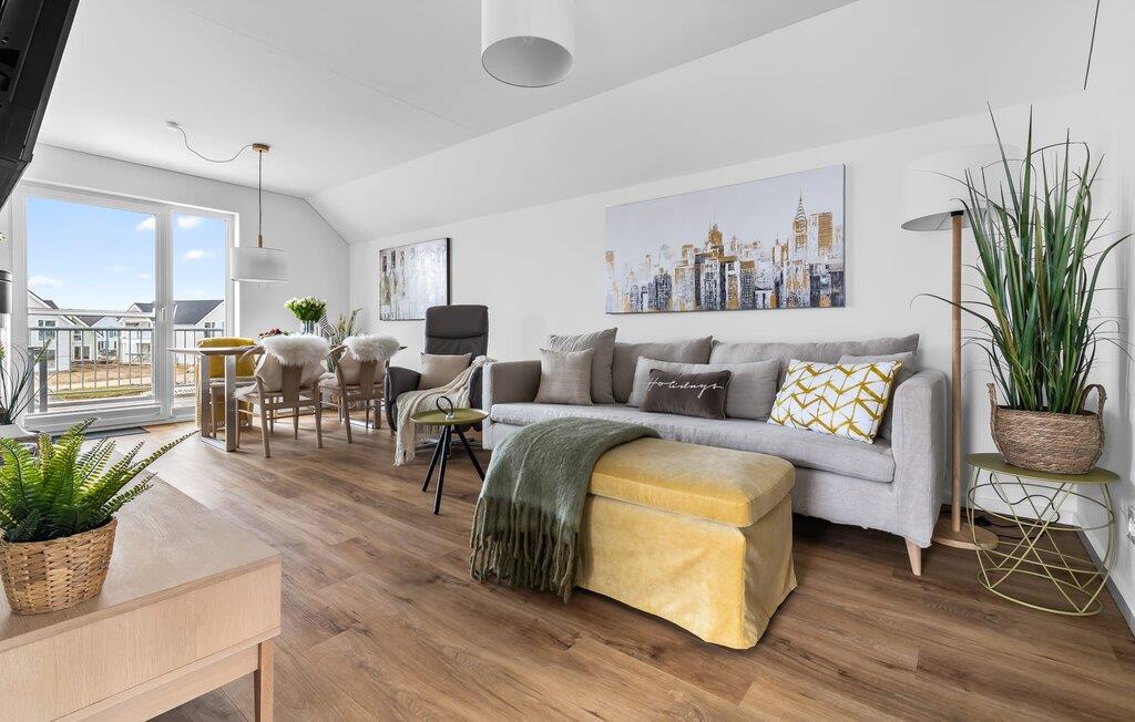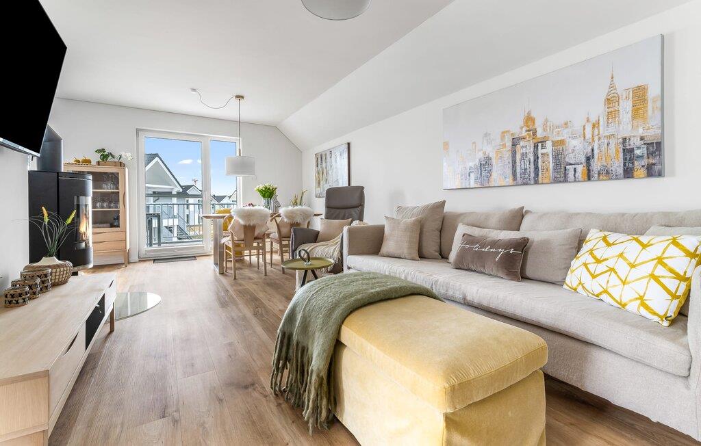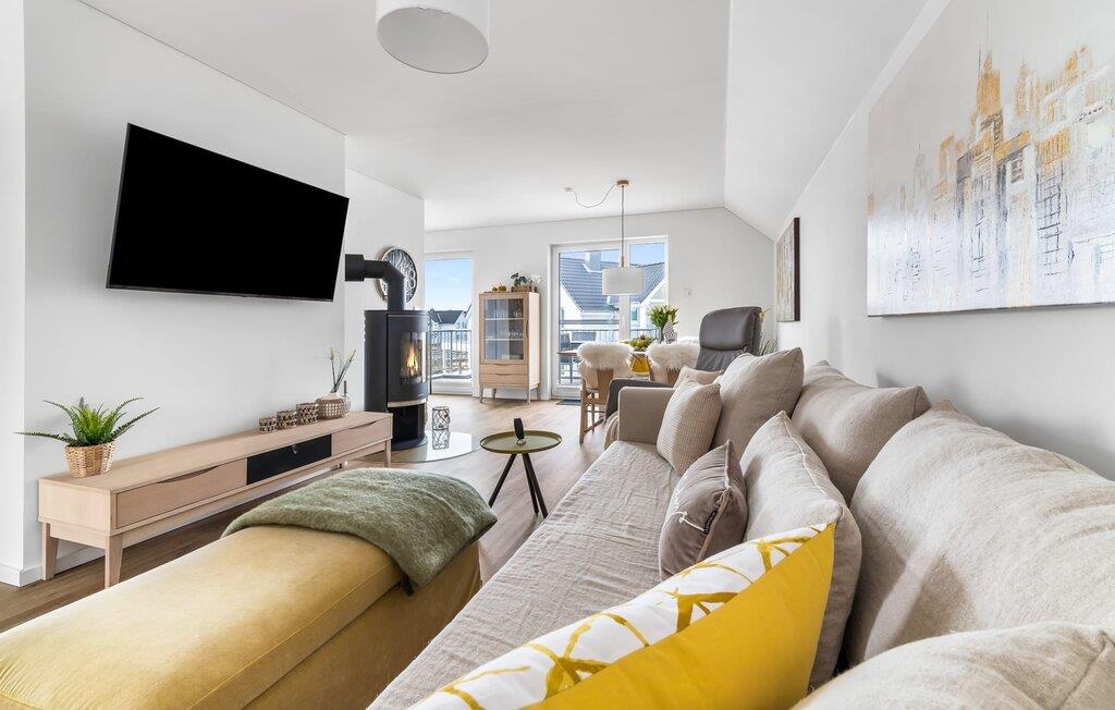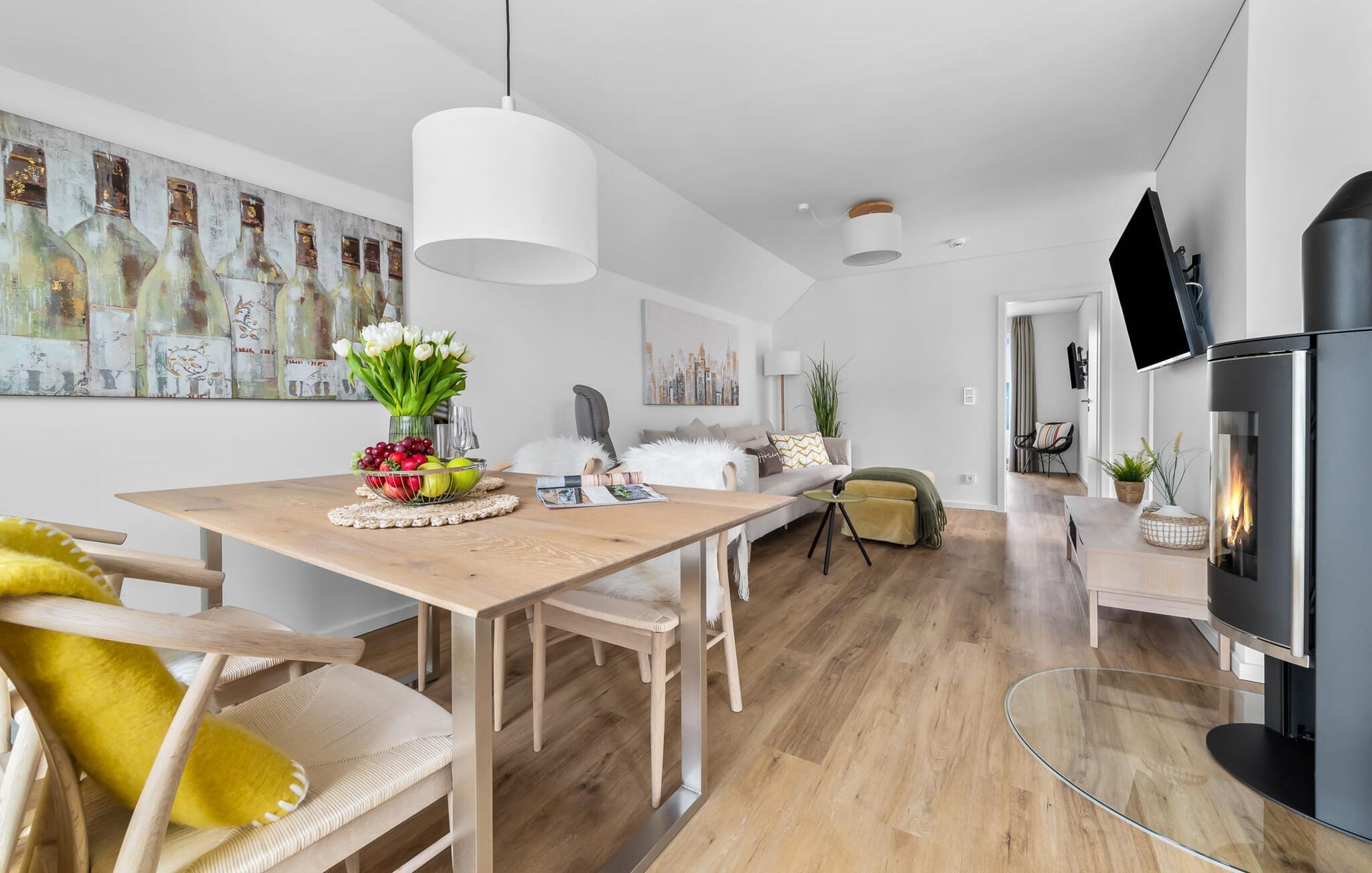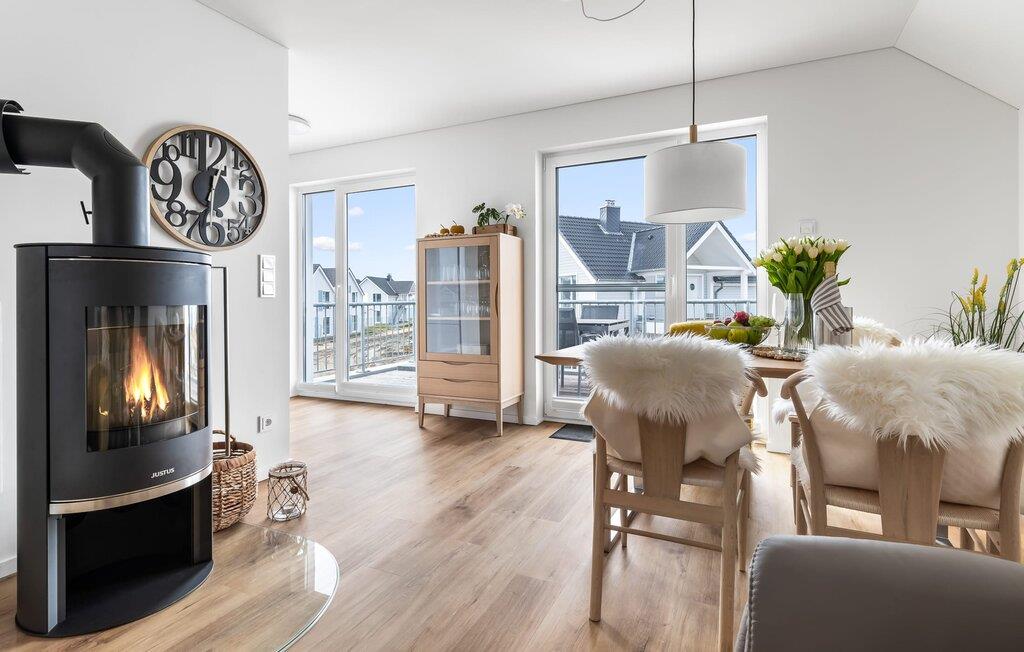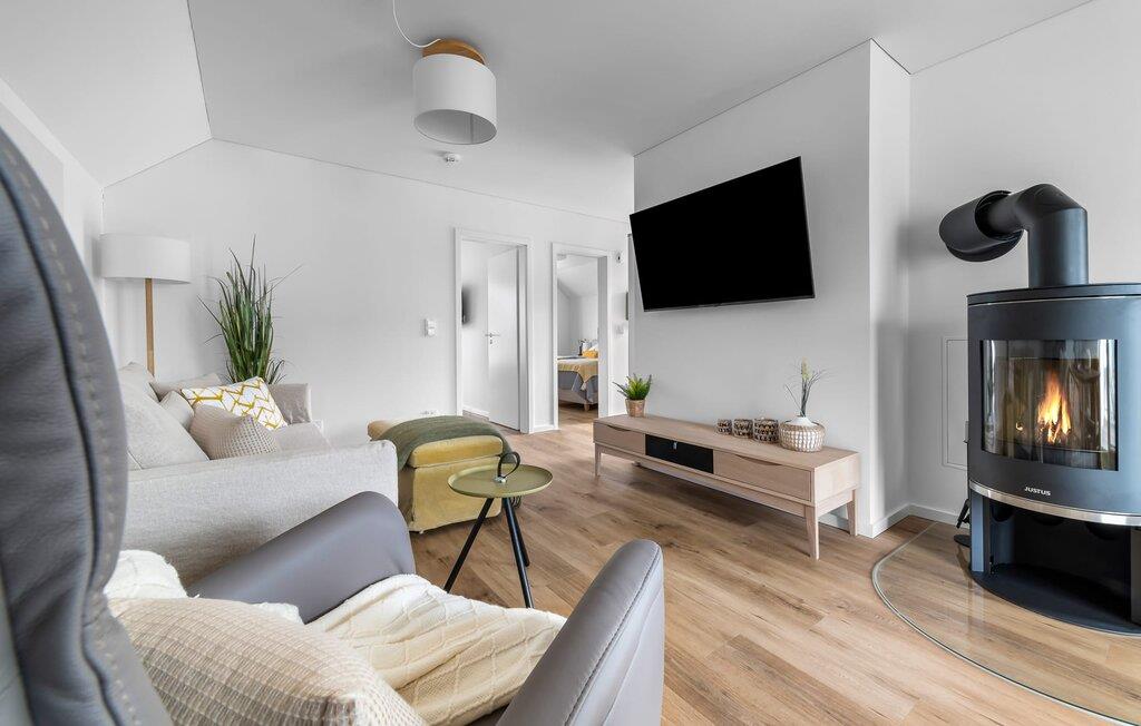 Moderne Ferienwohnung an der Ostsee mit Kamin, Terrasse und Infrarotsauna für erholsame Urlaubstage.
