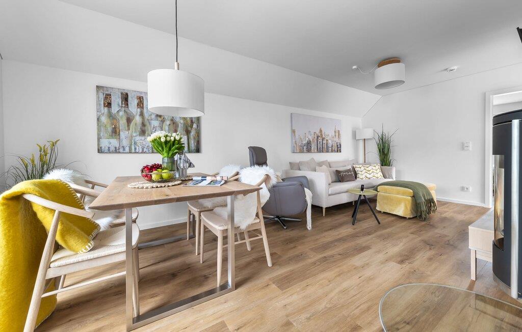 Der einladende Wohnbereich empfängt euch mit bodentiefen Fensterfronten, die für eine helle und freundliche Atmosphäre sorgen. Genießt entspannte Abende auf dem kuscheligen Sofa vor dem knisternden Kamin, während ihr in einem guten Buch versinkt. Der Fernseher im Wohnzimmer bietet Unterhaltung für die ganze Familie.