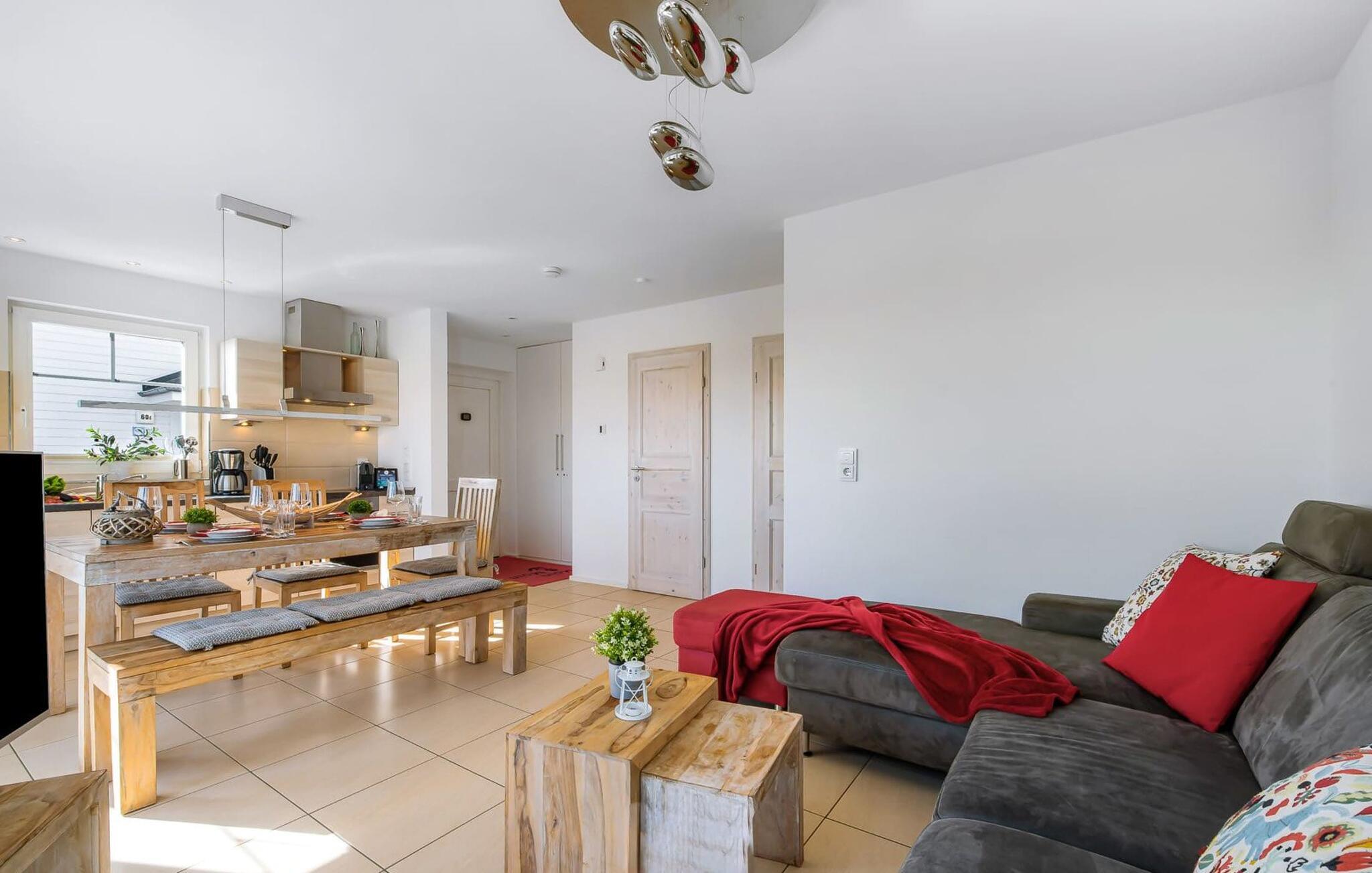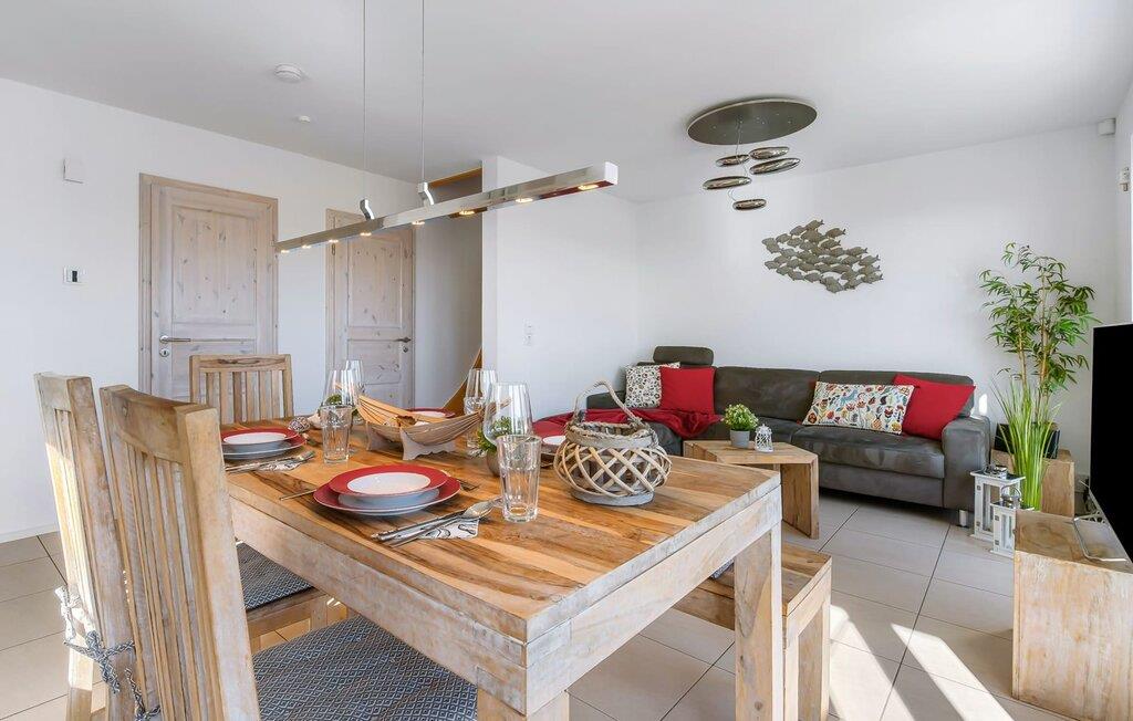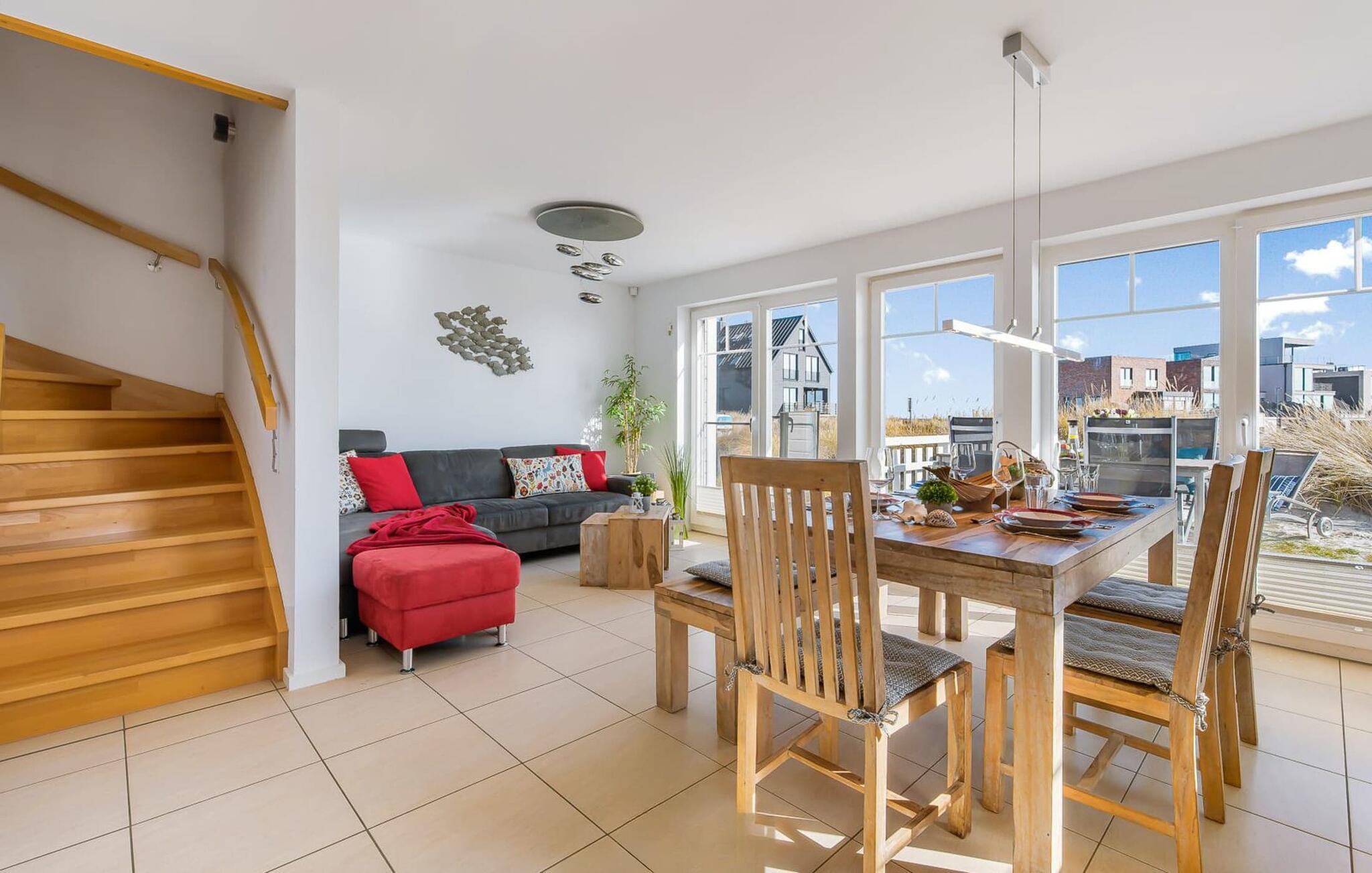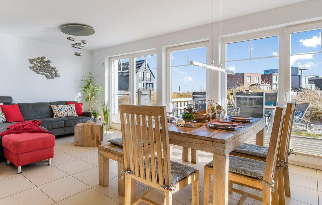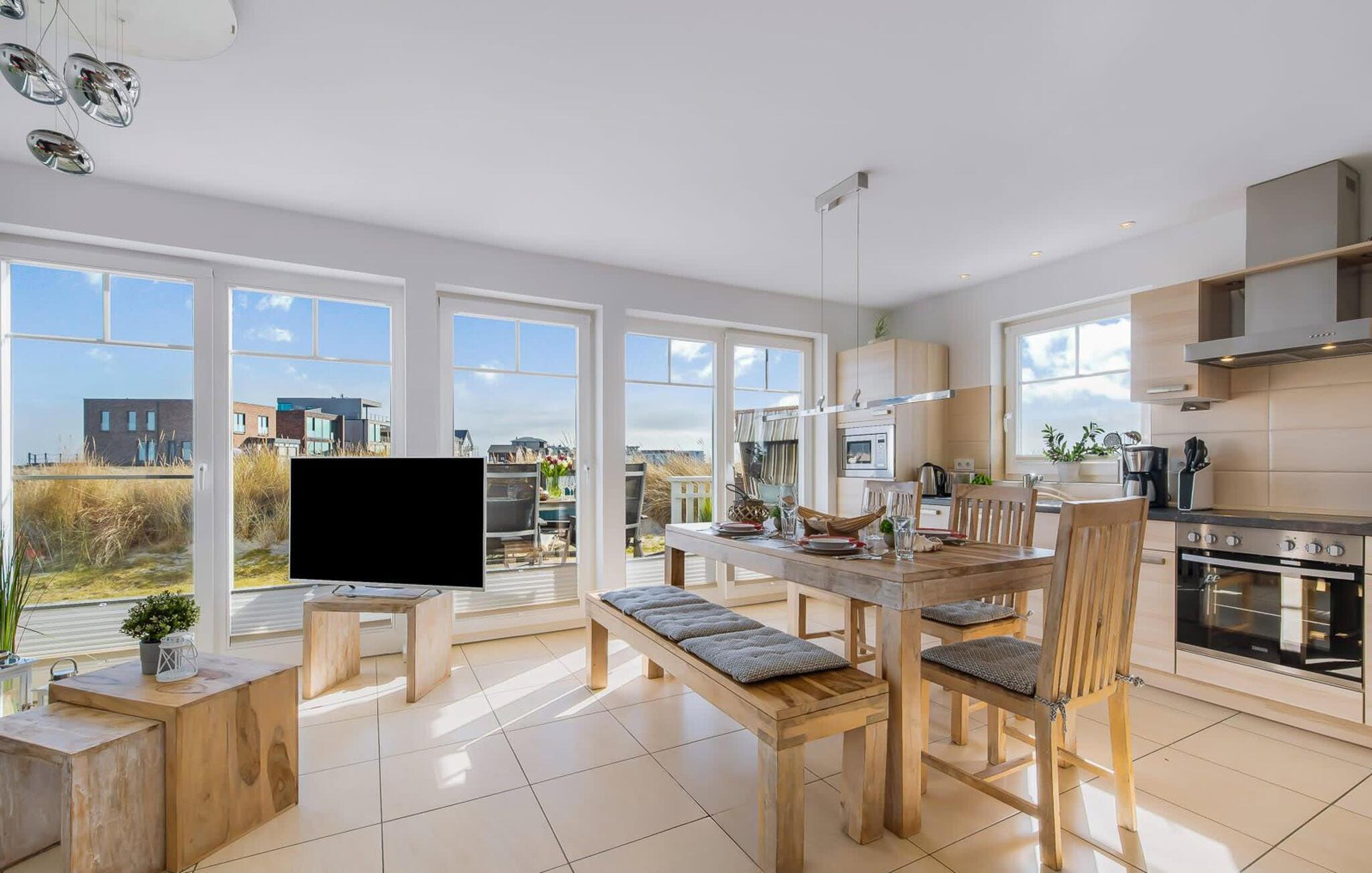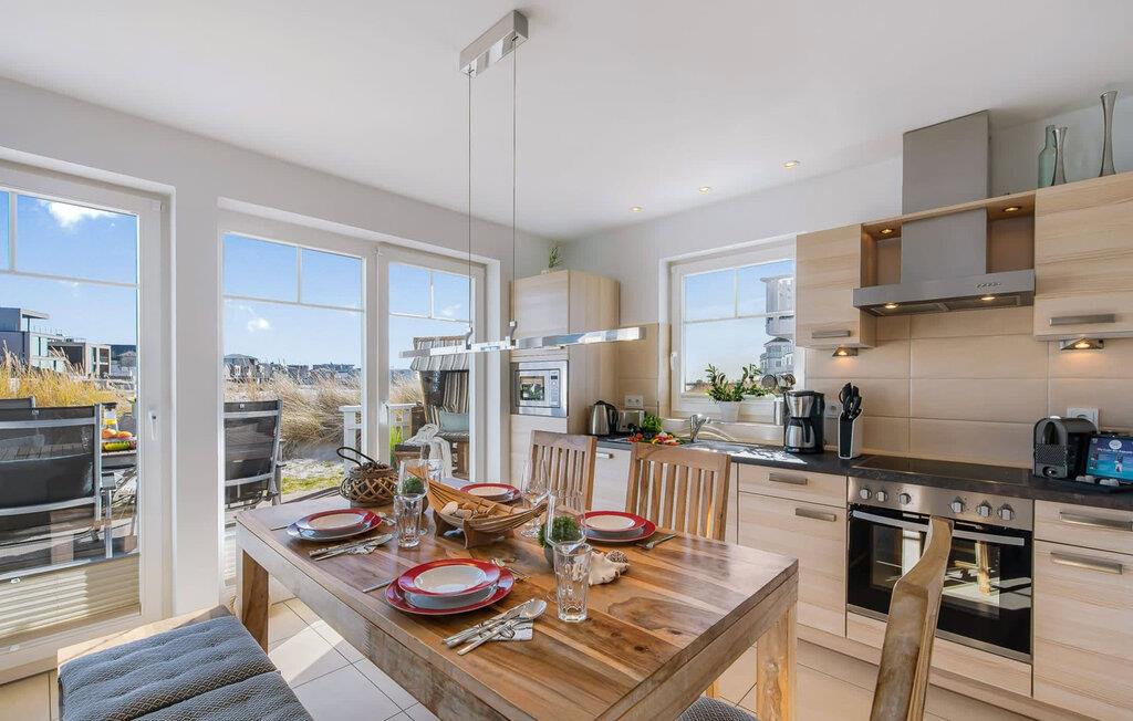 In dem großzügigen Wohn-/Essbereich mit bodentiefen Fenstern und Blick auf den weißen Sandstrand der Bucht findet man viel Raum und Behaglichkeit für das Zusammensein über den ganzen Tag. Auf der vorgelagerten Terrasse geht im Strandkorb und am Gartentisch das Urlaubsleben nahtlos weiter. Der seicht abfallende und wellengeschützte Strandbereich ist von hier über einen Holzsteg direkt erreichbar. Die vollausgestattete Küche ermöglicht den gewünschten Komfort.