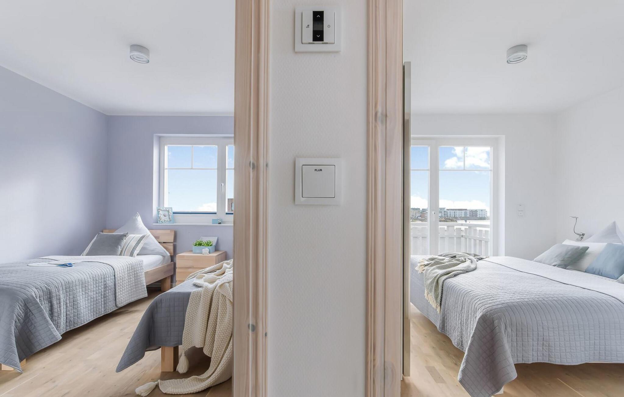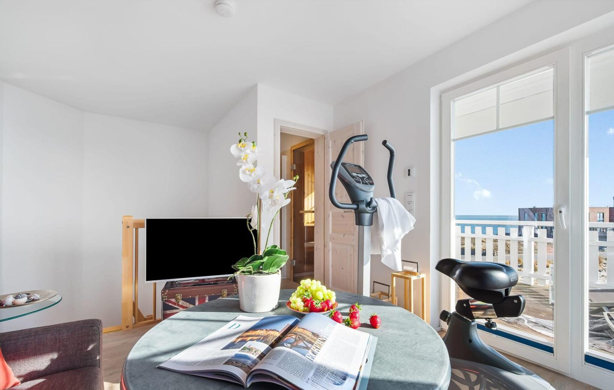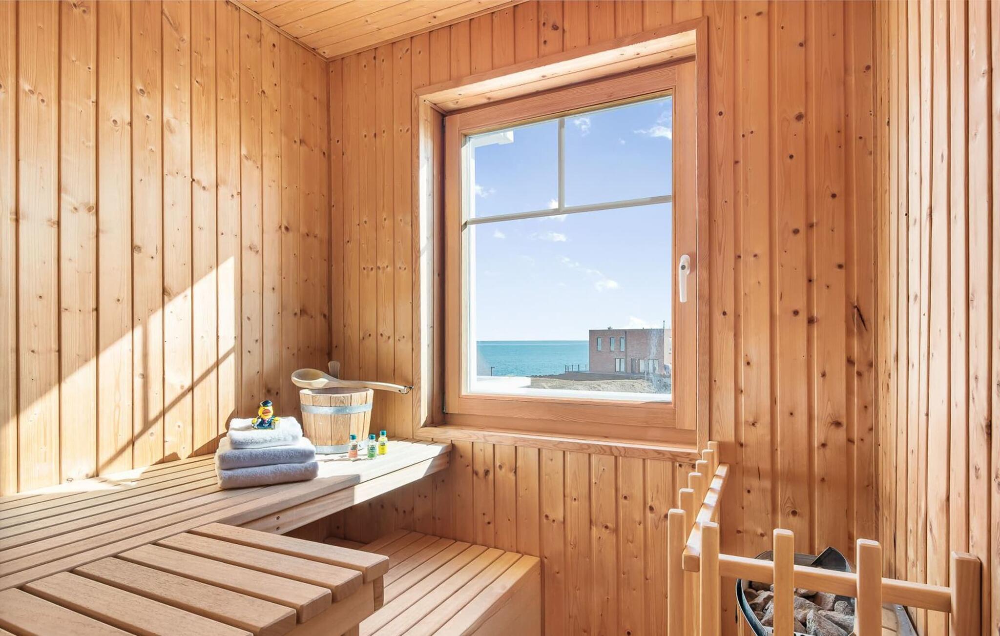 Das zweite Obergeschoss bietet eine finnische Sauna mit Fenster auf die Ostsee hinaus und eine Dusche für ein Rundum- Wellnessgefühl. Im angrenzenden Studio befindet sich eine Schlafmöglichkeit für eine weitere Person und ein zusätzliches TV. Die umlaufende Dachterrasse mit einem weiten Ausblick auf die Ostsee und den Hafen des Resorts lädt mit komfortablen Sonnenliegen zum verdienten Entspannen ein.
