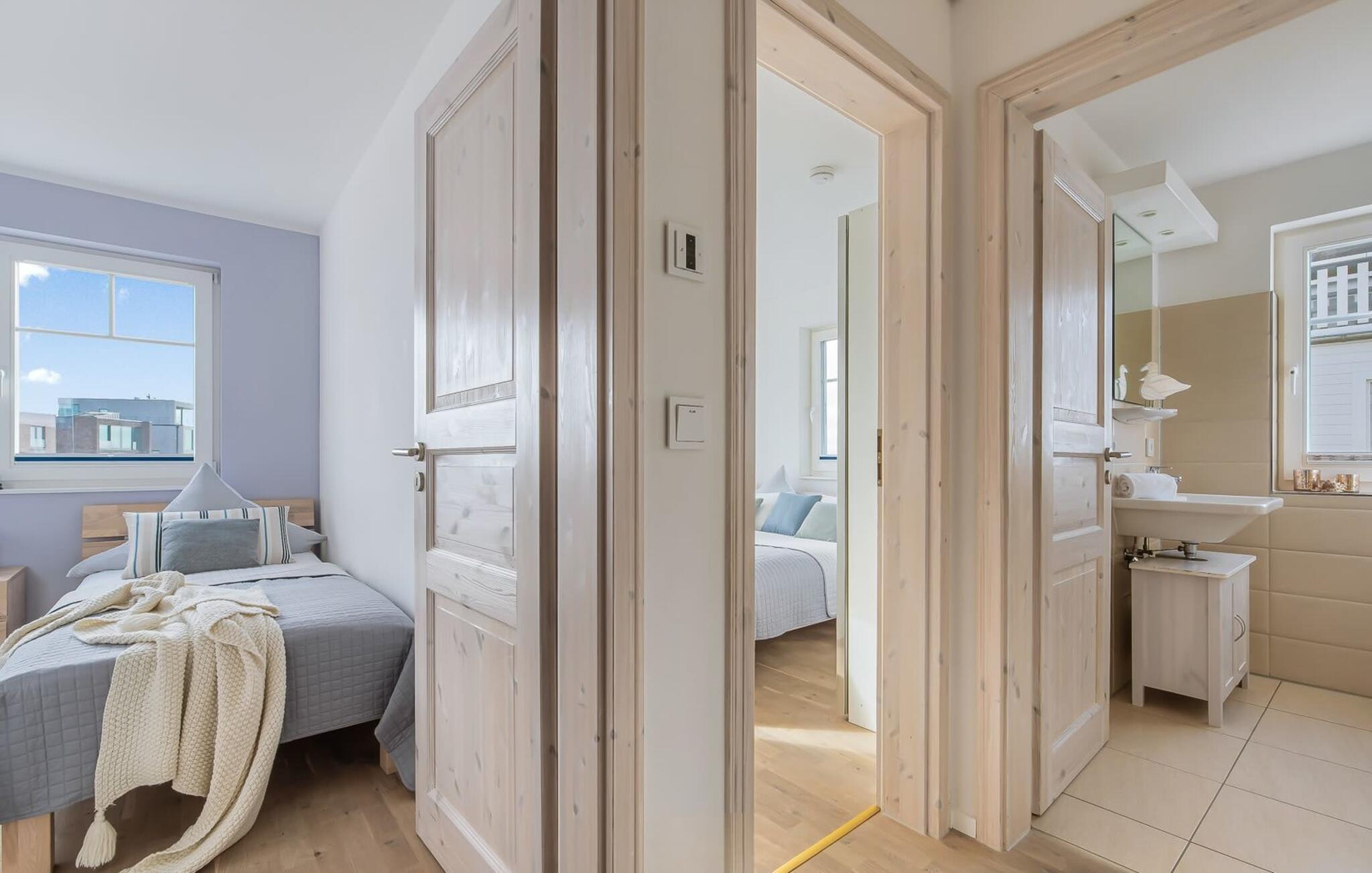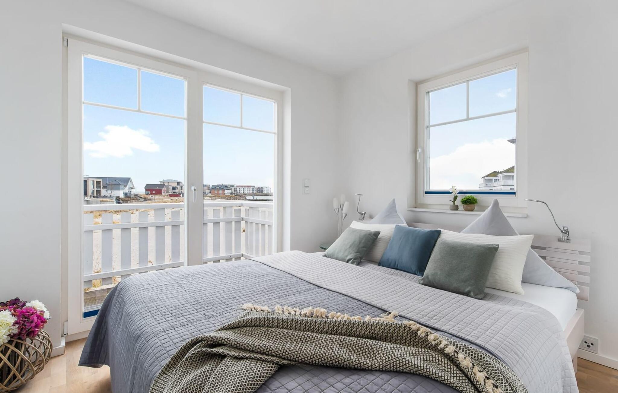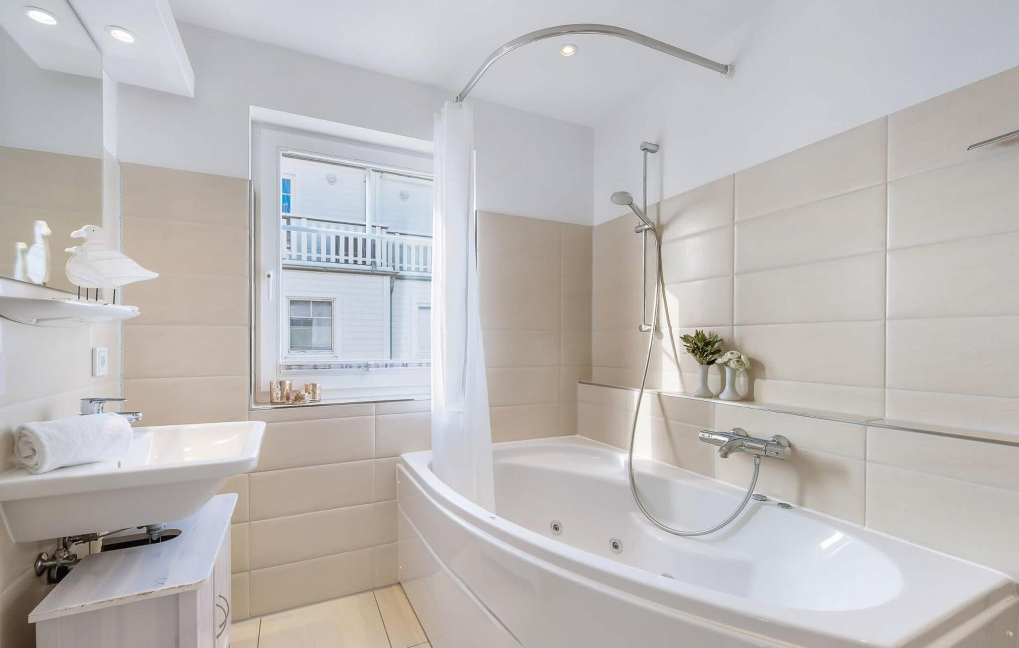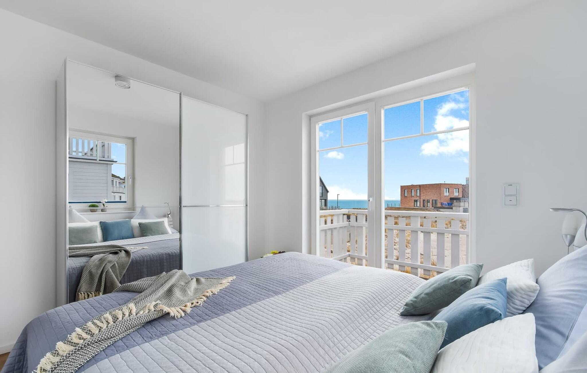 Im ersten Obergeschoss verheißen ein Doppelschlafzimmer mit Balkon und ein Schlafzimmer mit zwei Einzelbetten bei Ausblick auf Strand und Meer entspannte Ruhe und angenehme Träume. Das Vollbad mit Whirlpool-Badewanne und Dusche trägt seinen wohltuenden Anteil dazu bei.