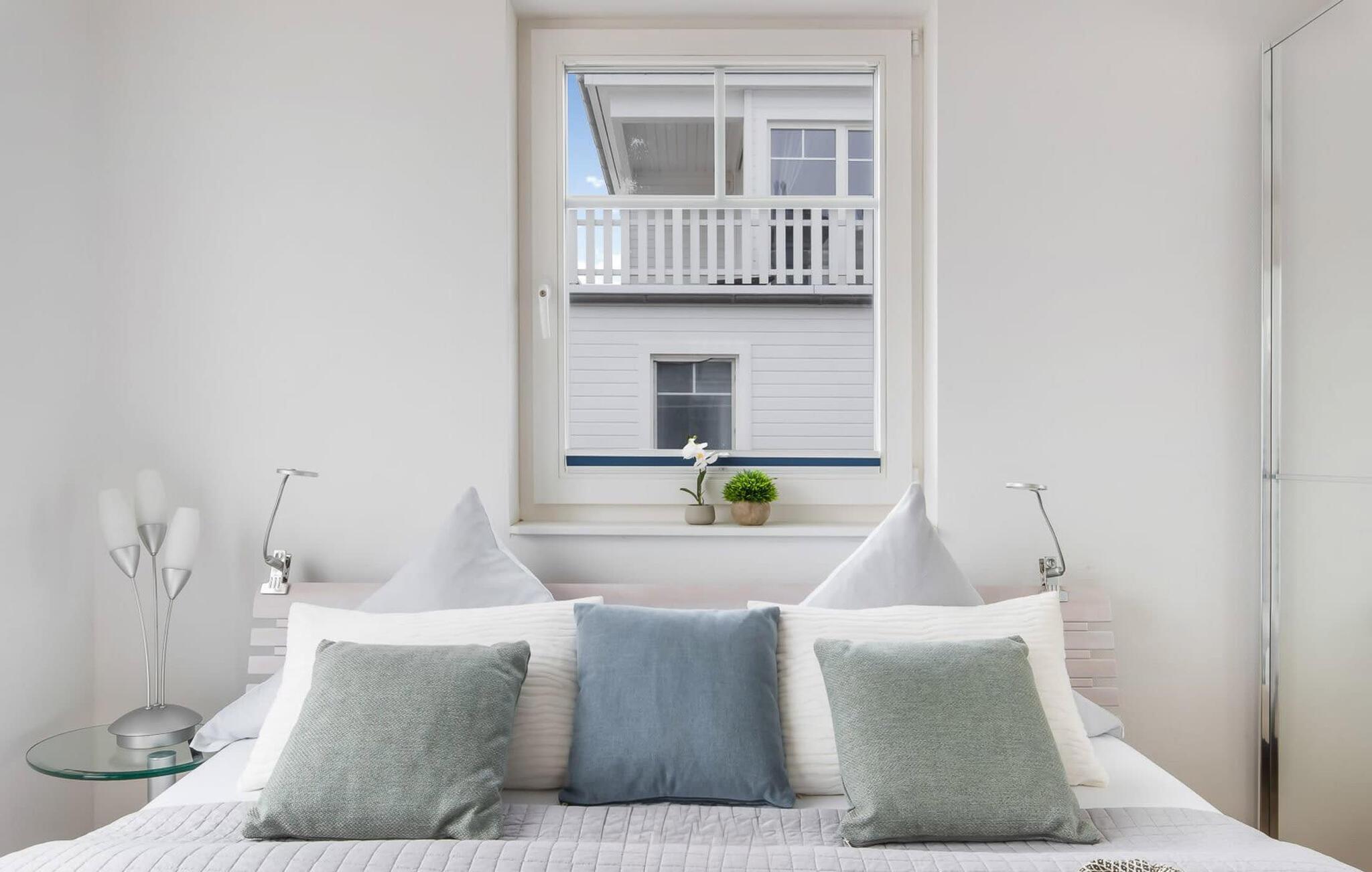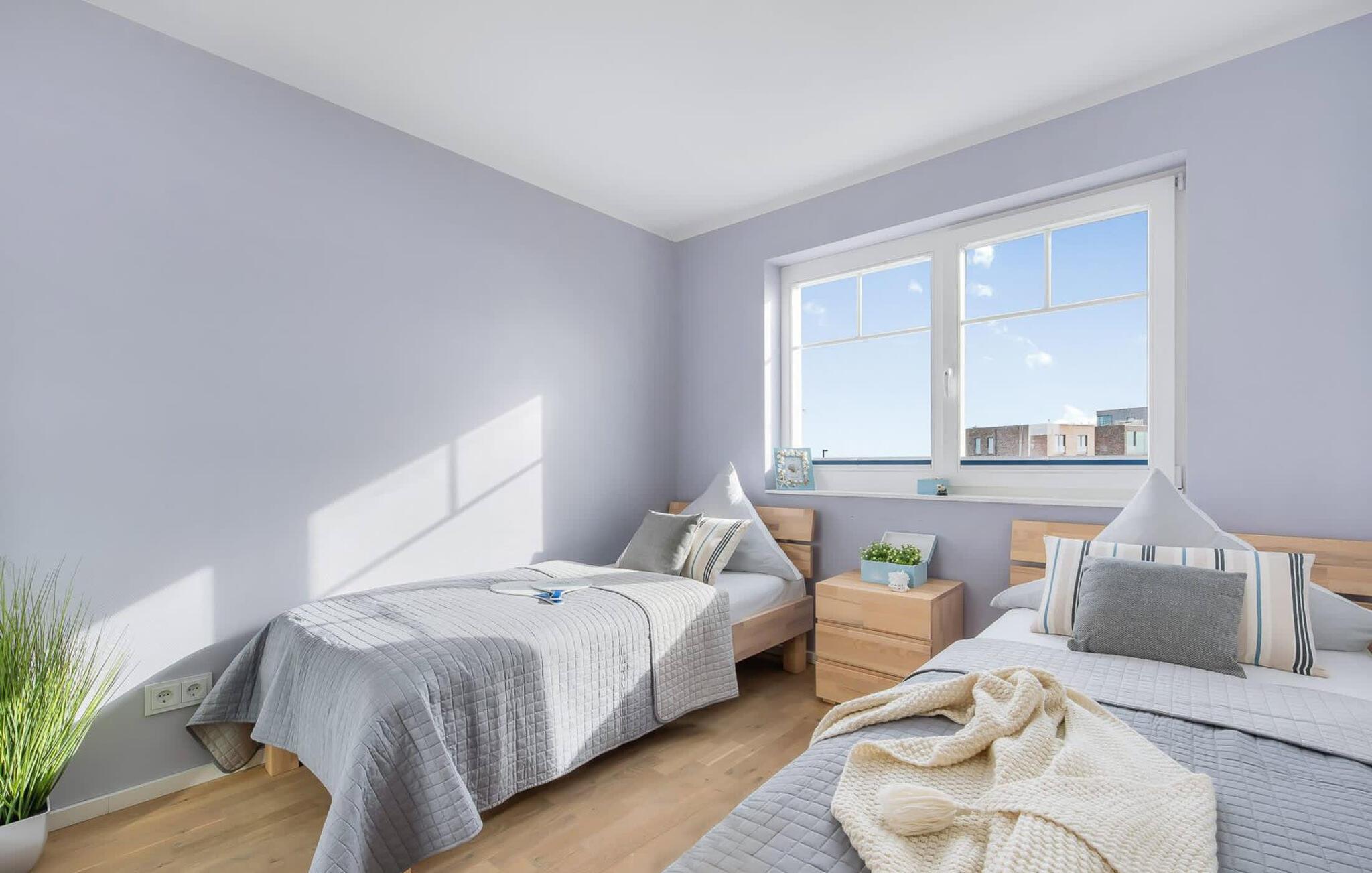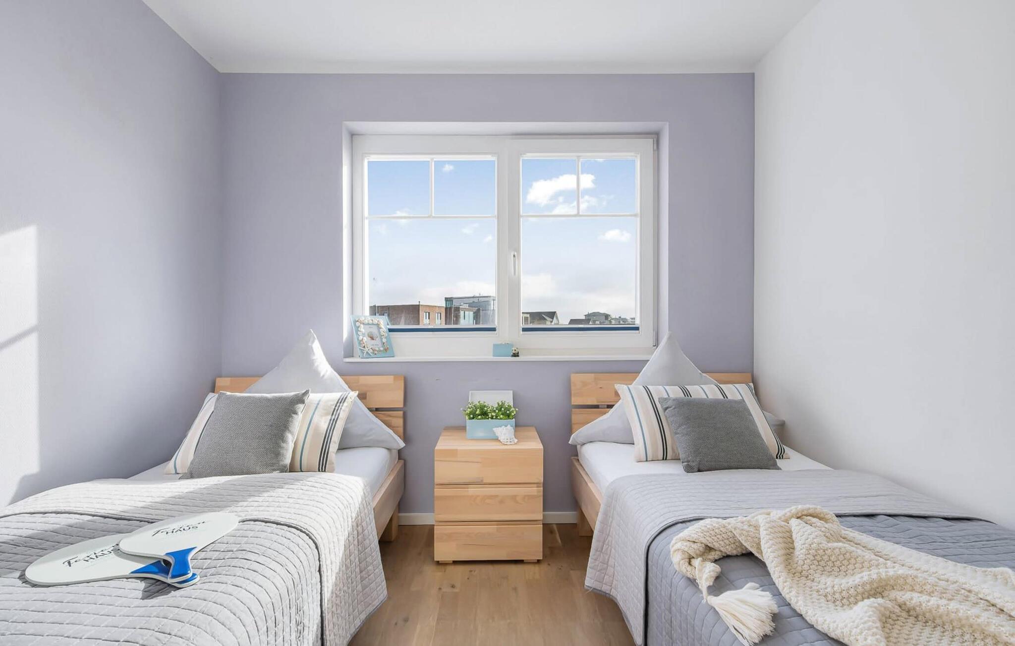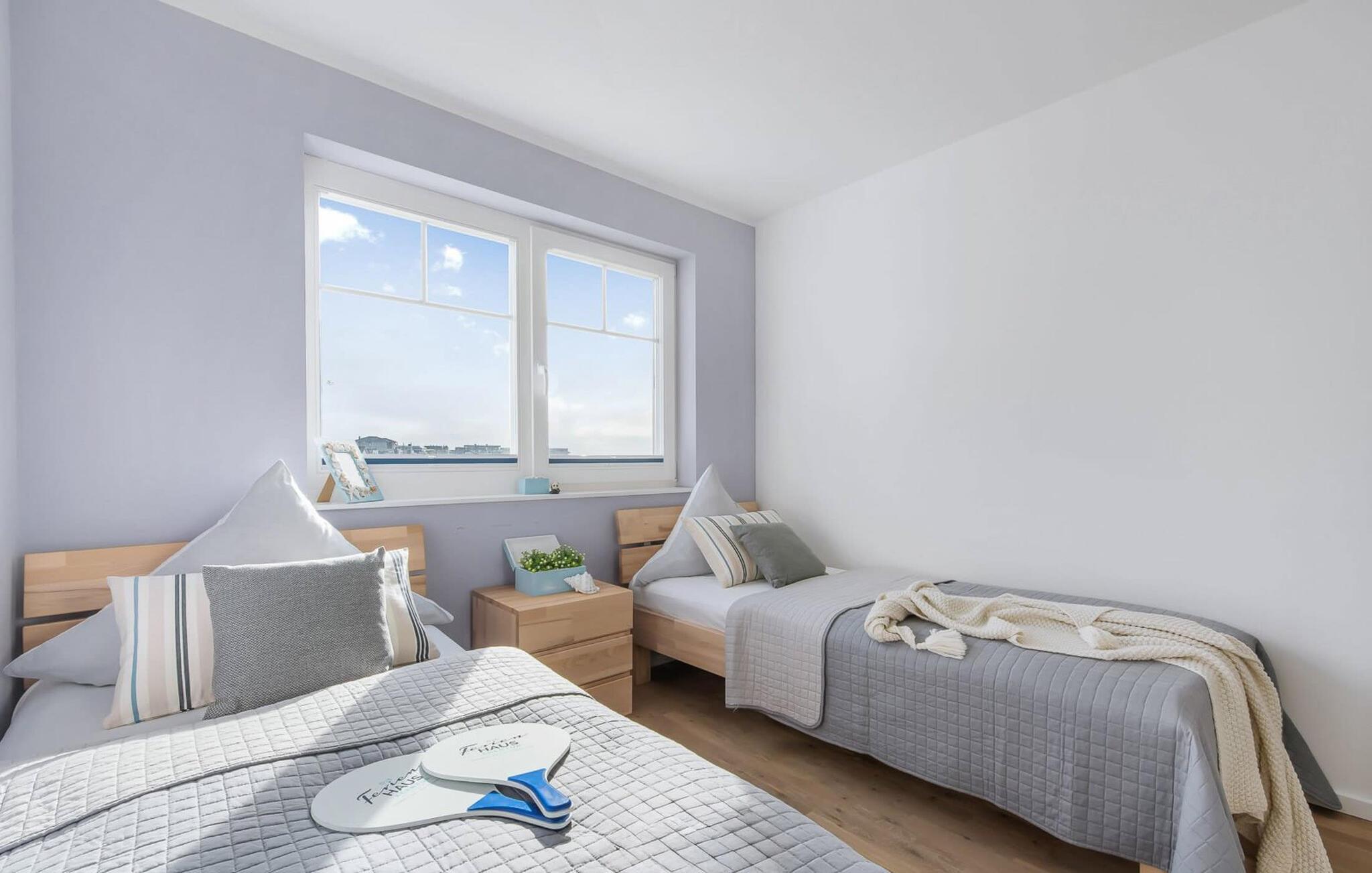 Im ersten Obergeschoss verheißen ein Doppelschlafzimmer mit Balkon und ein Schlafzimmer mit zwei Einzelbetten bei Ausblick auf Strand und Meer entspannte Ruhe und angenehme Träume. Das Vollbad mit Whirlpool-Badewanne und Dusche trägt seinen wohltuenden Anteil dazu bei.