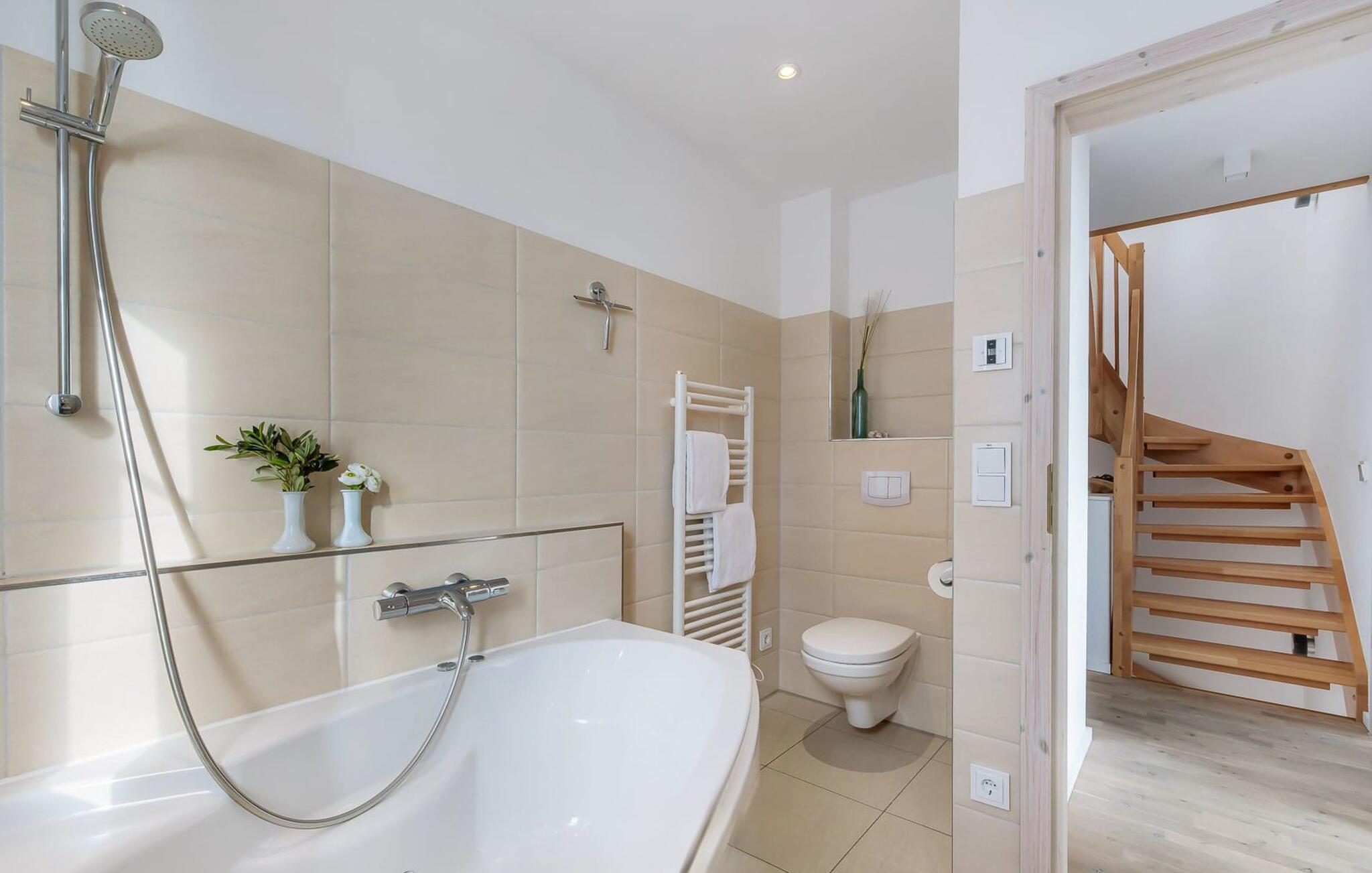 - WC mit warmem und kaltem Wasser, Dusche und Badewanne